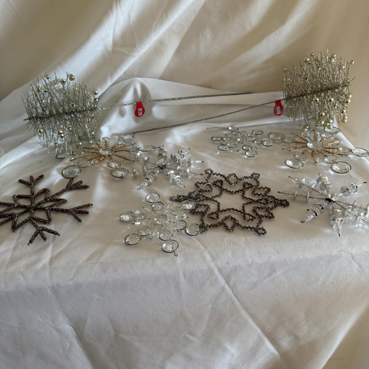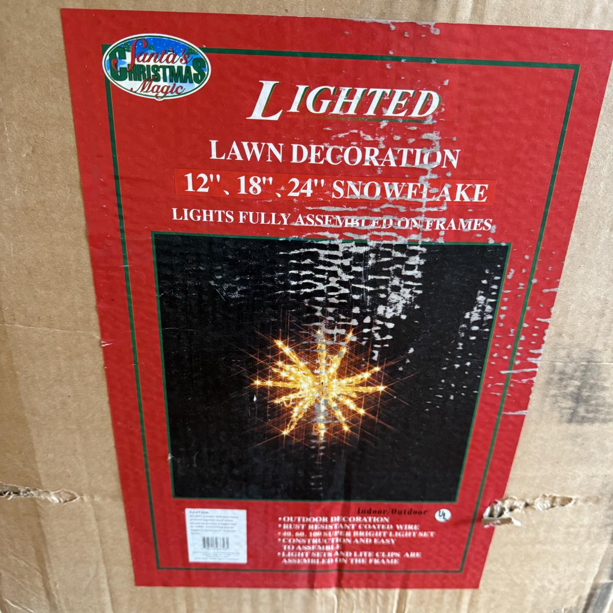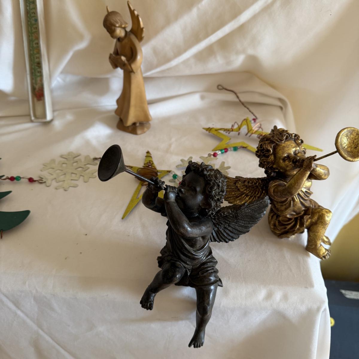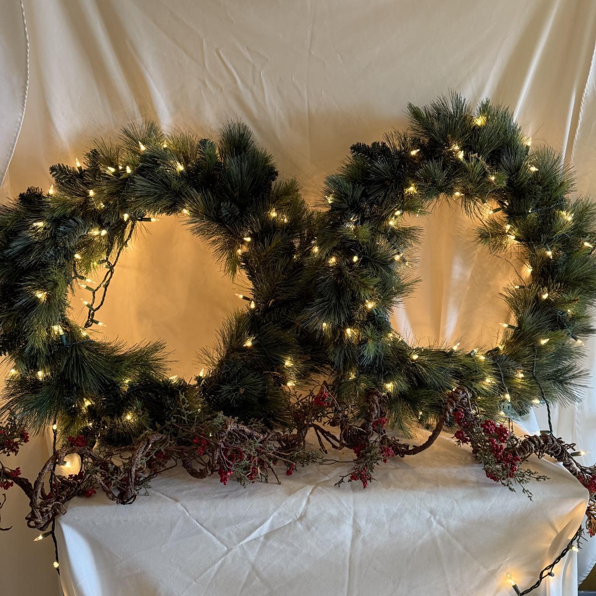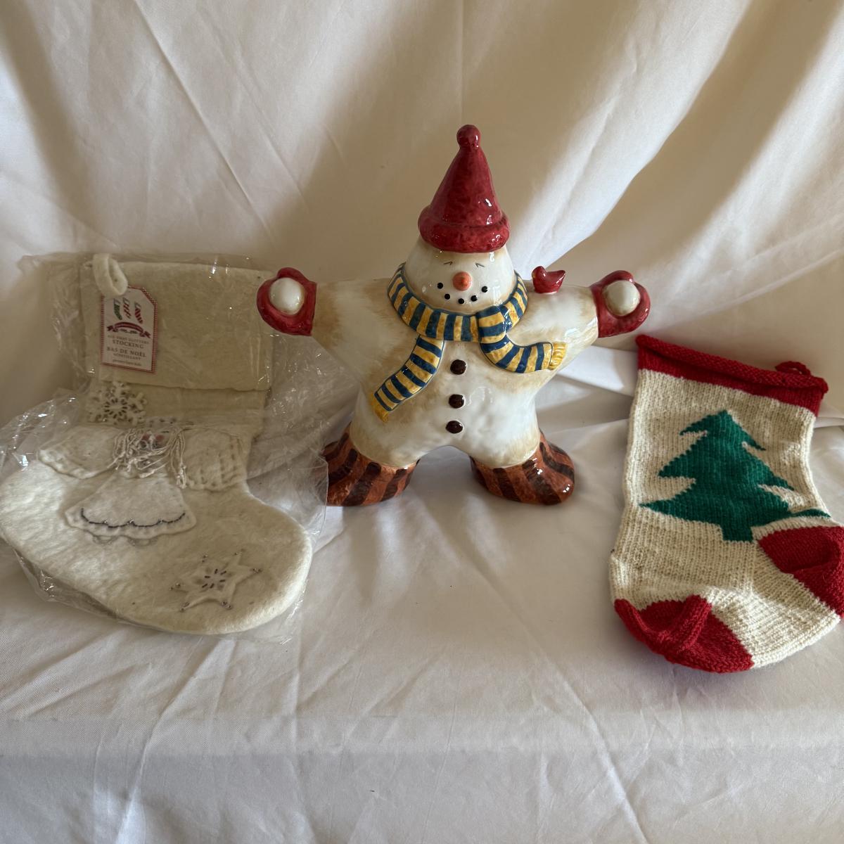 This lot is a Christmas dream!!! Everything in this lot powers on. There are over ten strings of lights all of which are white. Also included is some electric candle lights, some NIB lawn snowflake decorations that are 12”, 18”, and 24”. Next are two faux wreaths that both light up, both with 24”D. There are also two different table garlands. Both are plastic and one is a twisty branch style with holly and the other looks like pine and holly this one is 72”. Moving on, we have a little wooden nativity scene, a ceramic snowman cookie jar, some metal and bead snowflakes, a nut cracker that stands 10”H, two stockings, a metal snowman candle holder, a Christmas book, some beaded berry looking garland, a Christmas tree stand that measures 14” x 14”, a little wicker slay, some little wooden angels and finally some little trumpet cherubs! The little trumpet cherubs are about 8”H. Local pick up only.