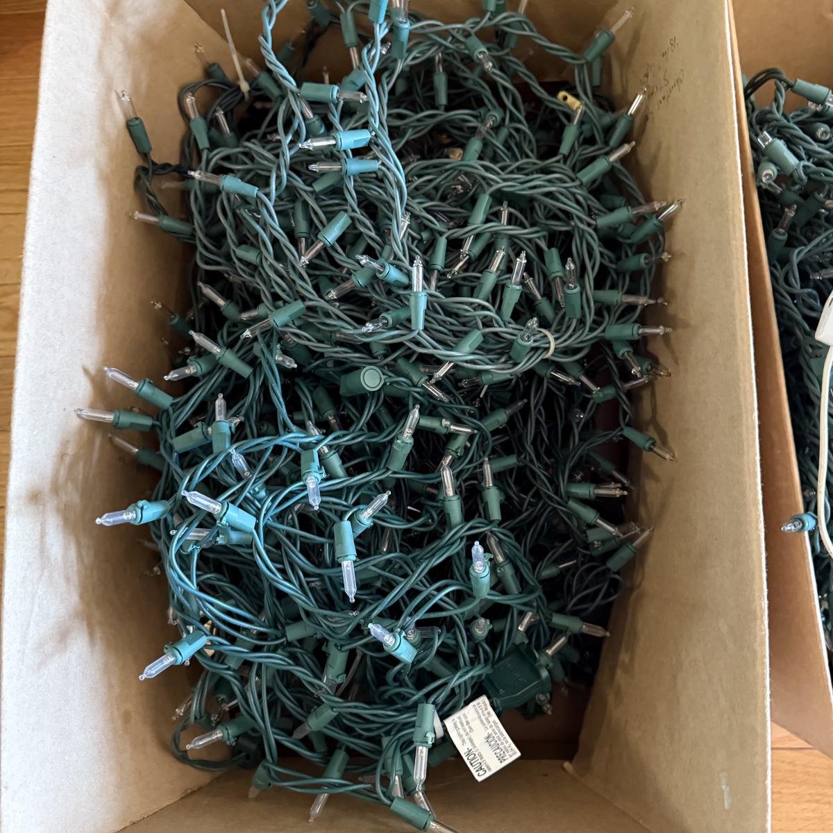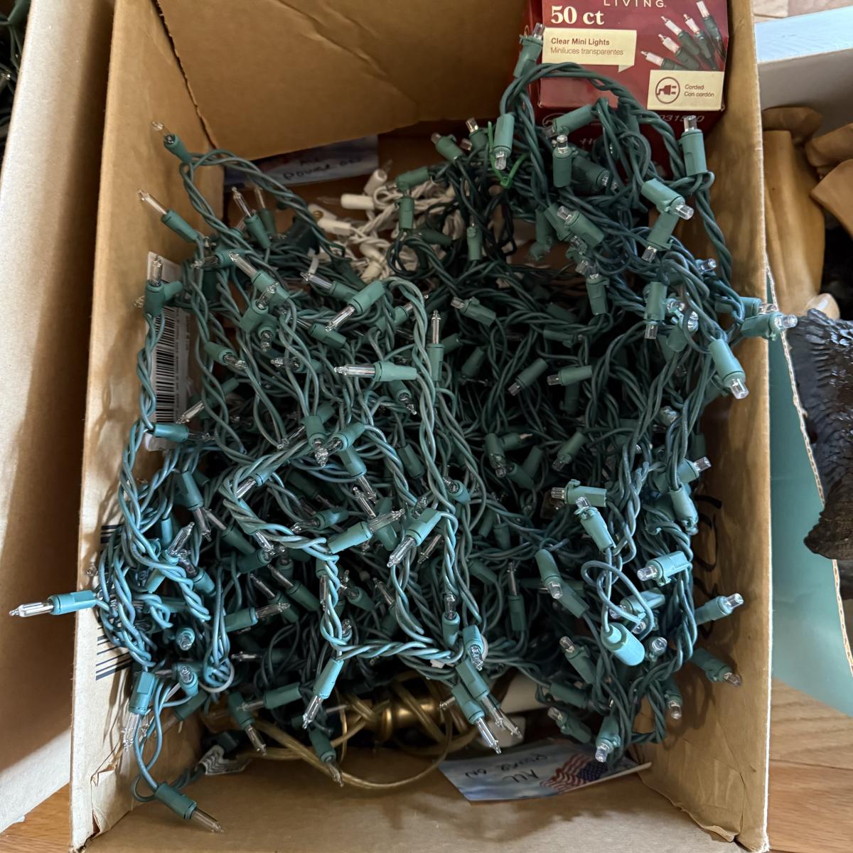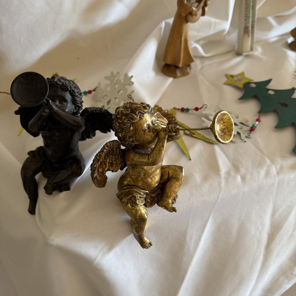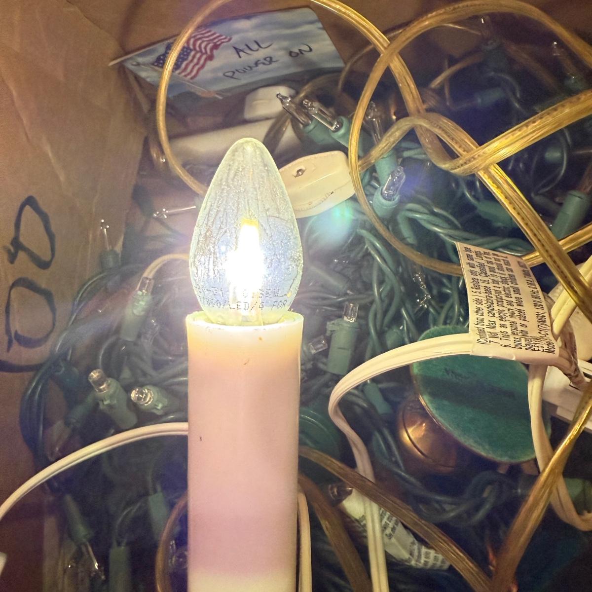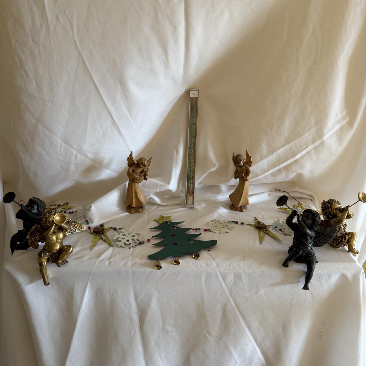This lot is a Christmas dream!!! Everything in this lot powers on. There are over ten strings of lights all of which are white. Also included is some electric candle lights, some NIB lawn snowflake decorations that are 12”, 18”, and 24”. Next are two faux wreaths that both light up, both with 24”D. There are also two different table garlands. Both are plastic and one is a twisty branch style with holly and the other looks like pine and holly this one is 72”. Moving on, we have a little wooden nativity scene, a ceramic snowman cookie jar, some metal and bead snowflakes, a nut cracker that stands 10”H, two stockings, a metal snowman candle holder, a Christmas book, some beaded berry looking garland, a Christmas tree stand that measures 14” x 14”, a little wicker slay, some little wooden angels and finally some little trumpet cherubs! The little trumpet cherubs are about 8”H. Local pick up only.