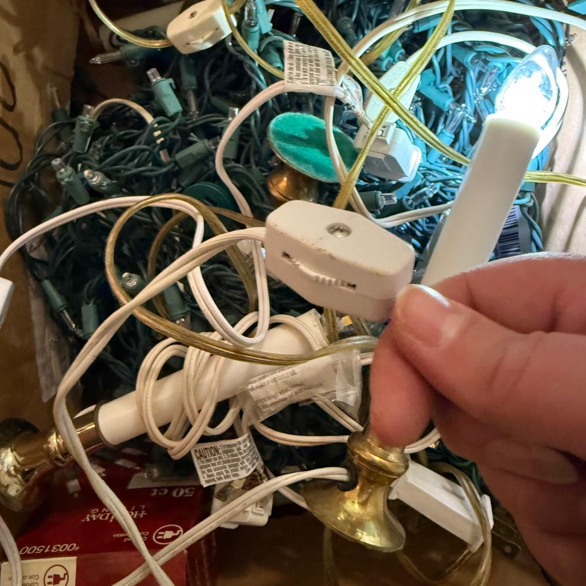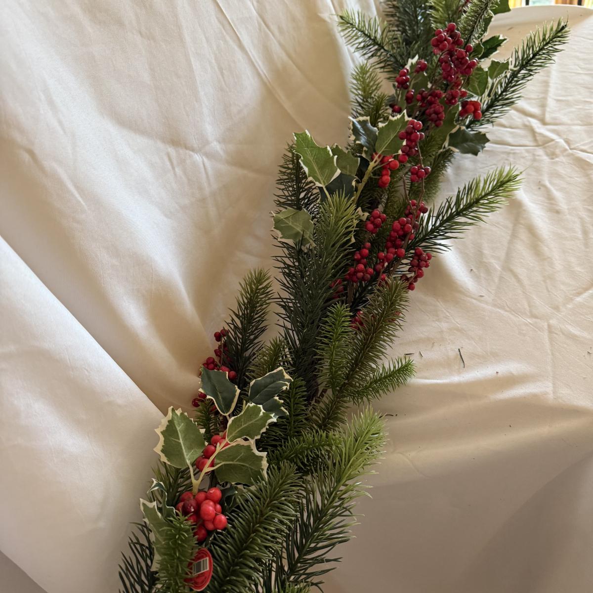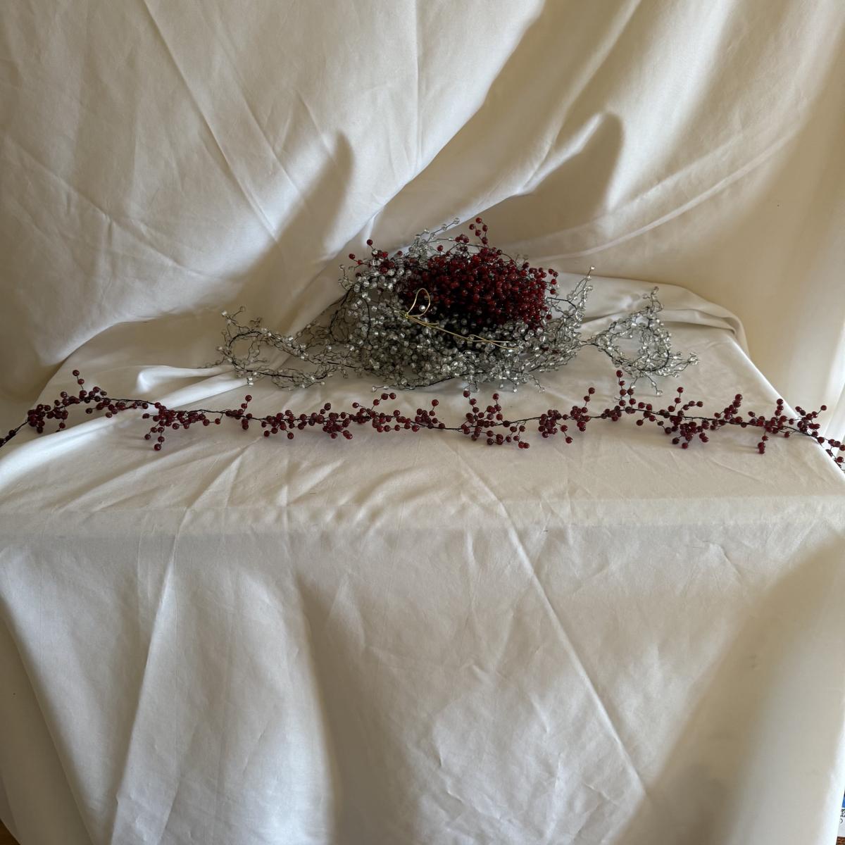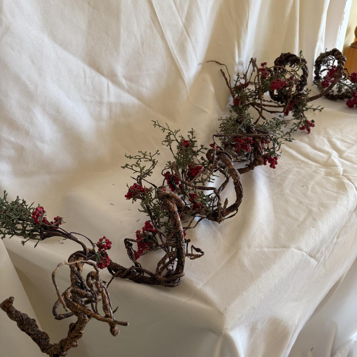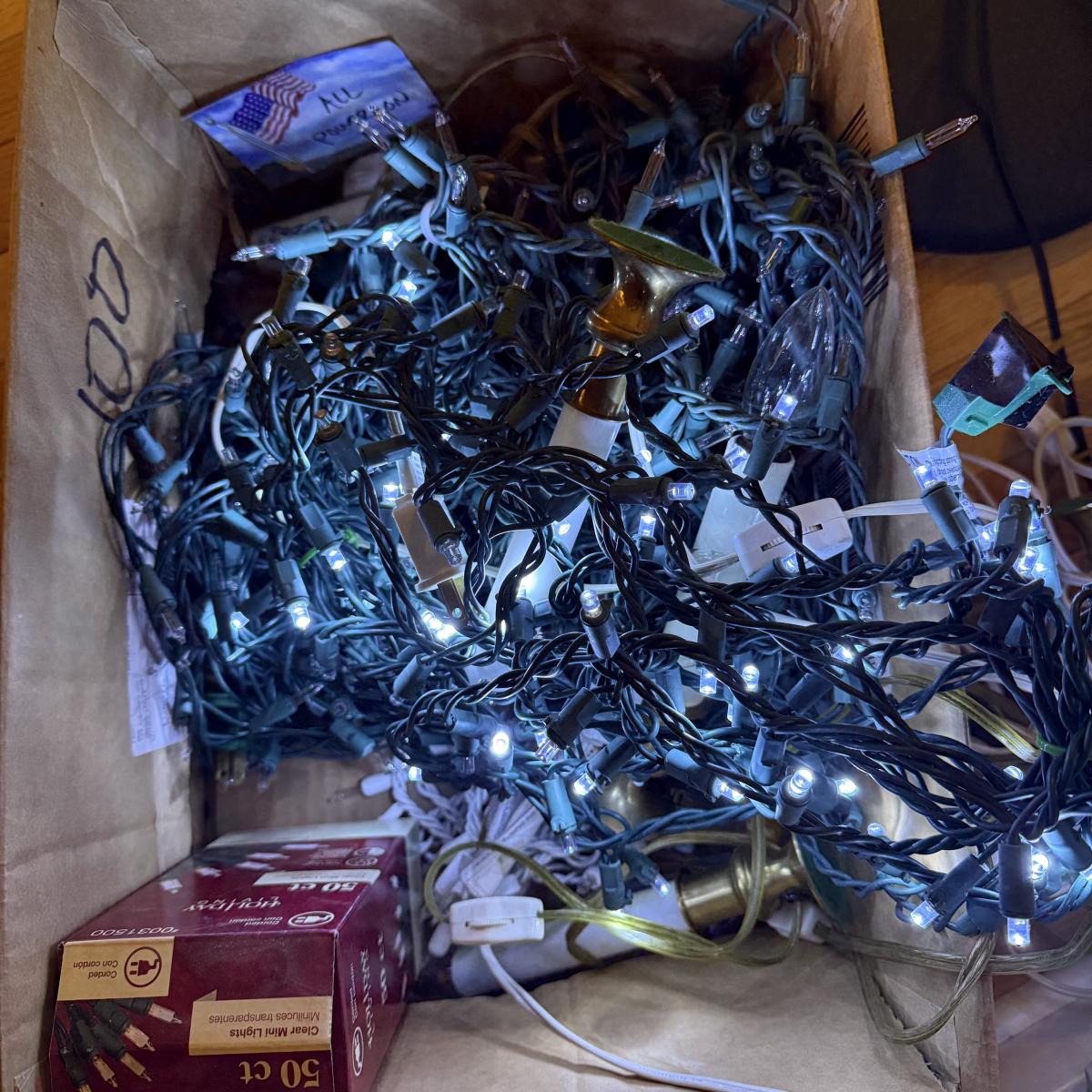 This lot is a Christmas dream!!! Everything in this lot powers on. There are over ten strings of lights all of which are white. Also included is some electric candle lights, some NIB lawn snowflake decorations that are 12”, 18”, and 24”. Next are two faux wreaths that both light up, both with 24”D. There are also two different table garlands. Both are plastic and one is a twisty branch style with holly and the other looks like pine and holly this one is 72”. Moving on, we have a little wooden nativity scene, a ceramic snowman cookie jar, some metal and bead snowflakes, a nut cracker that stands 10”H, two stockings, a metal snowman candle holder, a Christmas book, some beaded berry looking garland, a Christmas tree stand that measures 14” x 14”, a little wicker slay, some little wooden angels and finally some little trumpet cherubs! The little trumpet cherubs are about 8”H. Local pick up only.