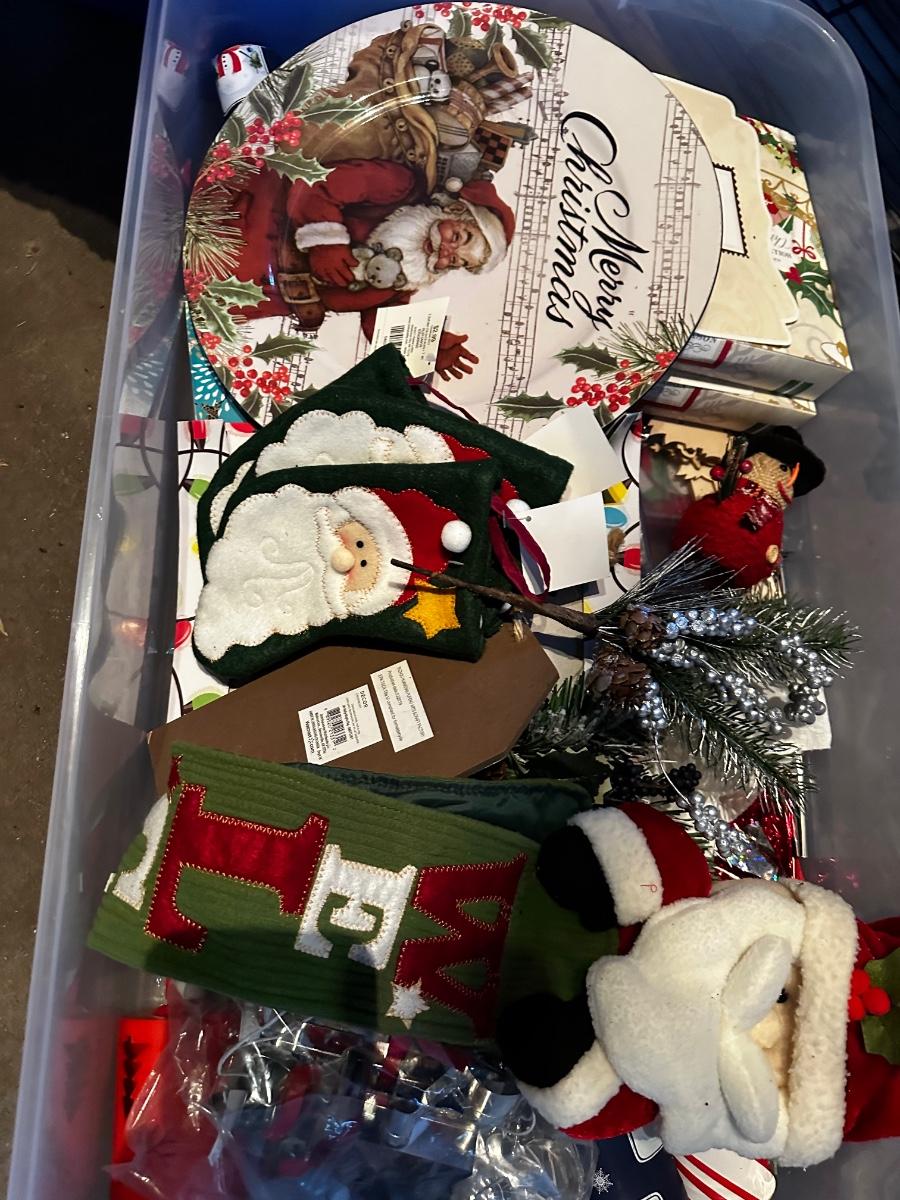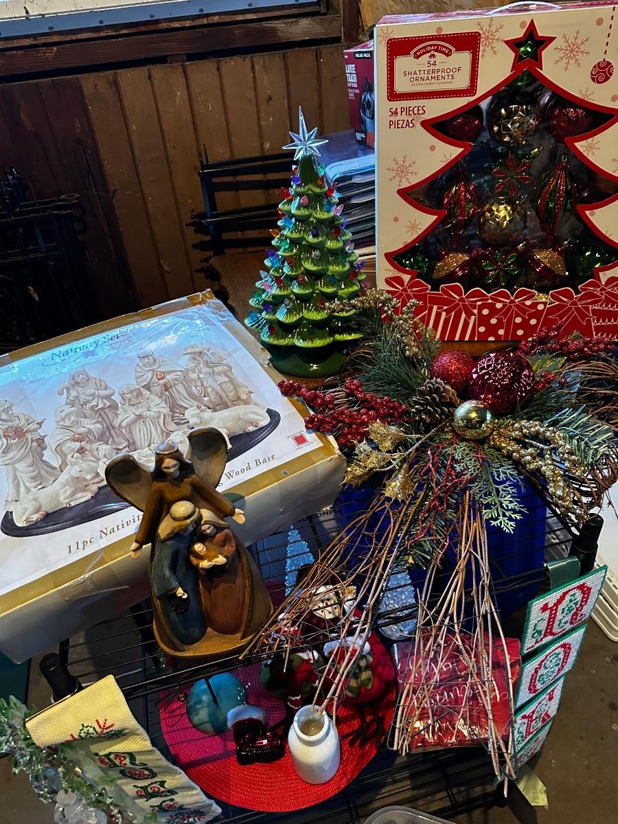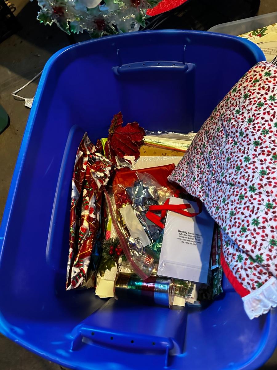 Miscellaneous Christmas items, decorations and wrapping paper.