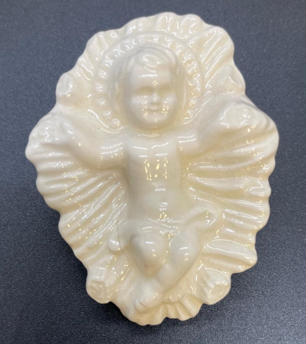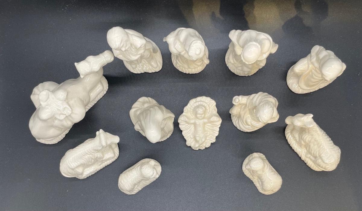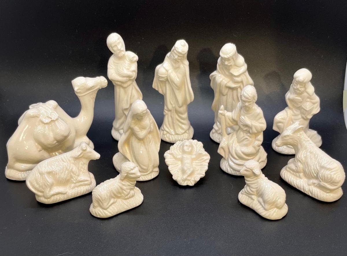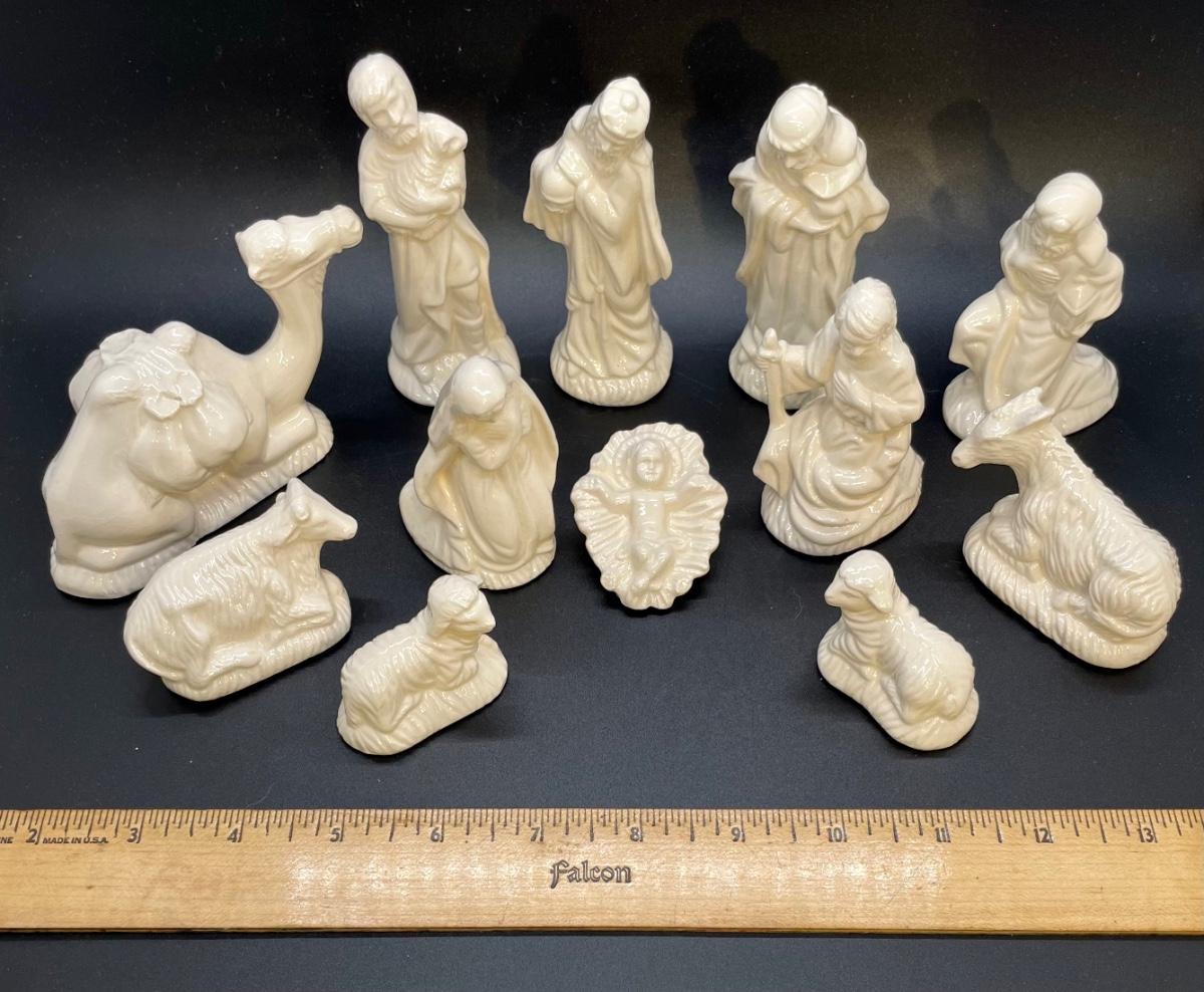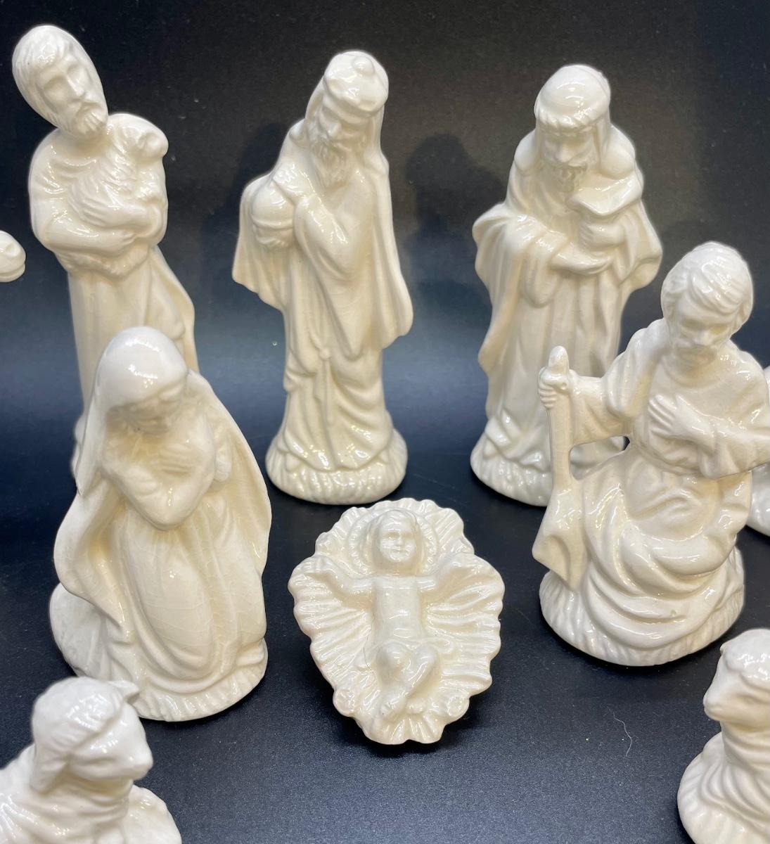 12-piece ceramic nativity set. All pieces are an off-white color.