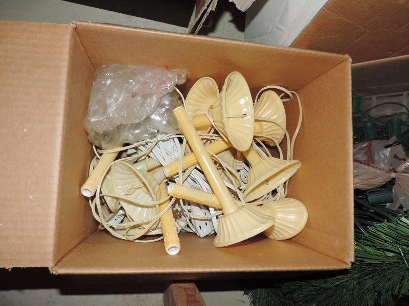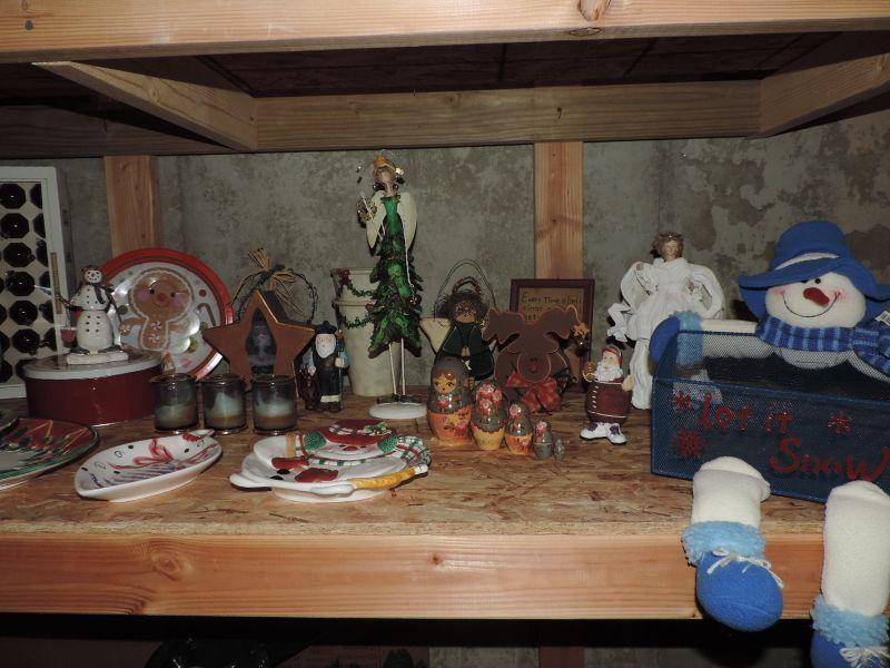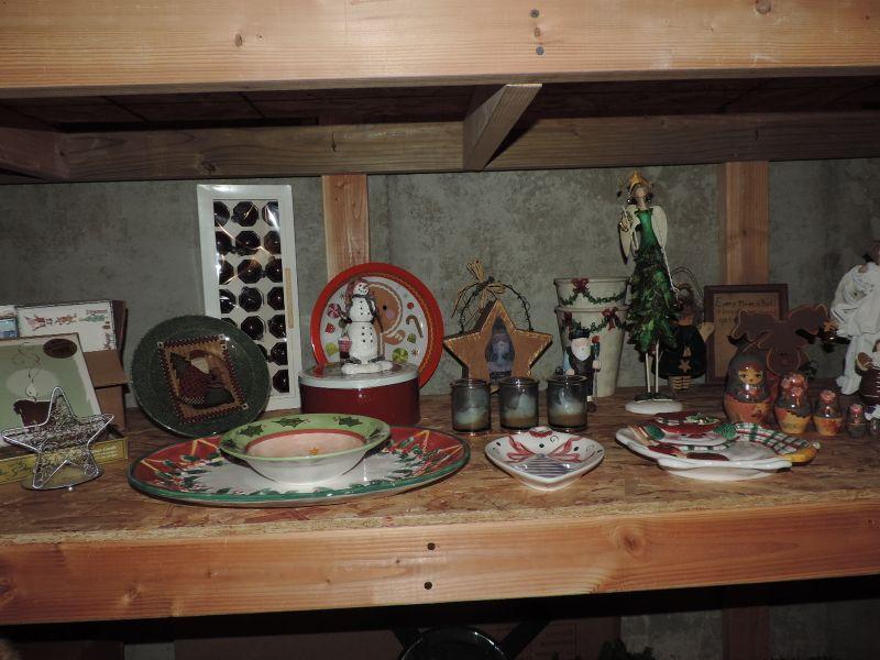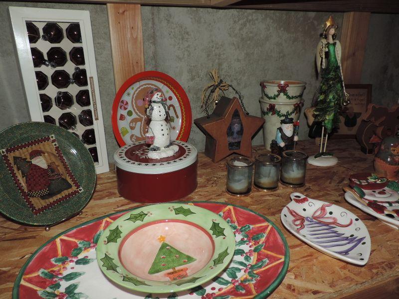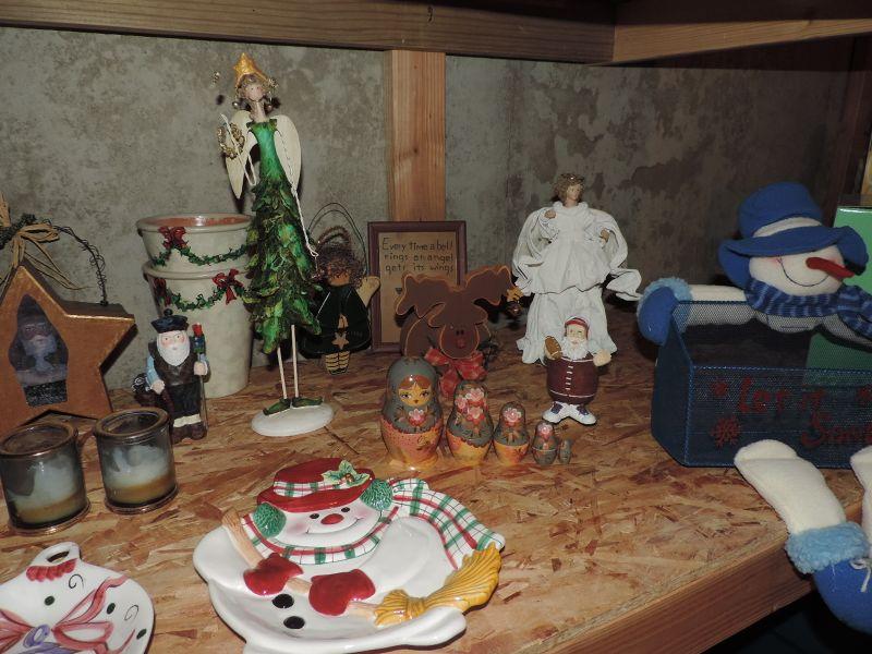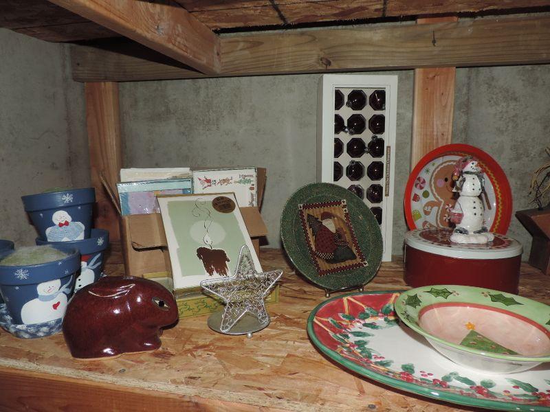 BOX OF WINDOW ELECTRIC CANDLES, CERAMIC CANDY DISHES, CHRISTMAS CARDS & ENVELOPES, SNOWMAN HOLDING WIRE BASKET, HOLIDAY NESTING DOLL, SMALL TABLE DECOR, AND MORE