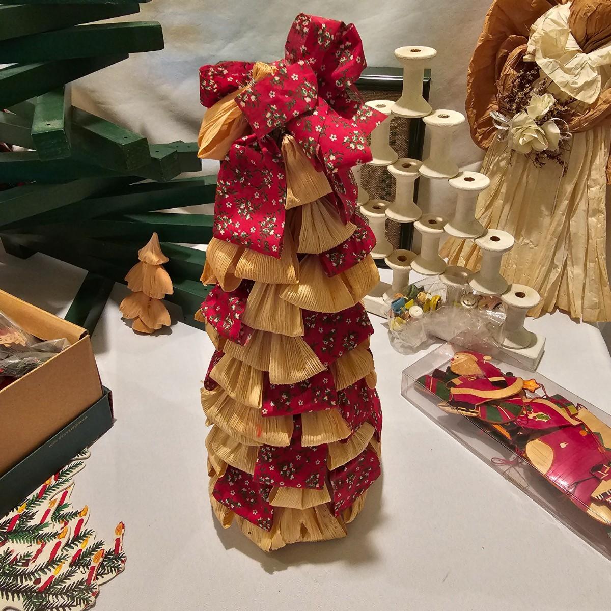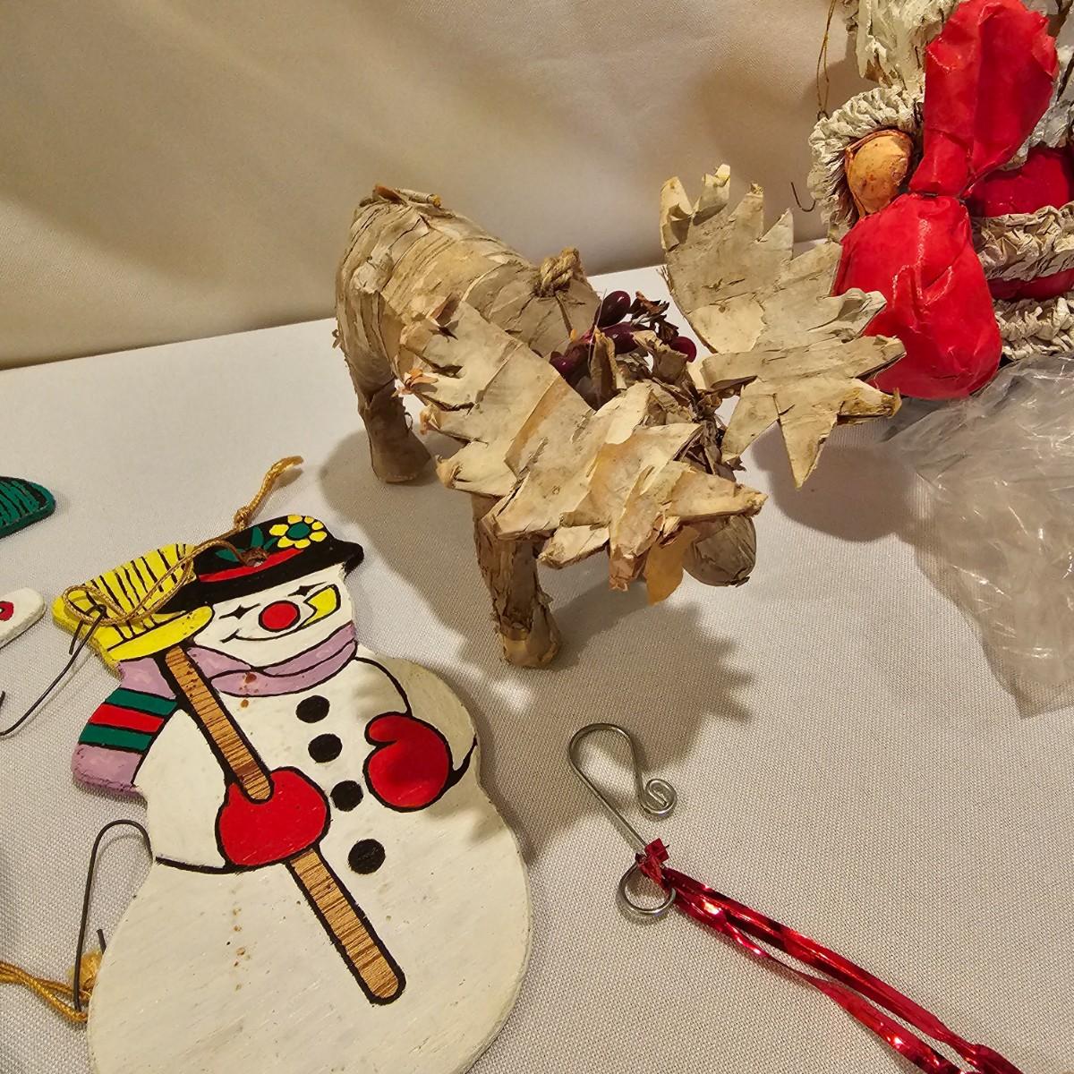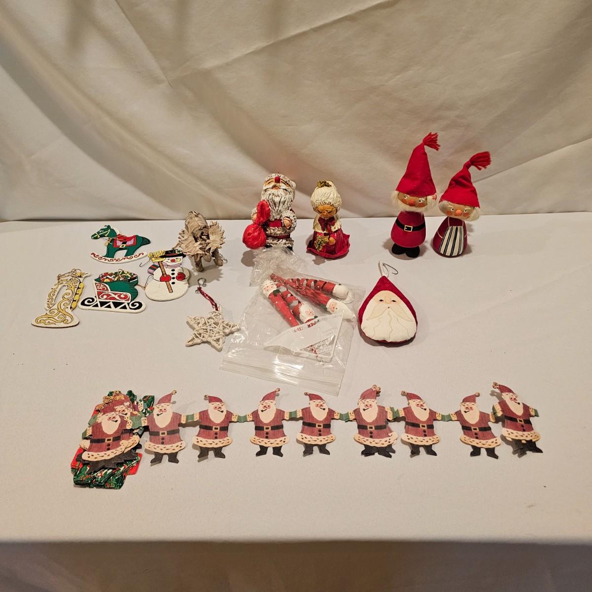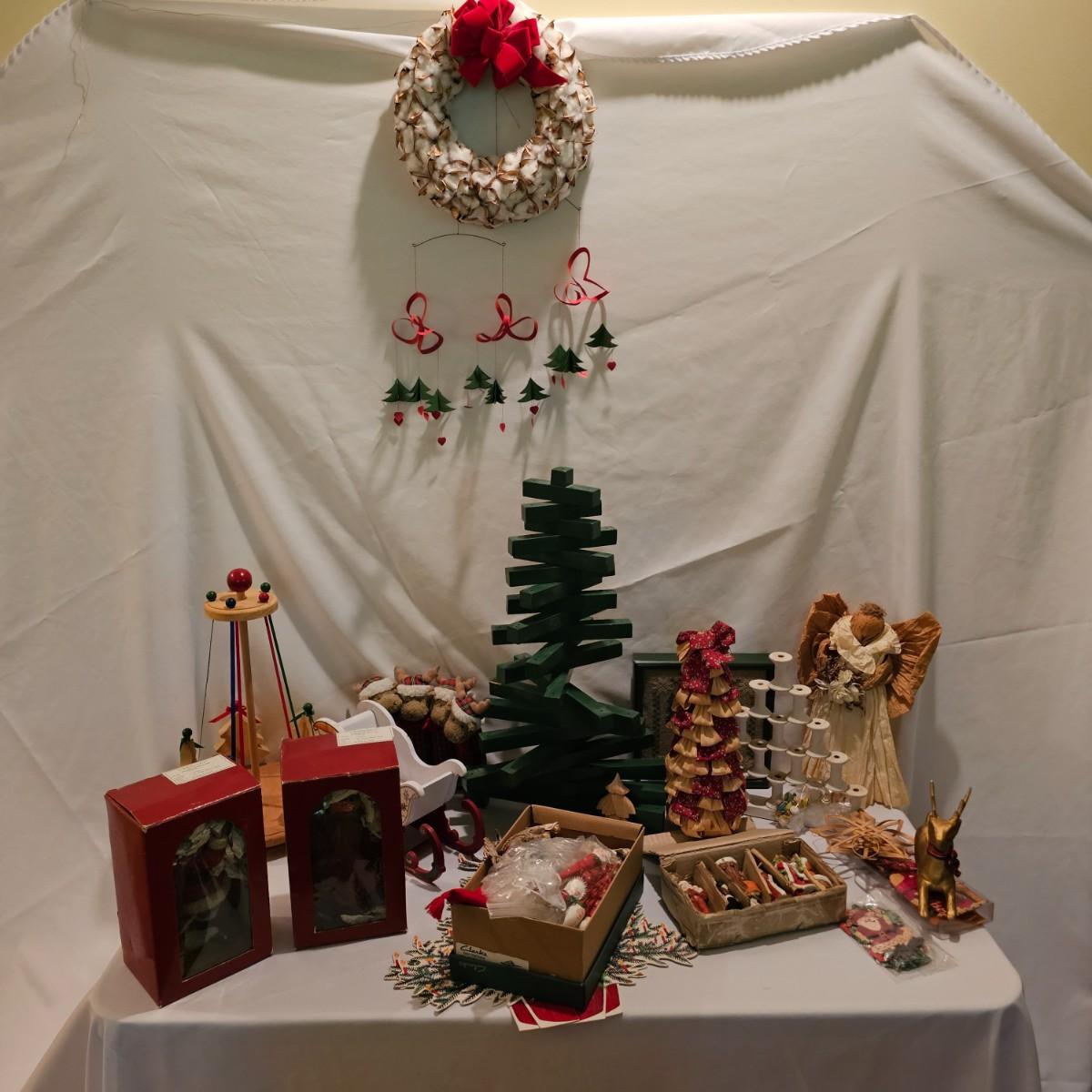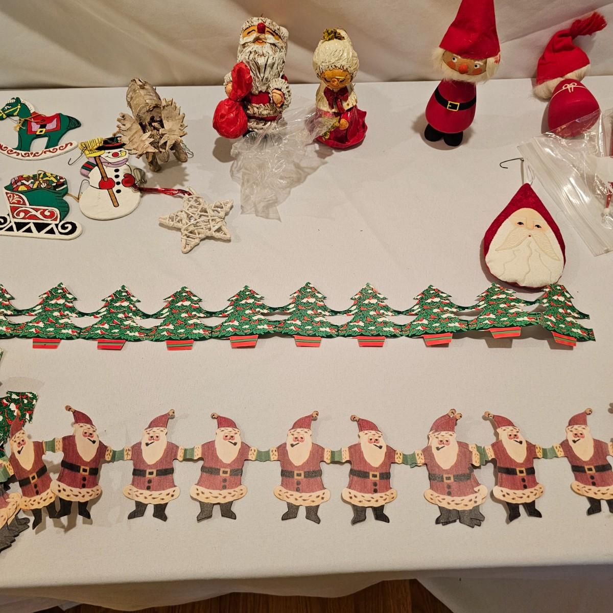 Fun and wonderful decorations from Christmas past. Cornhusk angel and tree, spool tree, wooden sleigh, fold up tree to hold lollipops, 14" x 25"H. Two 10"H paper mache Santas, a twirling tree with ribbons, 10" x 17"H. Needlepoint picture 10"sq x 2" deep. A tree and ribbon mobile and a 12"D wreath made from cotton and husks. Other assorted table-sitter items, see photos for details. Shipping available.