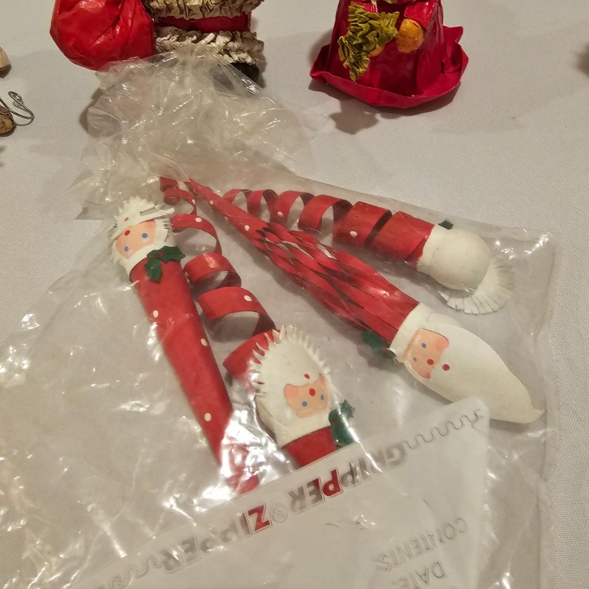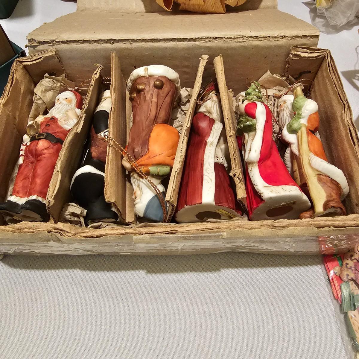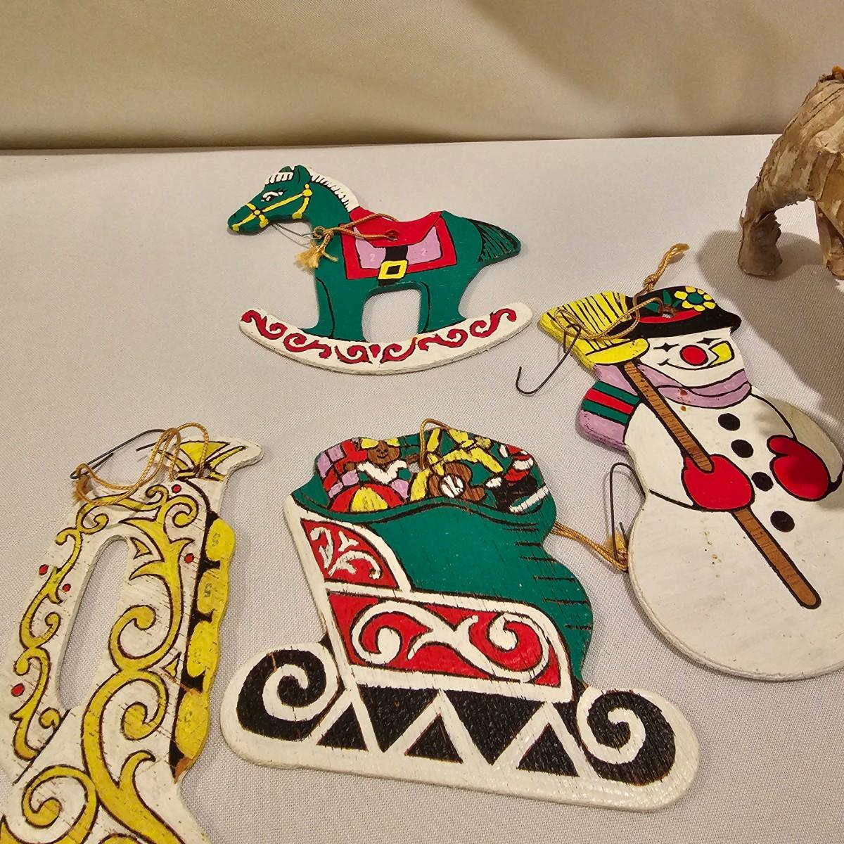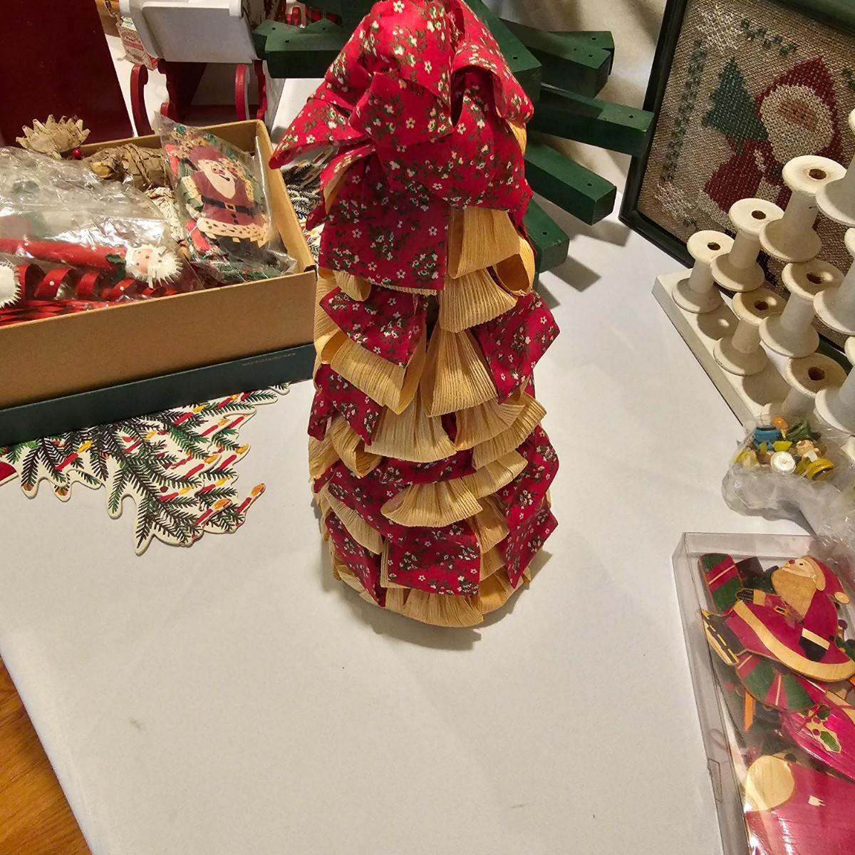 Fun and wonderful decorations from Christmas past. Cornhusk angel and tree, spool tree, wooden sleigh, fold up tree to hold lollipops, 14" x 25"H. Two 10"H paper mache Santas, a twirling tree with ribbons, 10" x 17"H. Needlepoint picture 10"sq x 2" deep. A tree and ribbon mobile and a 12"D wreath made from cotton and husks. Other assorted table-sitter items, see photos for details. Shipping available.