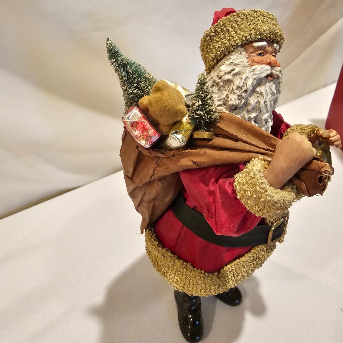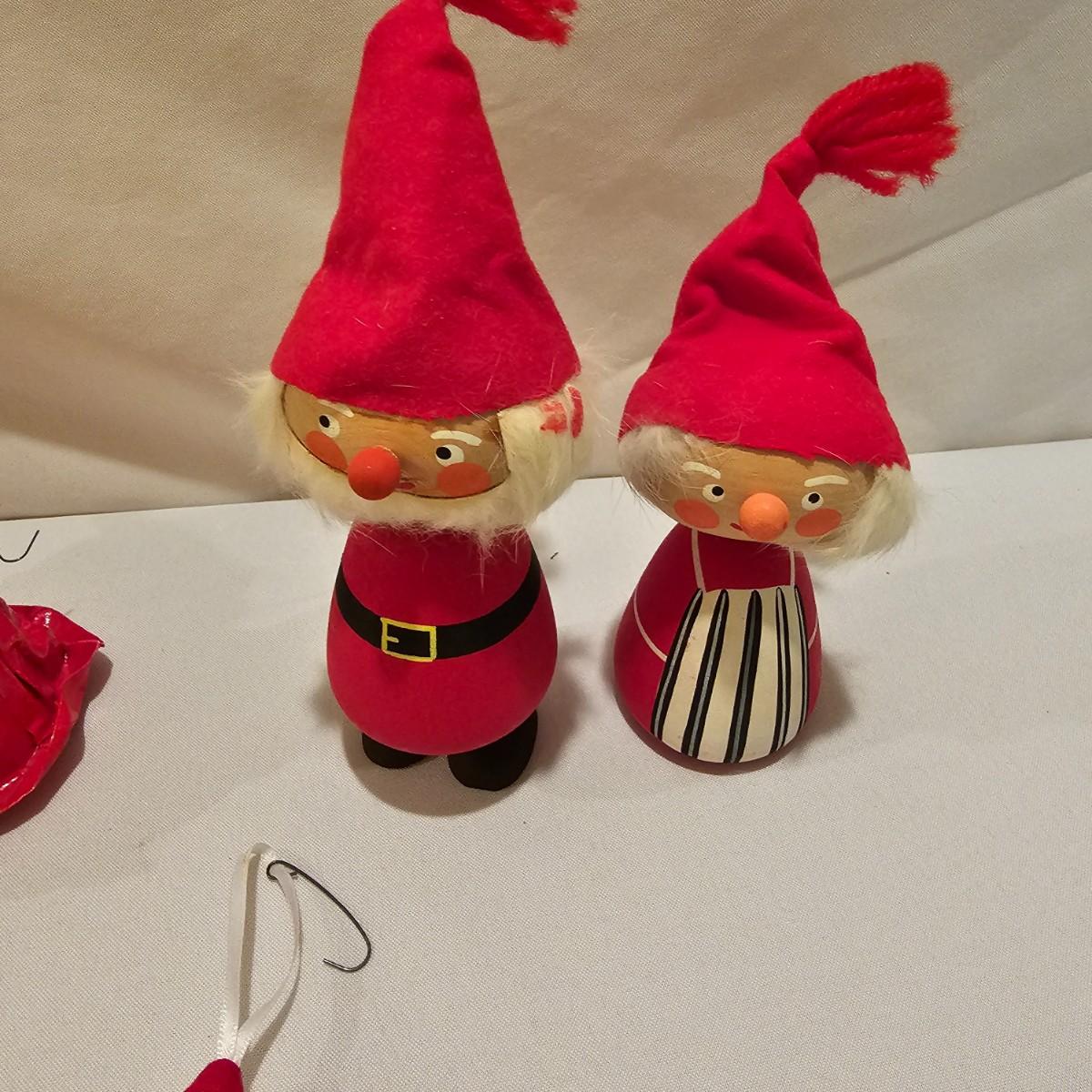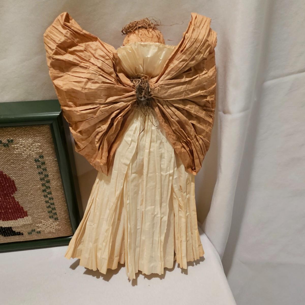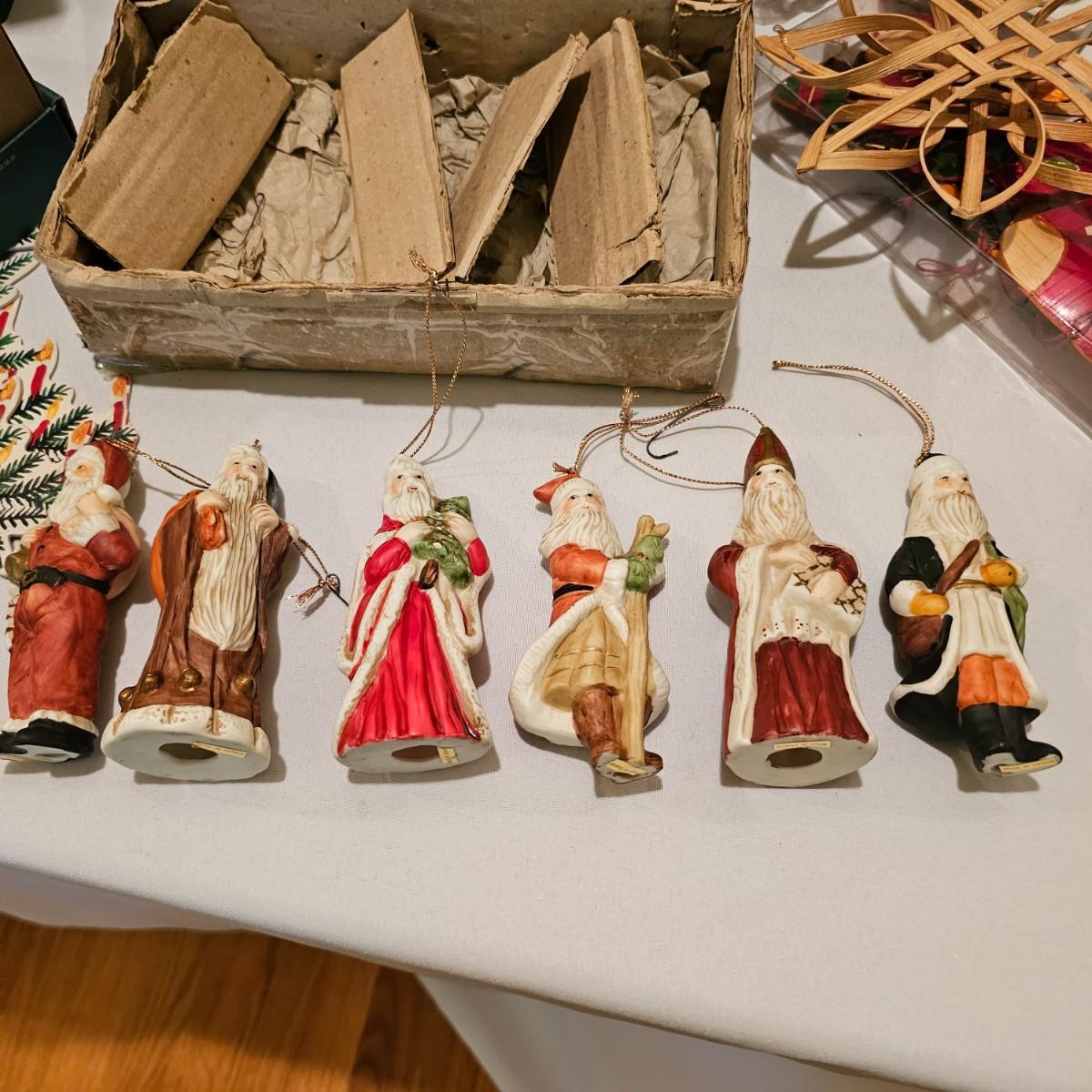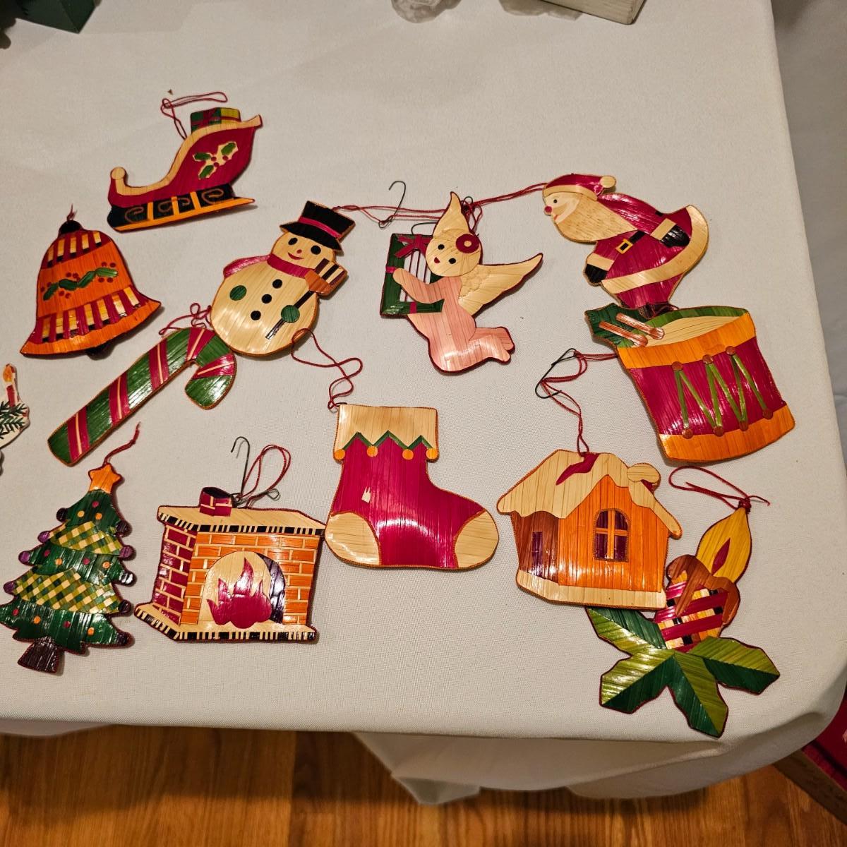 Fun and wonderful decorations from Christmas past. Cornhusk angel and tree, spool tree, wooden sleigh, fold up tree to hold lollipops, 14" x 25"H. Two 10"H paper mache Santas, a twirling tree with ribbons, 10" x 17"H. Needlepoint picture 10"sq x 2" deep. A tree and ribbon mobile and a 12"D wreath made from cotton and husks. Other assorted table-sitter items, see photos for details. Shipping available.