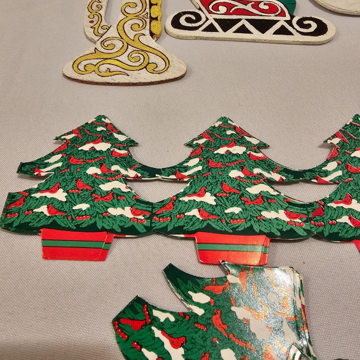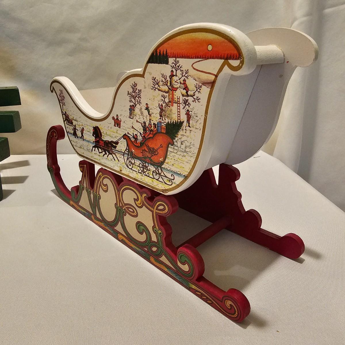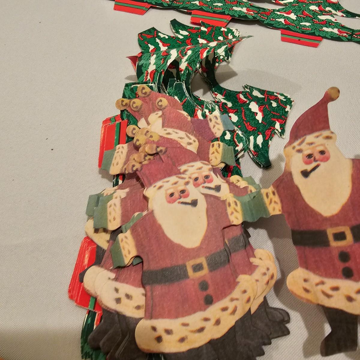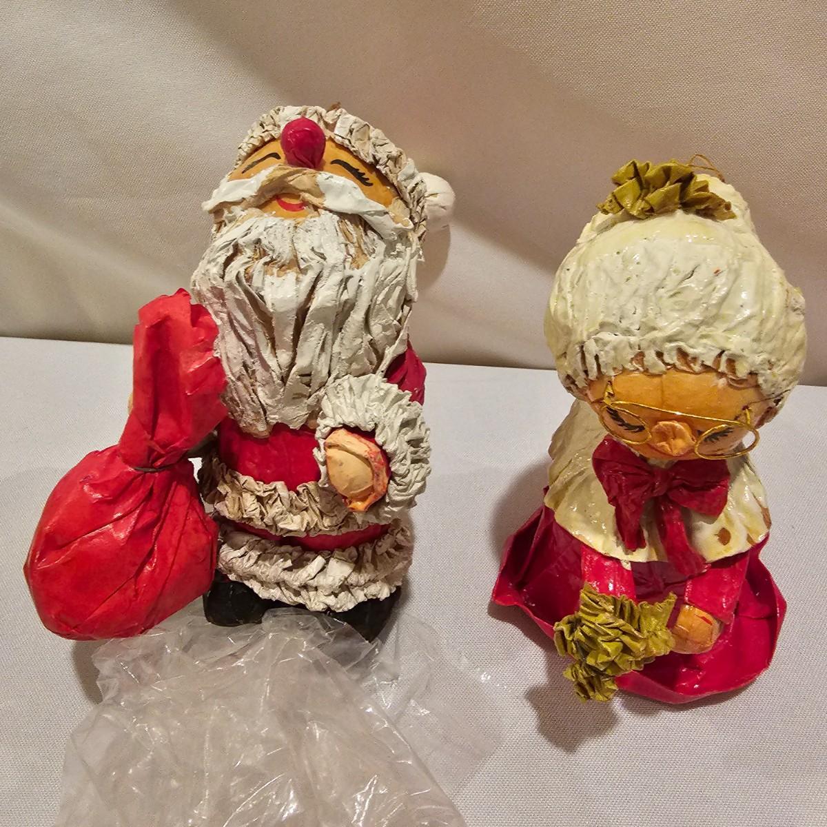 Fun and wonderful decorations from Christmas past. Cornhusk angel and tree, spool tree, wooden sleigh, fold up tree to hold lollipops, 14" x 25"H. Two 10"H paper mache Santas, a twirling tree with ribbons, 10" x 17"H. Needlepoint picture 10"sq x 2" deep. A tree and ribbon mobile and a 12"D wreath made from cotton and husks. Other assorted table-sitter items, see photos for details. Shipping available.