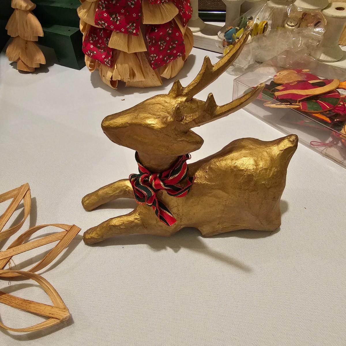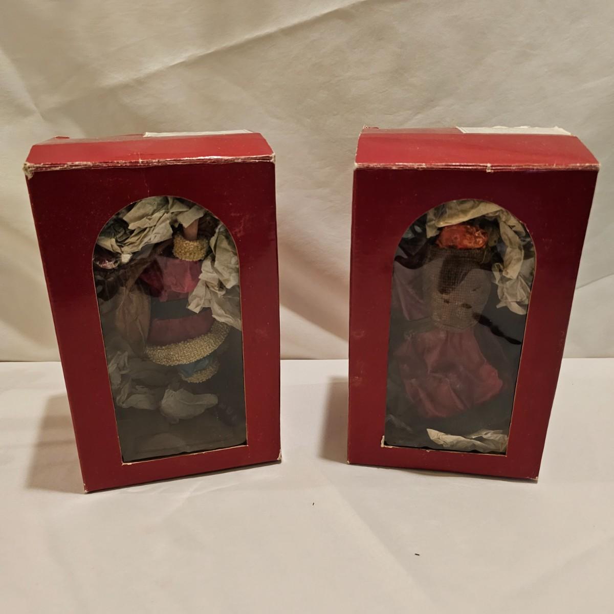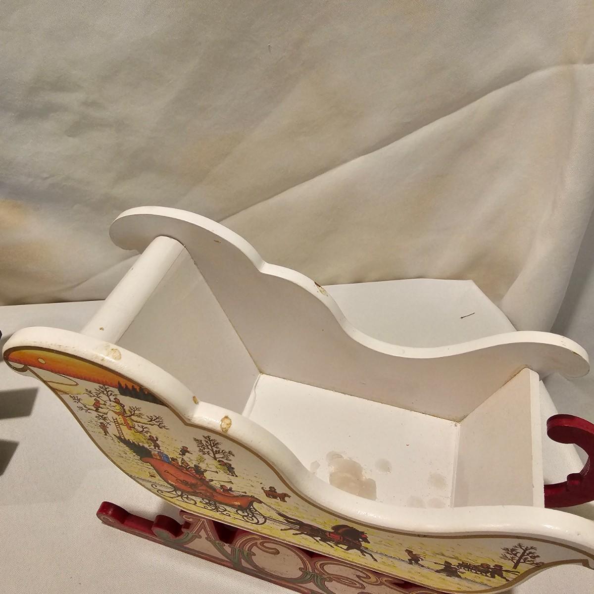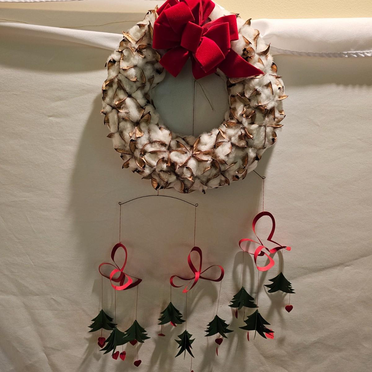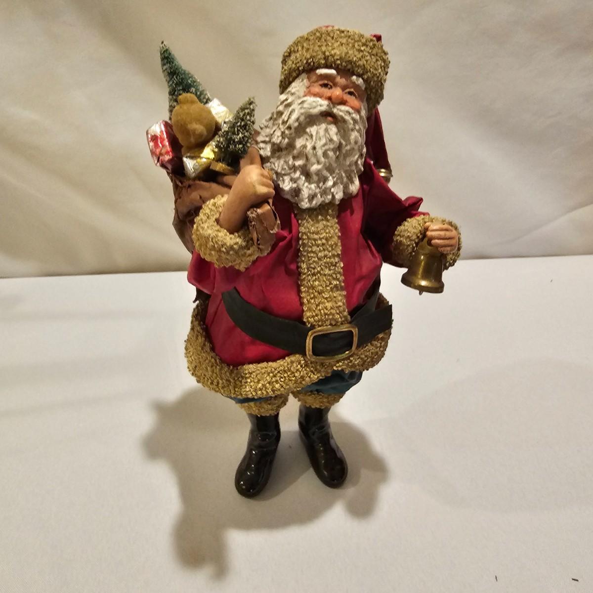 Fun and wonderful decorations from Christmas past. Cornhusk angel and tree, spool tree, wooden sleigh, fold up tree to hold lollipops, 14" x 25"H. Two 10"H paper mache Santas, a twirling tree with ribbons, 10" x 17"H. Needlepoint picture 10"sq x 2" deep. A tree and ribbon mobile and a 12"D wreath made from cotton and husks. Other assorted table-sitter items, see photos for details. Shipping available.