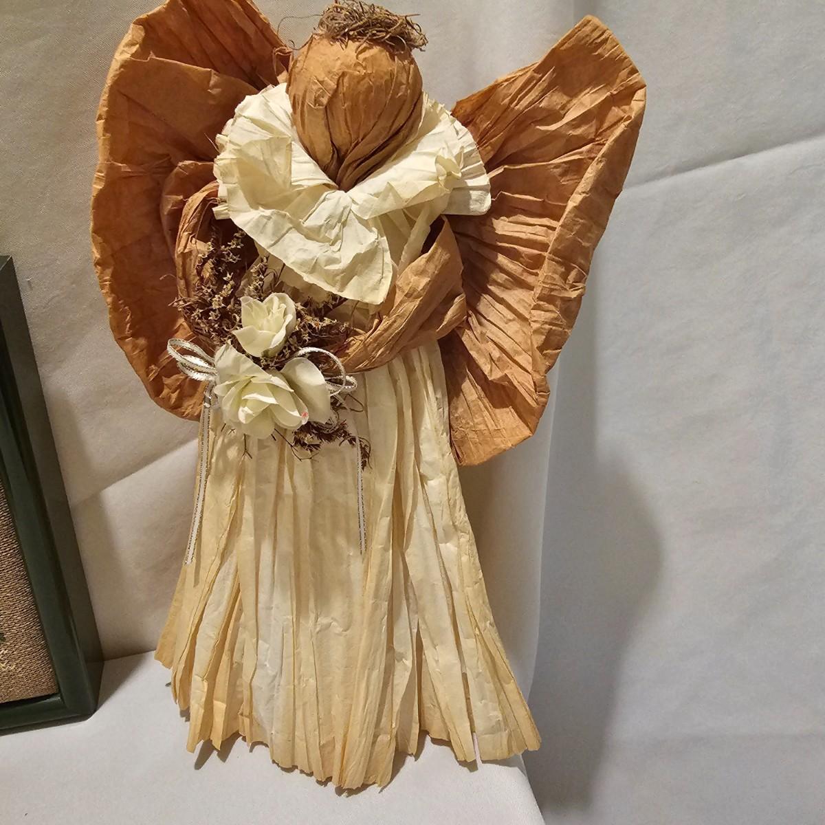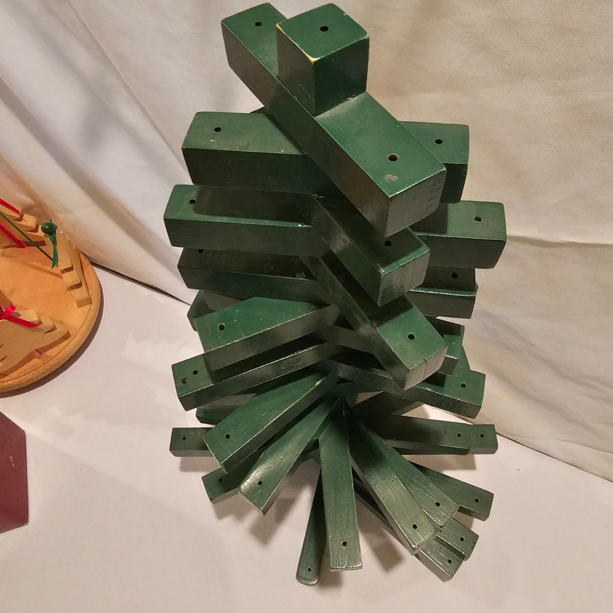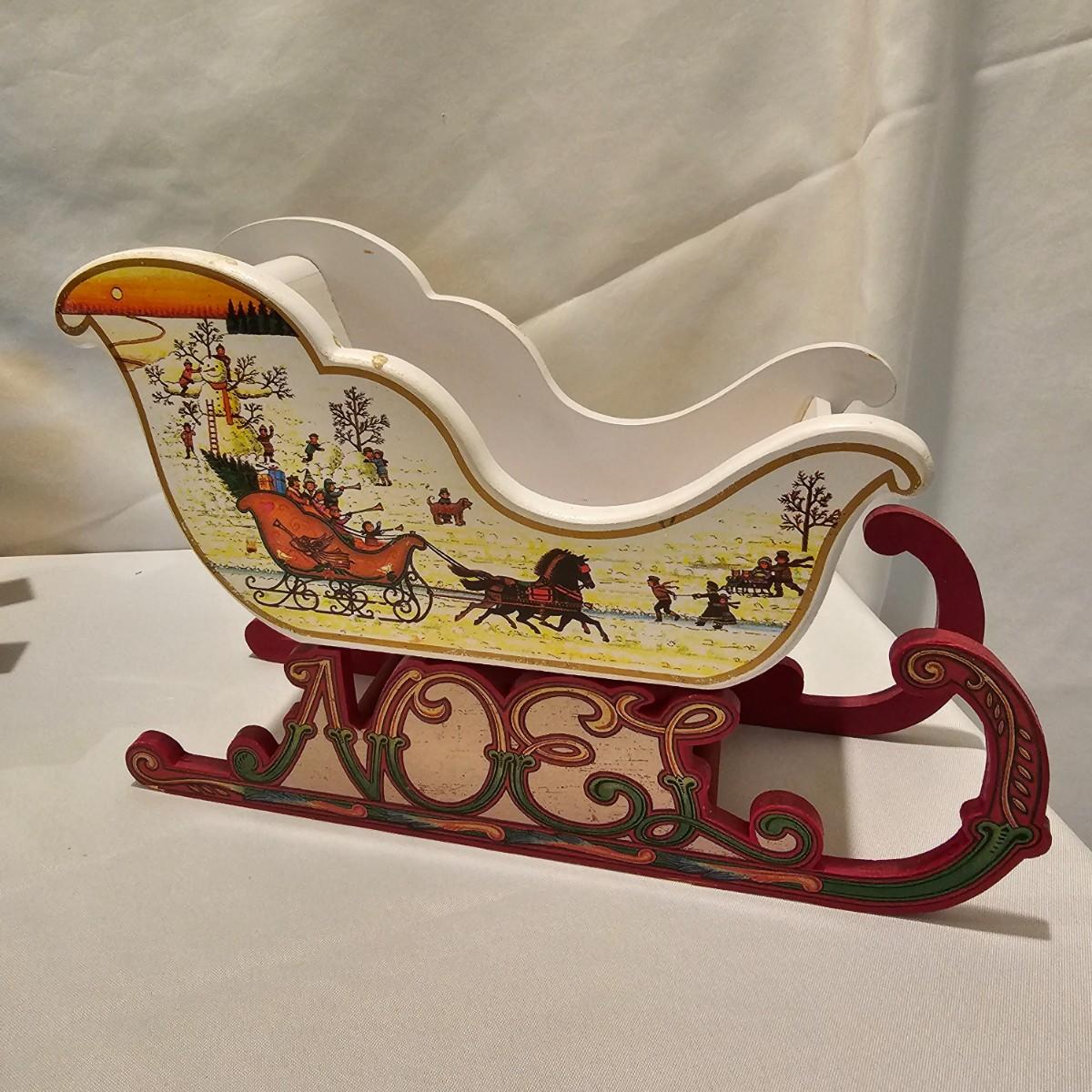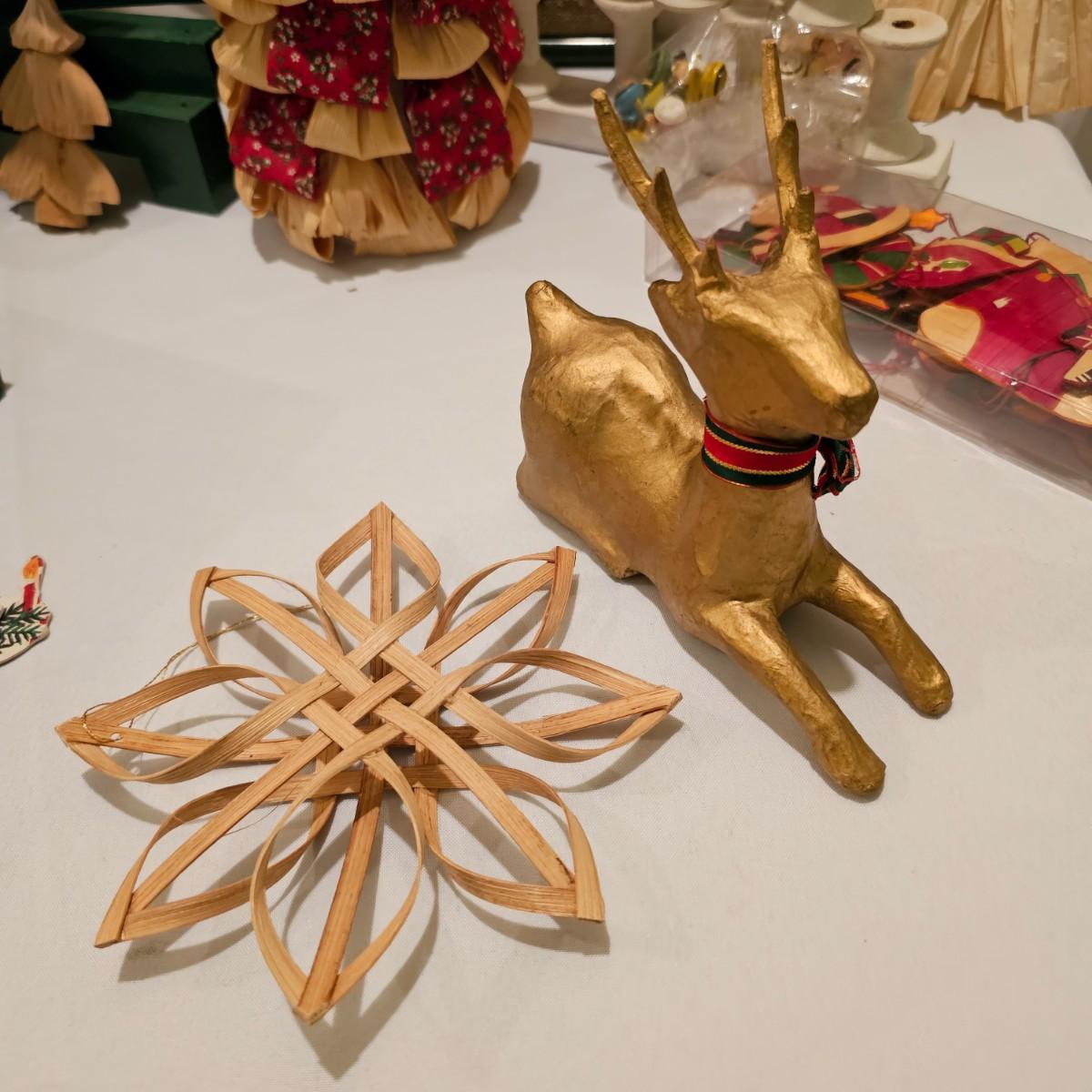 Fun and wonderful decorations from Christmas past. Cornhusk angel and tree, spool tree, wooden sleigh, fold up tree to hold lollipops, 14" x 25"H. Two 10"H paper mache Santas, a twirling tree with ribbons, 10" x 17"H. Needlepoint picture 10"sq x 2" deep. A tree and ribbon mobile and a 12"D wreath made from cotton and husks. Other assorted table-sitter items, see photos for details. Shipping available.