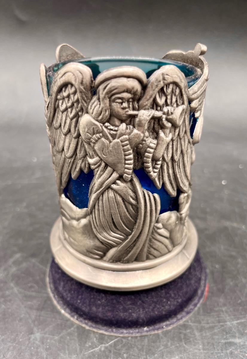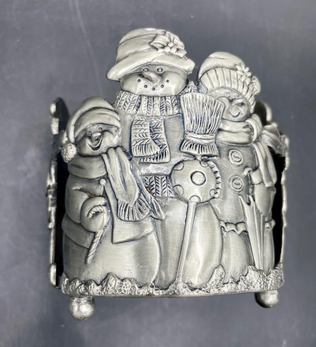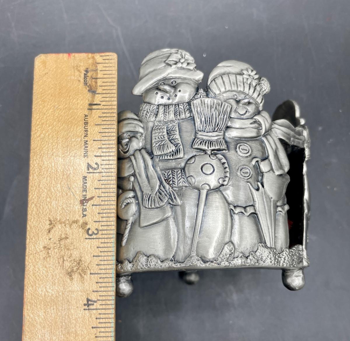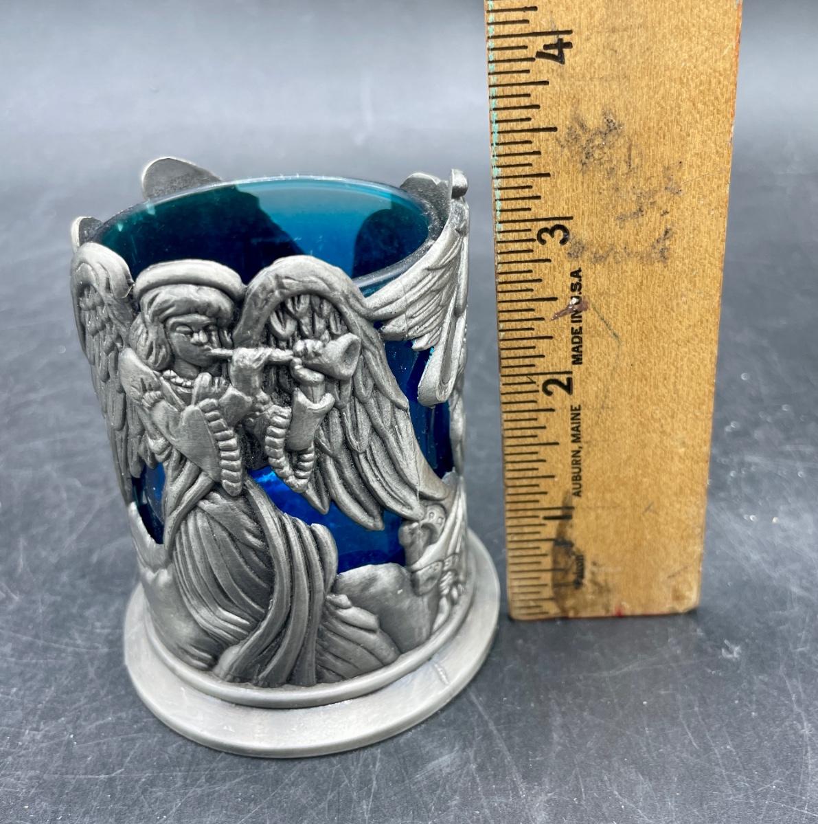 Pewter Snowman Family and Pewter & Blue Glass Angels w/Musical Instruments. Good condition, both are approx. 3" tall.