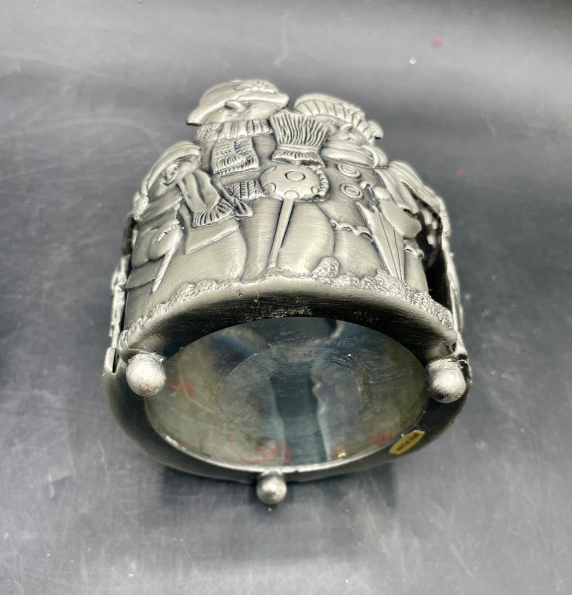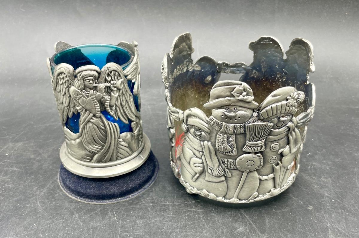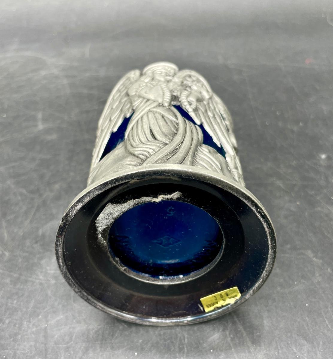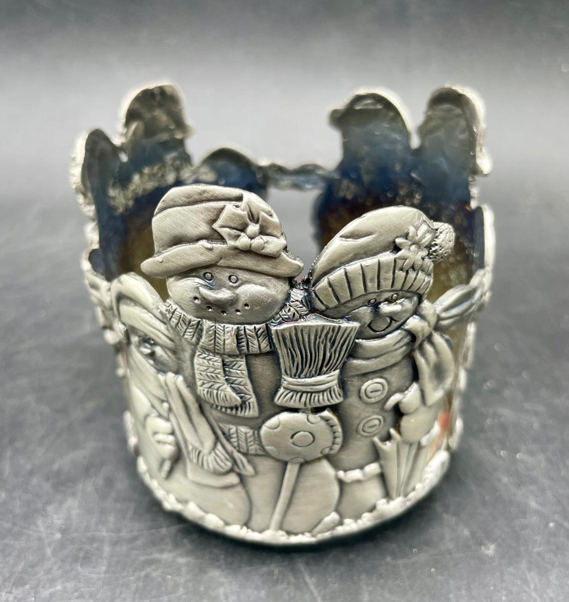 Pewter Snowman Family and Pewter & Blue Glass Angels w/Musical Instruments. Good condition, both are approx. 3" tall.