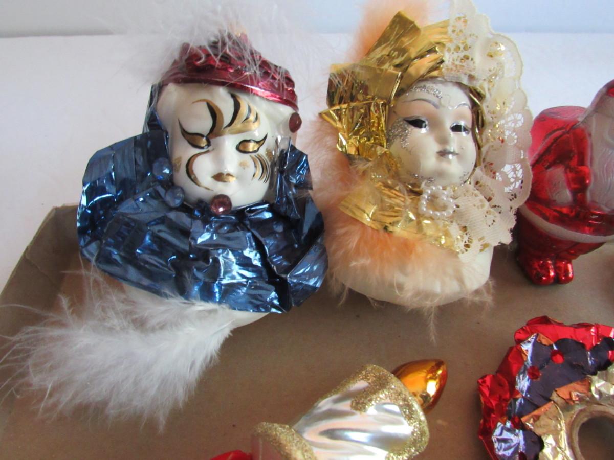 Mardi Gras glass ornaments are missing some embellishment "jewels", easy fix. The candle ornament is missing its clip. The egg is missing its hanger.