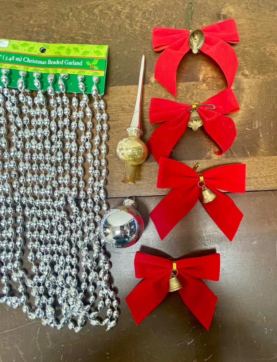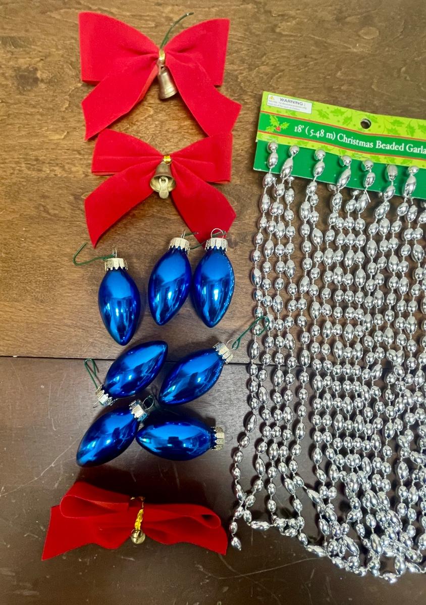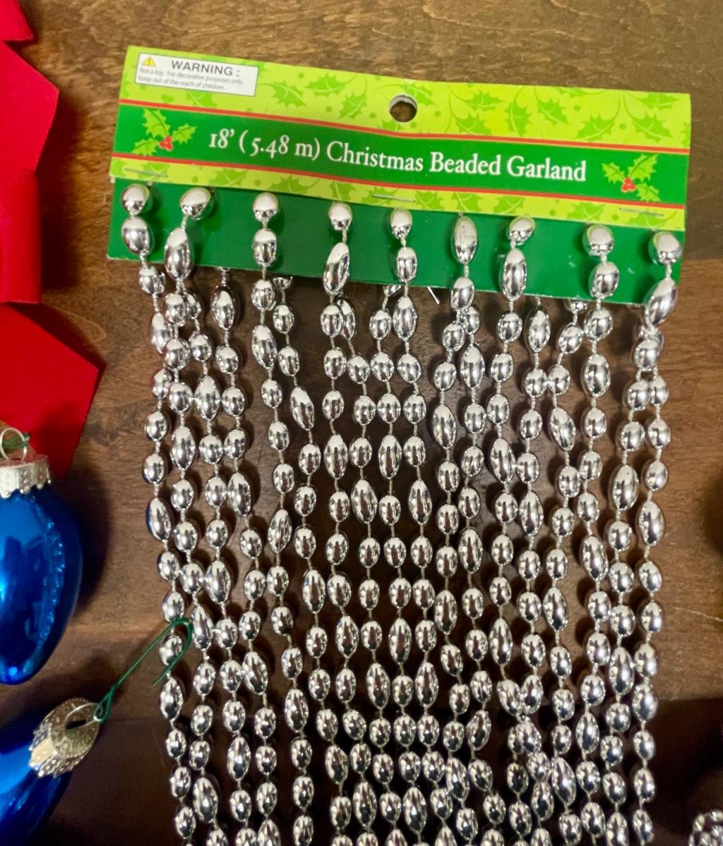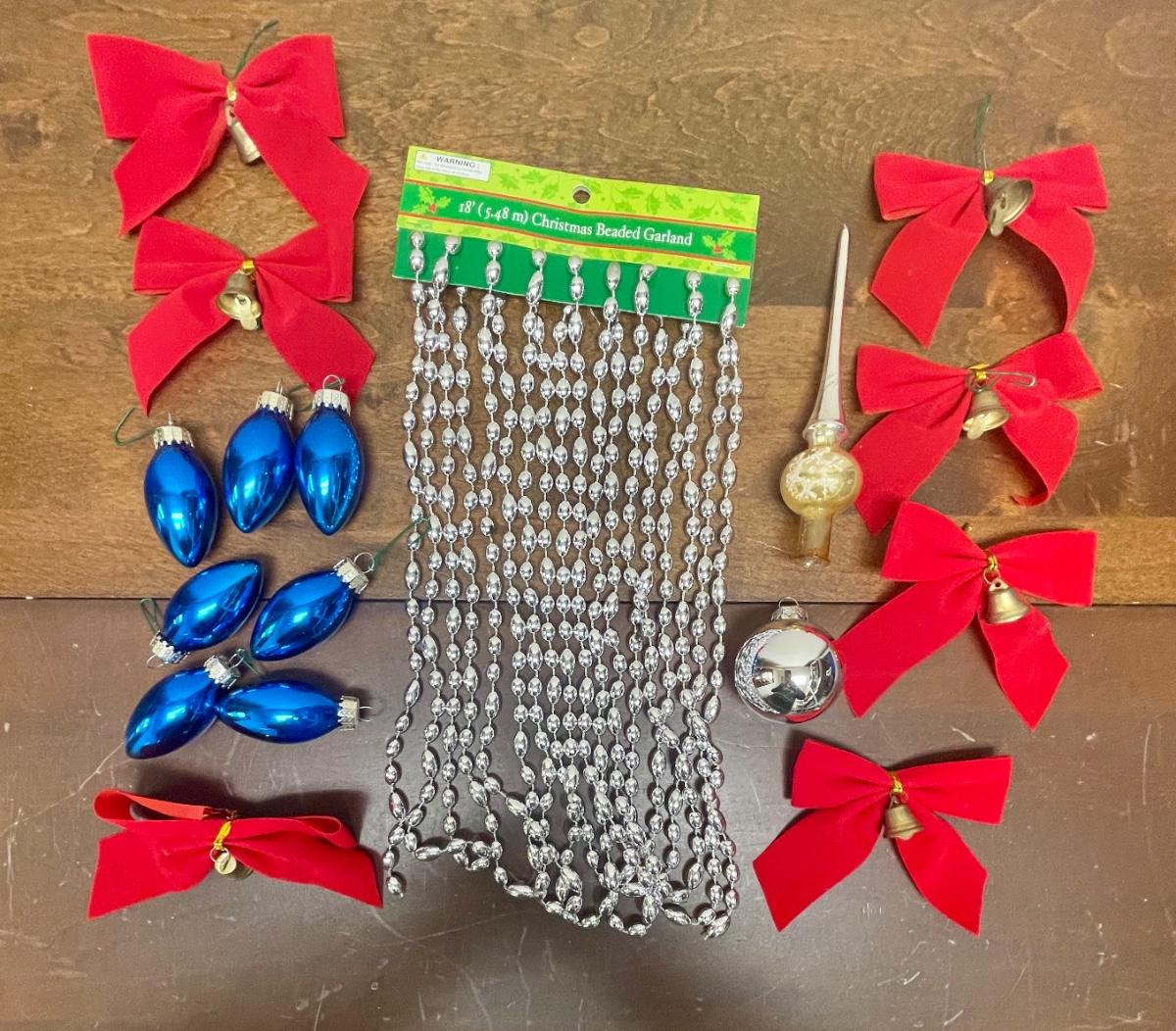 Includes red ribbon bow ties with bells, 18’ silver glass bead garland string, and blue glass ornaments.