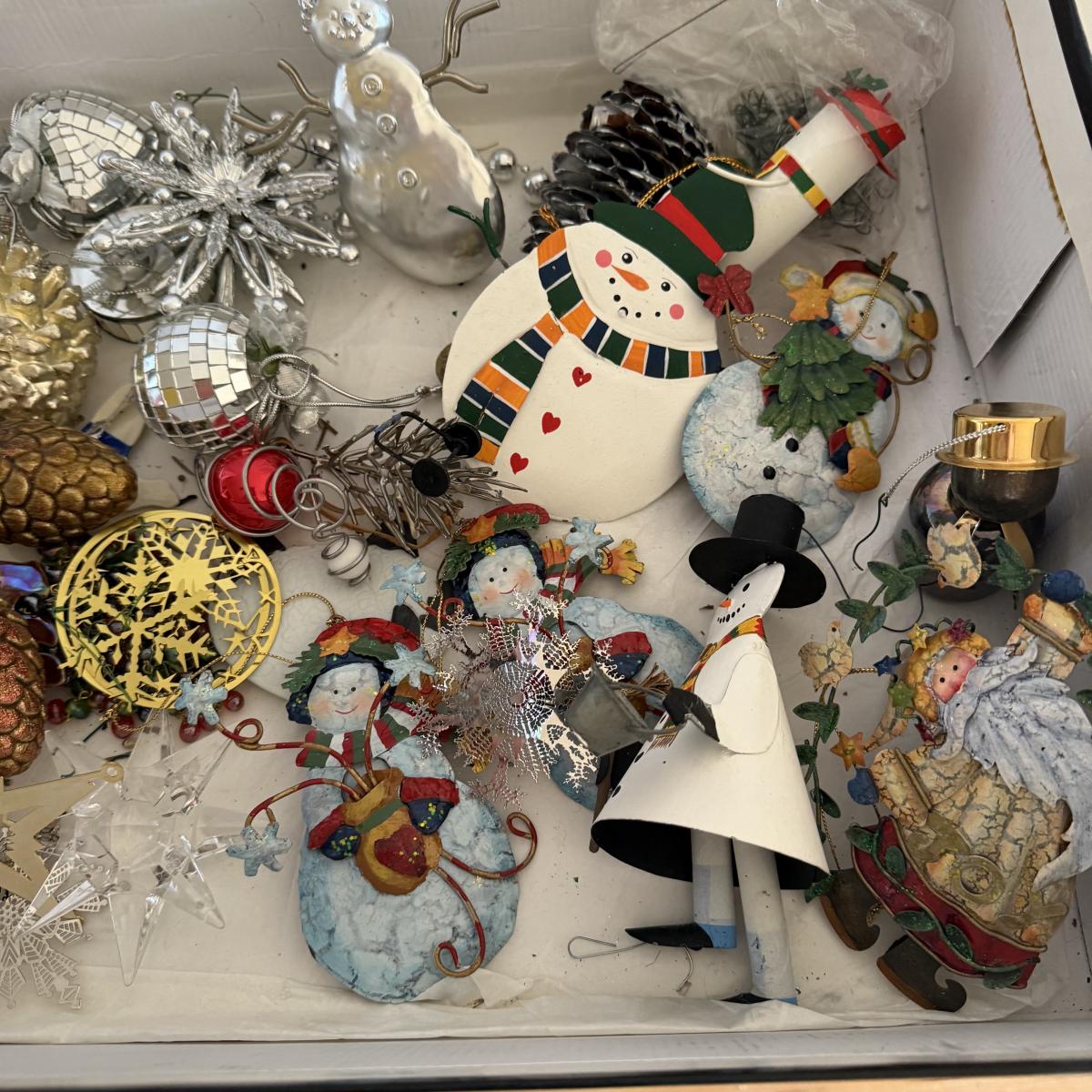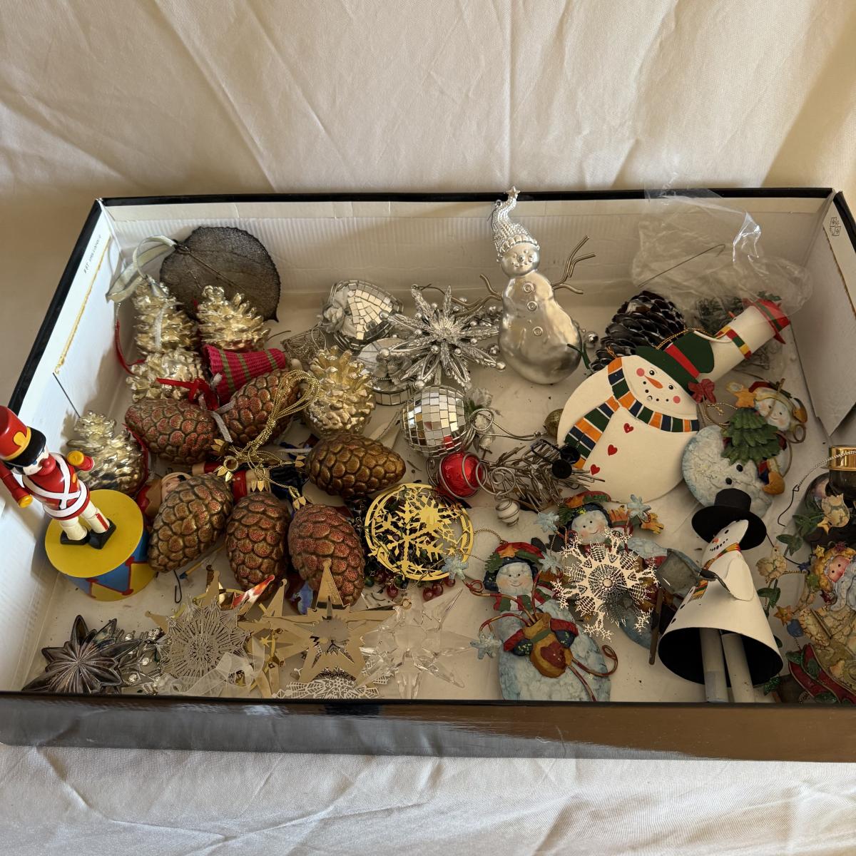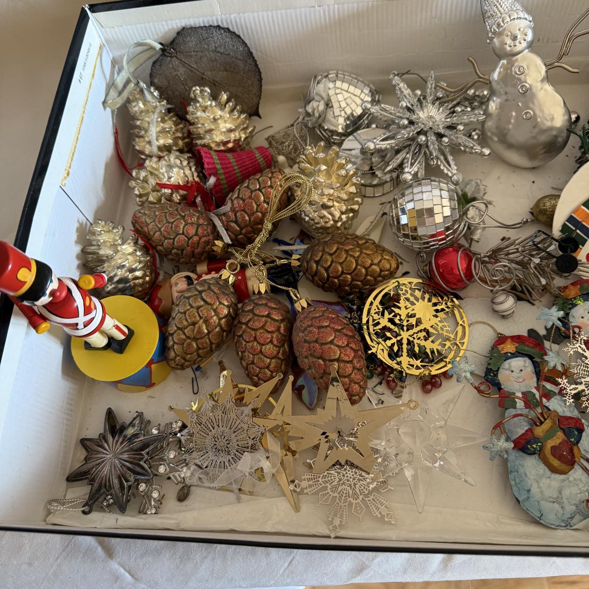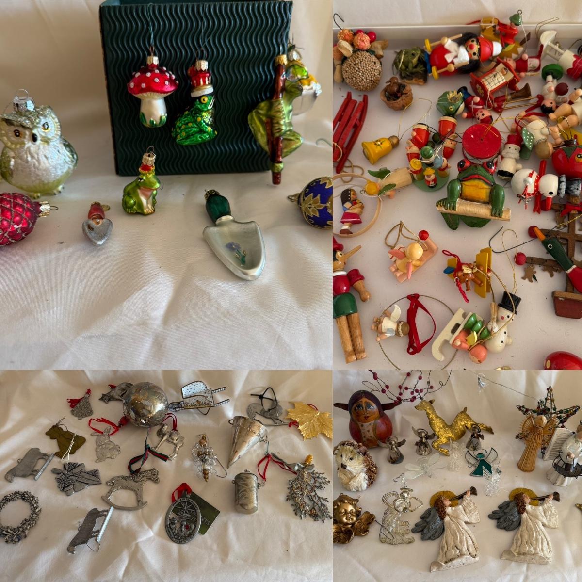 This lot contains an abundance of Christmas tree ornaments. There are well over 100+ ornaments in this lot. There is a small collection of glass ornaments of little creatures like frogs and owls and a mushroom. We have a set of ornate bulb ornaments with suns on them, they appear to be cardboard and then papier-mâché and painted. Another small collection of glass bulbs, the largest being about 4” and the smallest being about 1.5”D. Then we have a collection of small wooden figurine ornaments, they are so precious and most are under 2”. Then we move on to a massive collection of different styled ornaments. To name a few there are little metal stars and hearts, glass icicle inspired ornaments, angels, birds, bee’s. Wooden ducks, snowmen, snowflakes and so on. See pictures for detail. Local pick up only.