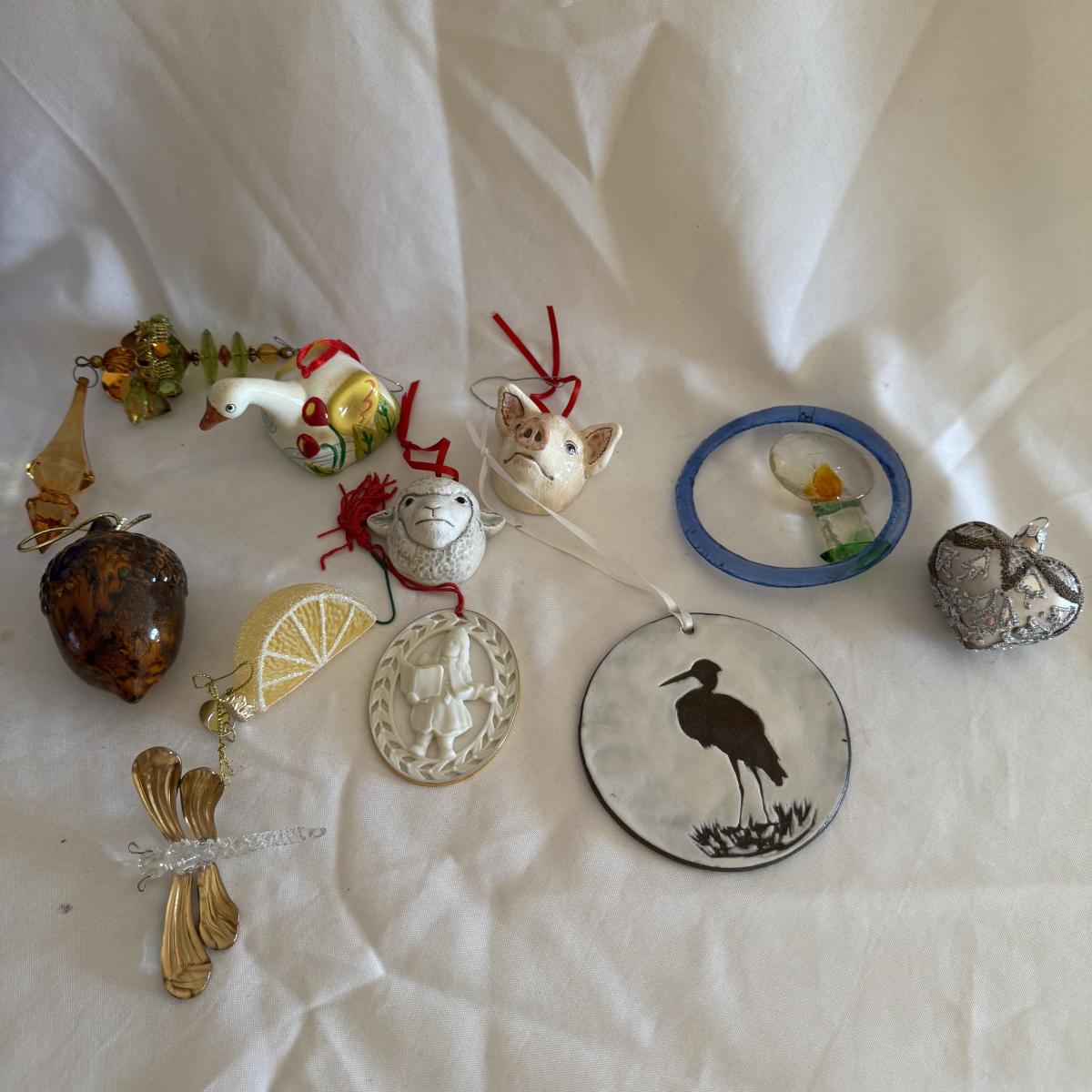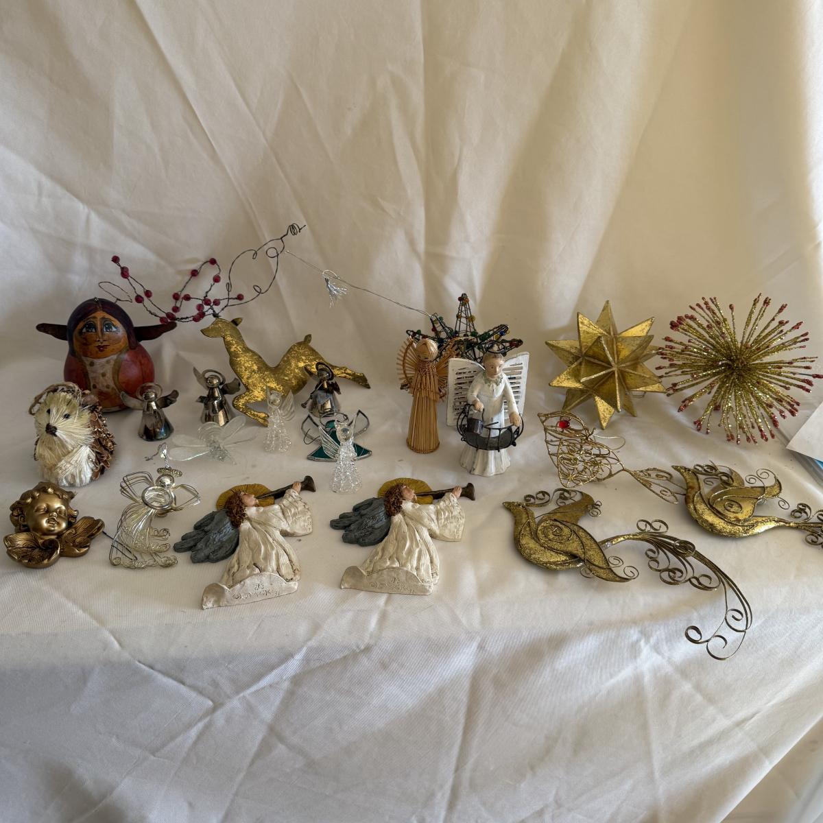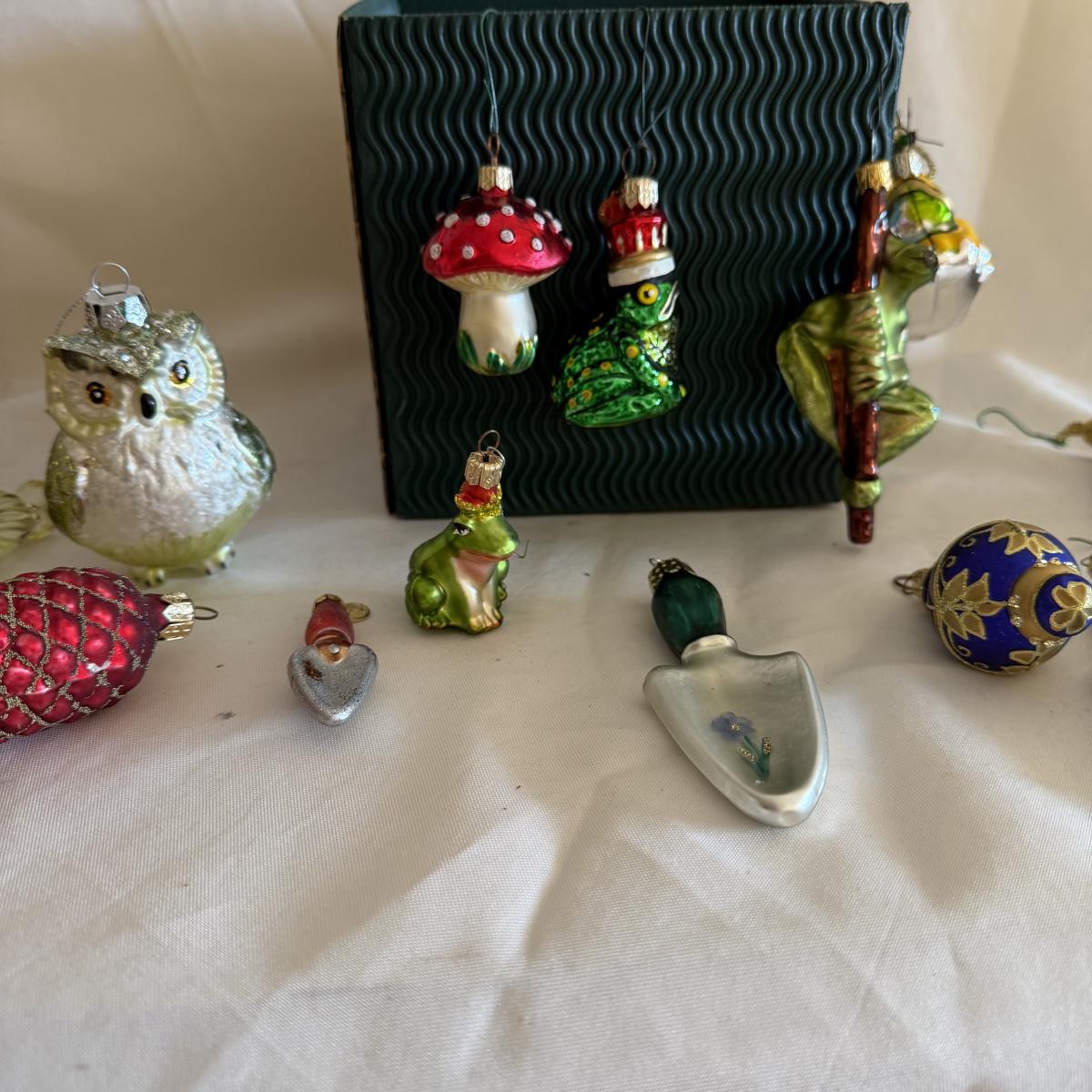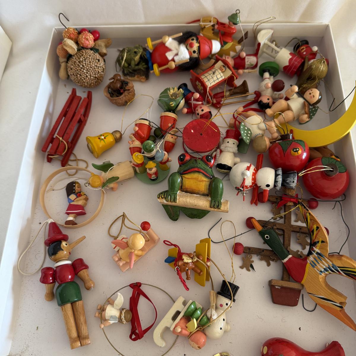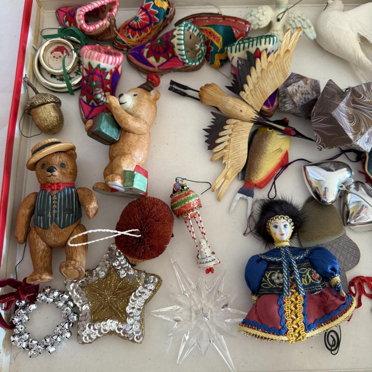 This lot contains an abundance of Christmas tree ornaments. There are well over 100+ ornaments in this lot. There is a small collection of glass ornaments of little creatures like frogs and owls and a mushroom. We have a set of ornate bulb ornaments with suns on them, they appear to be cardboard and then papier-mâché and painted. Another small collection of glass bulbs, the largest being about 4” and the smallest being about 1.5”D. Then we have a collection of small wooden figurine ornaments, they are so precious and most are under 2”. Then we move on to a massive collection of different styled ornaments. To name a few there are little metal stars and hearts, glass icicle inspired ornaments, angels, birds, bee’s. Wooden ducks, snowmen, snowflakes and so on. See pictures for detail. Local pick up only.