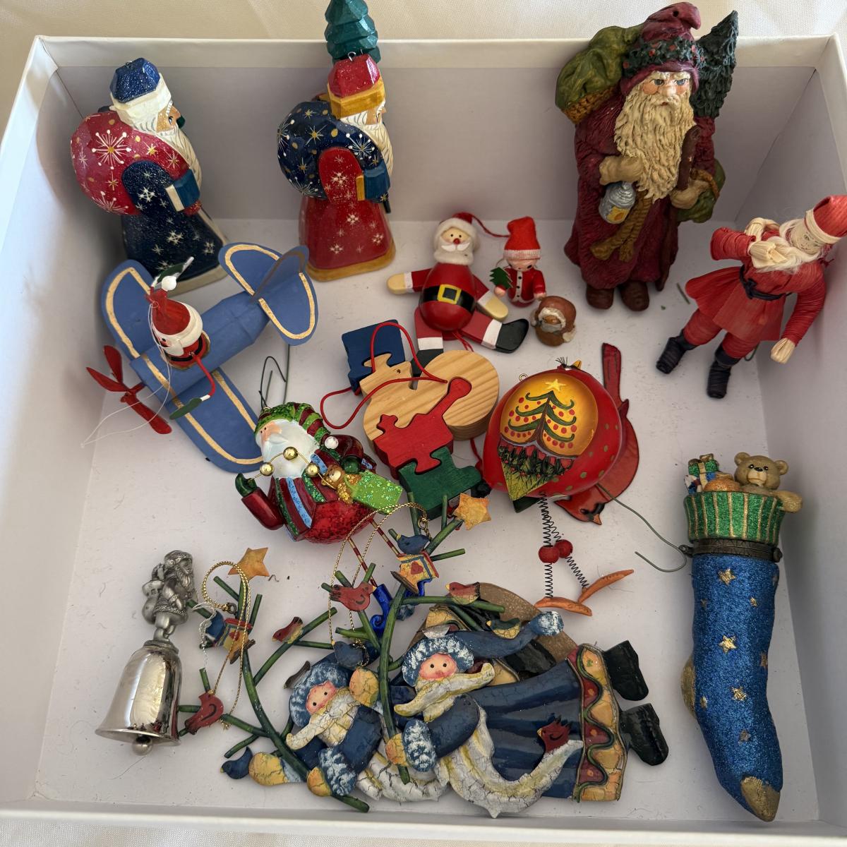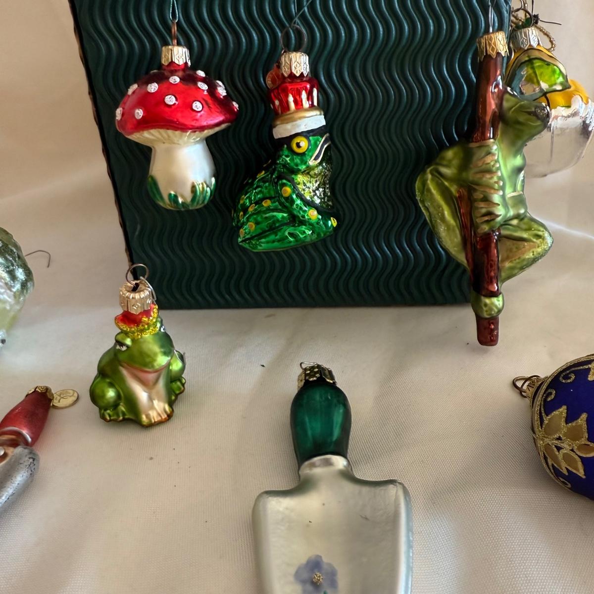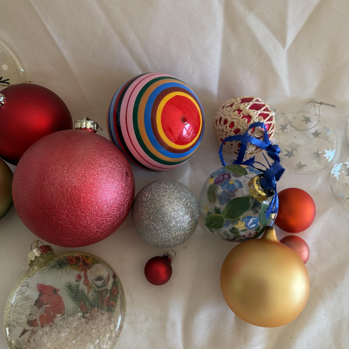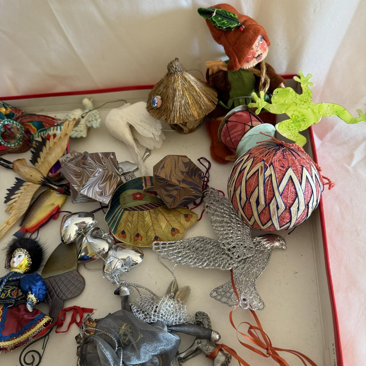 This lot contains an abundance of Christmas tree ornaments. There are well over 100+ ornaments in this lot. There is a small collection of glass ornaments of little creatures like frogs and owls and a mushroom. We have a set of ornate bulb ornaments with suns on them, they appear to be cardboard and then papier-mâché and painted. Another small collection of glass bulbs, the largest being about 4” and the smallest being about 1.5”D. Then we have a collection of small wooden figurine ornaments, they are so precious and most are under 2”. Then we move on to a massive collection of different styled ornaments. To name a few there are little metal stars and hearts, glass icicle inspired ornaments, angels, birds, bee’s. Wooden ducks, snowmen, snowflakes and so on. See pictures for detail. Local pick up only.