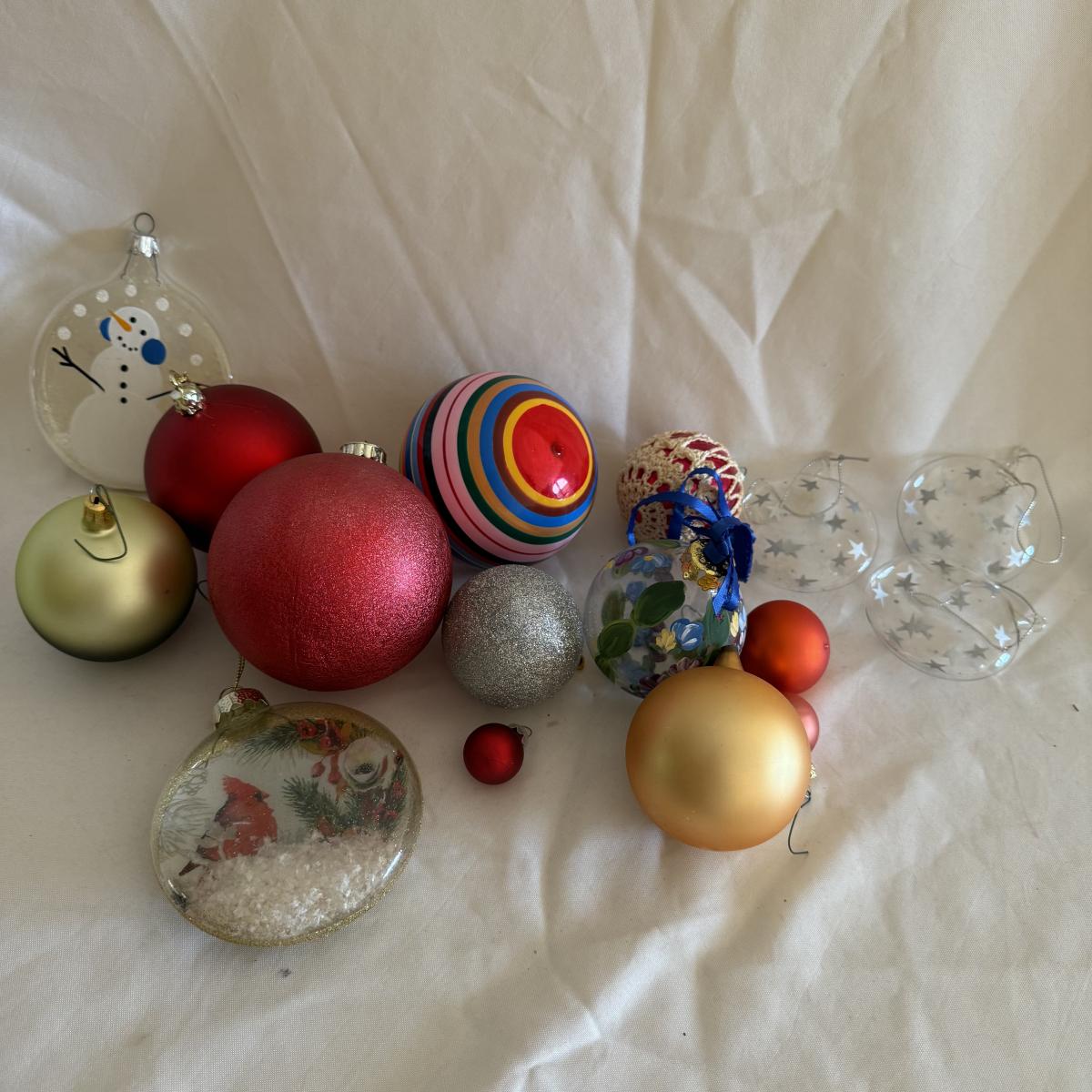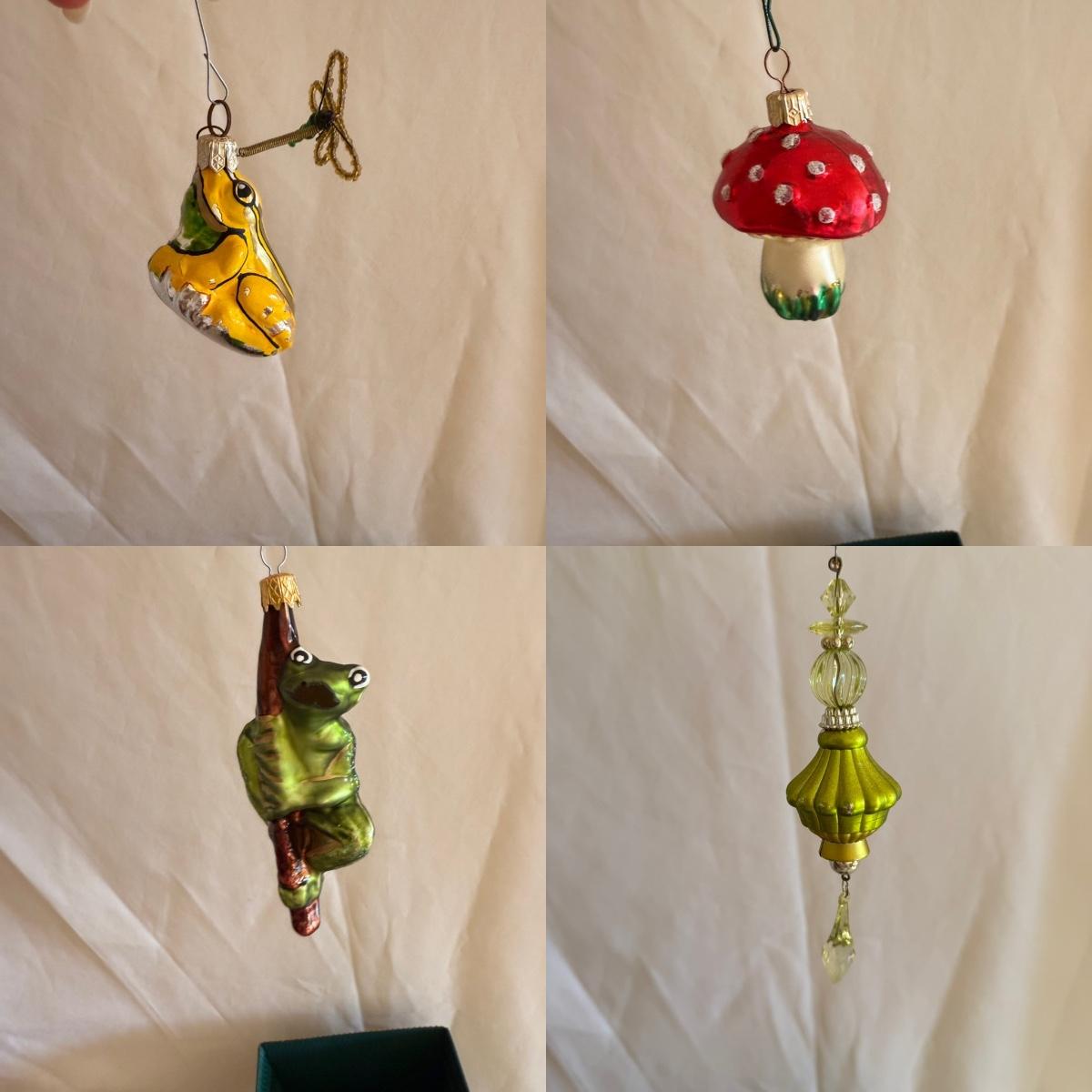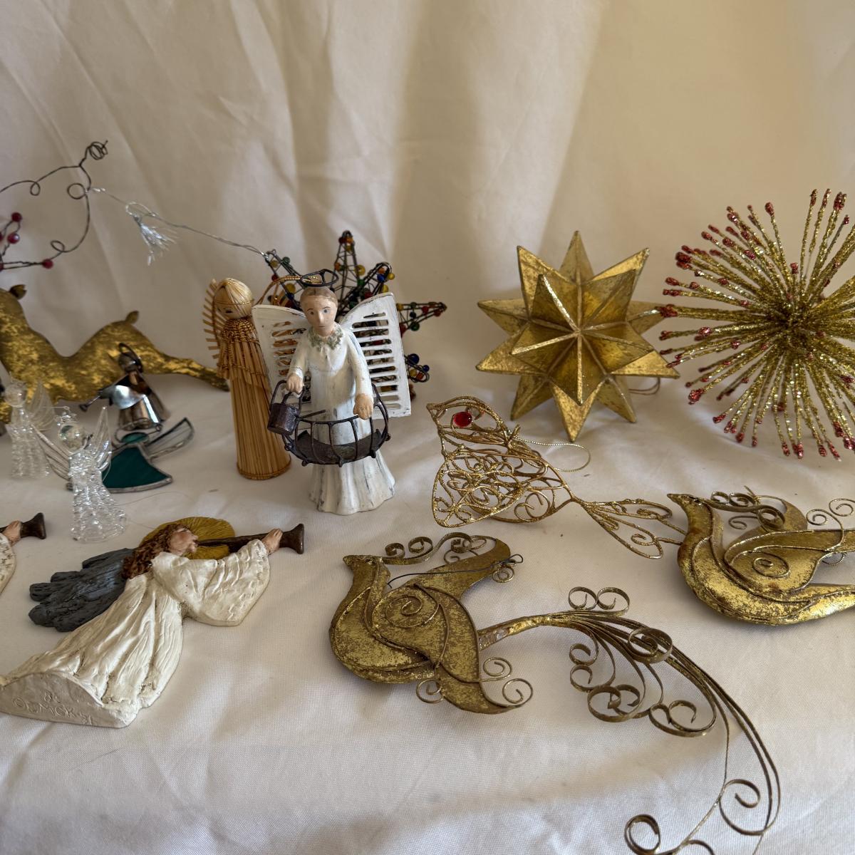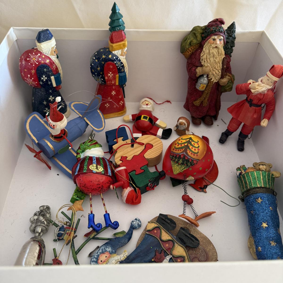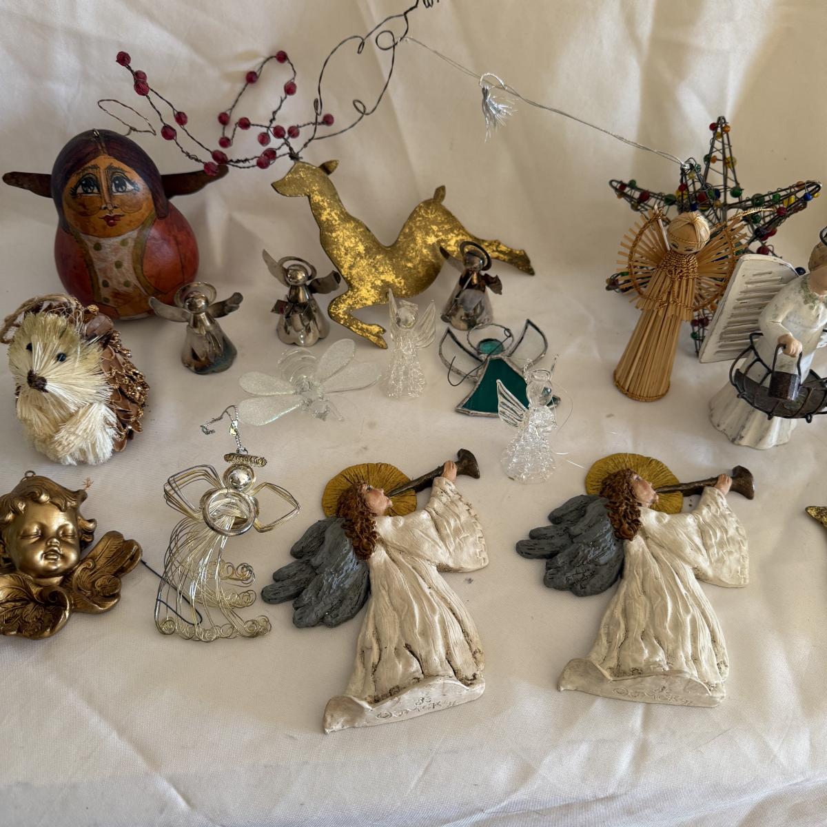 This lot contains an abundance of Christmas tree ornaments. There are well over 100+ ornaments in this lot. There is a small collection of glass ornaments of little creatures like frogs and owls and a mushroom. We have a set of ornate bulb ornaments with suns on them, they appear to be cardboard and then papier-mâché and painted. Another small collection of glass bulbs, the largest being about 4” and the smallest being about 1.5”D. Then we have a collection of small wooden figurine ornaments, they are so precious and most are under 2”. Then we move on to a massive collection of different styled ornaments. To name a few there are little metal stars and hearts, glass icicle inspired ornaments, angels, birds, bee’s. Wooden ducks, snowmen, snowflakes and so on. See pictures for detail. Local pick up only.