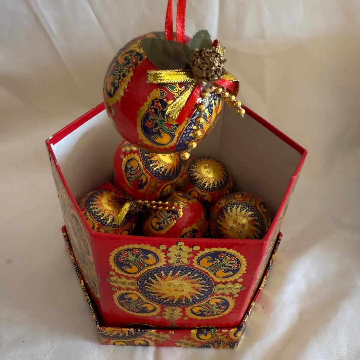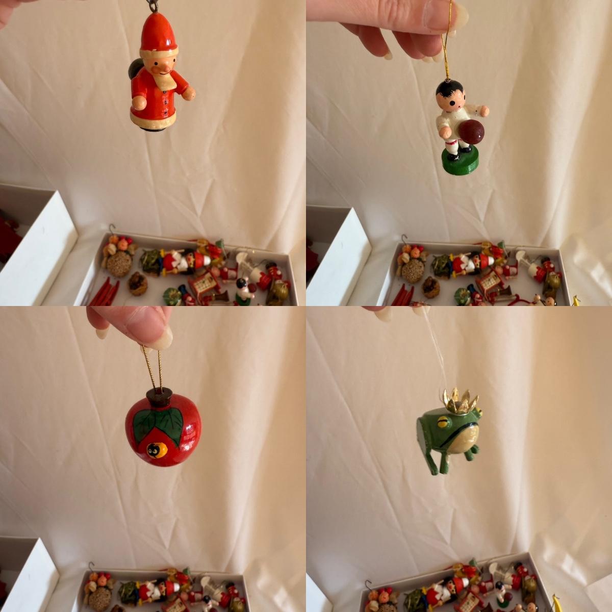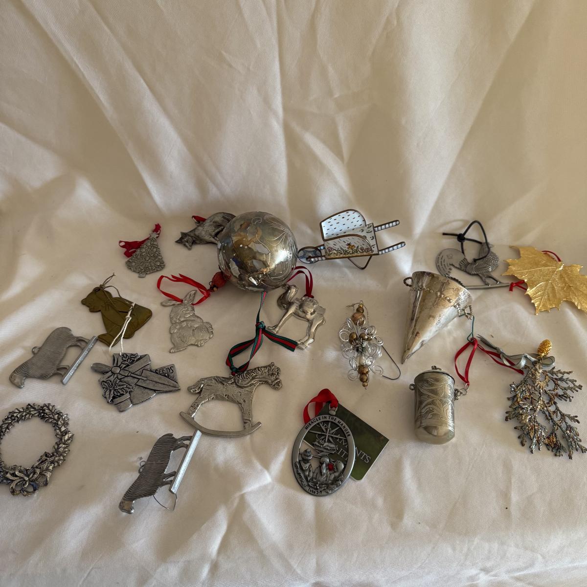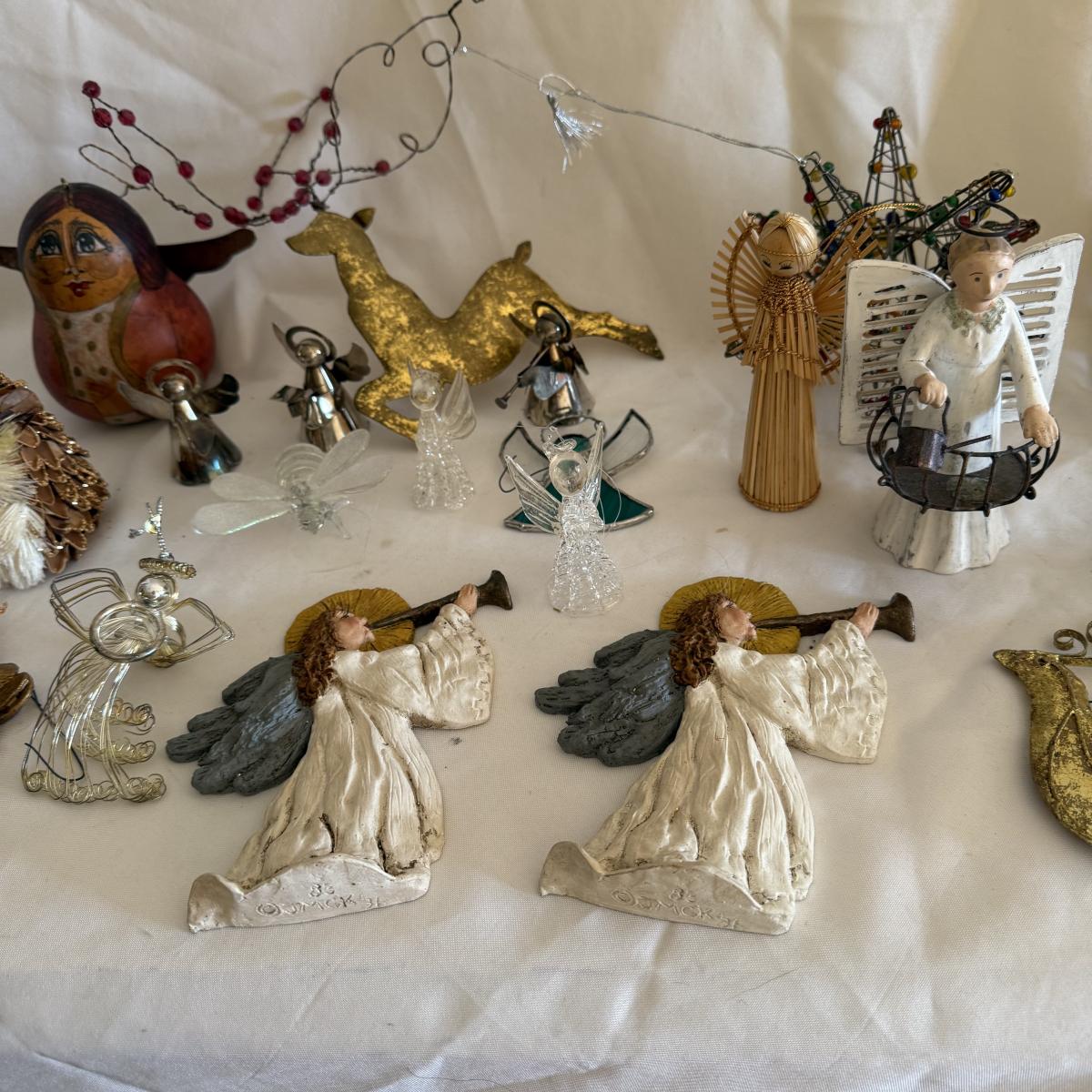 This lot contains an abundance of Christmas tree ornaments. There are well over 100+ ornaments in this lot. There is a small collection of glass ornaments of little creatures like frogs and owls and a mushroom. We have a set of ornate bulb ornaments with suns on them, they appear to be cardboard and then papier-mâché and painted. Another small collection of glass bulbs, the largest being about 4” and the smallest being about 1.5”D. Then we have a collection of small wooden figurine ornaments, they are so precious and most are under 2”. Then we move on to a massive collection of different styled ornaments. To name a few there are little metal stars and hearts, glass icicle inspired ornaments, angels, birds, bee’s. Wooden ducks, snowmen, snowflakes and so on. See pictures for detail. Local pick up only.
