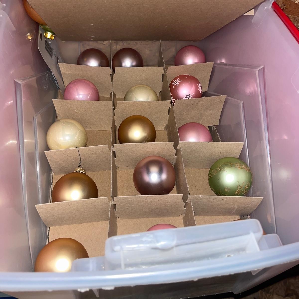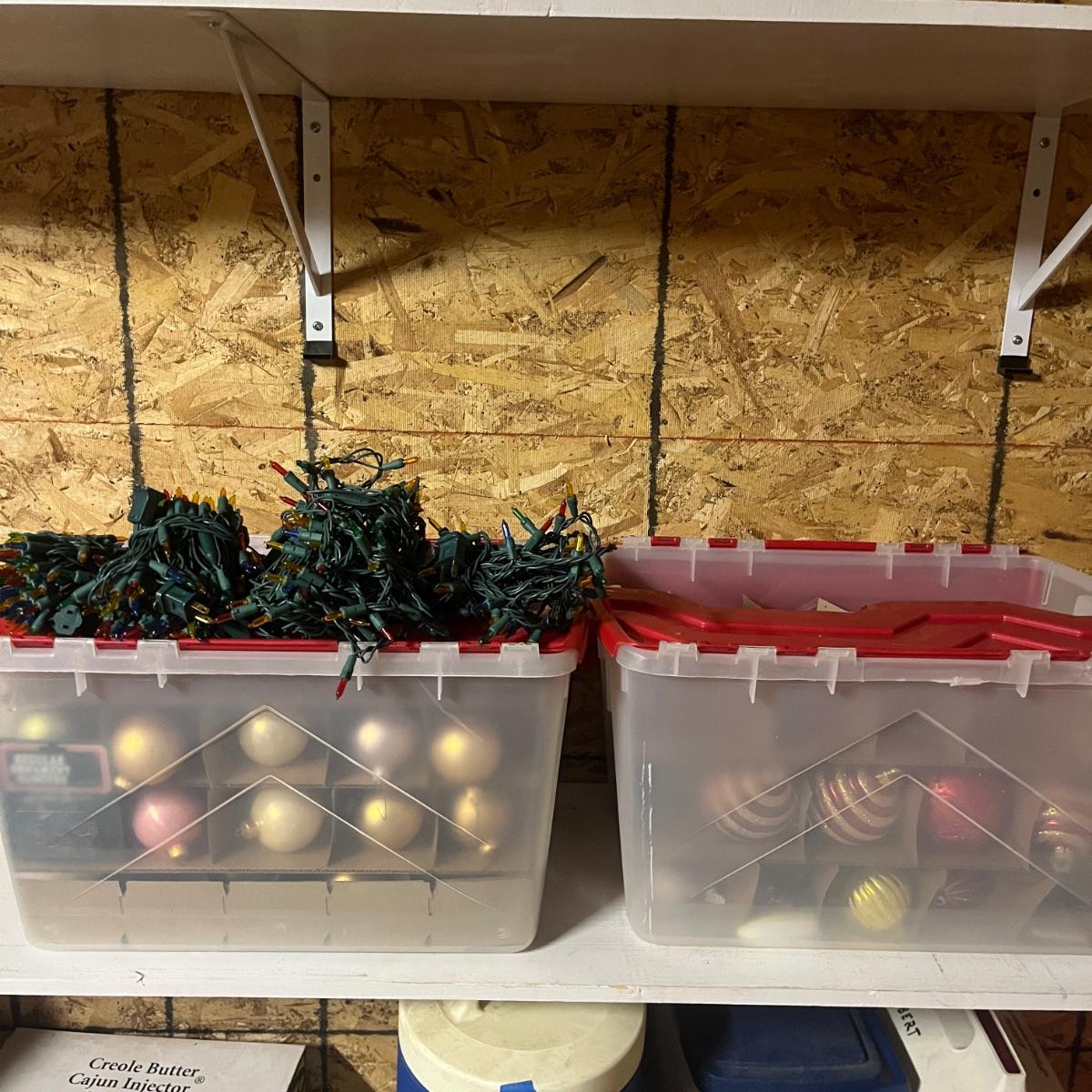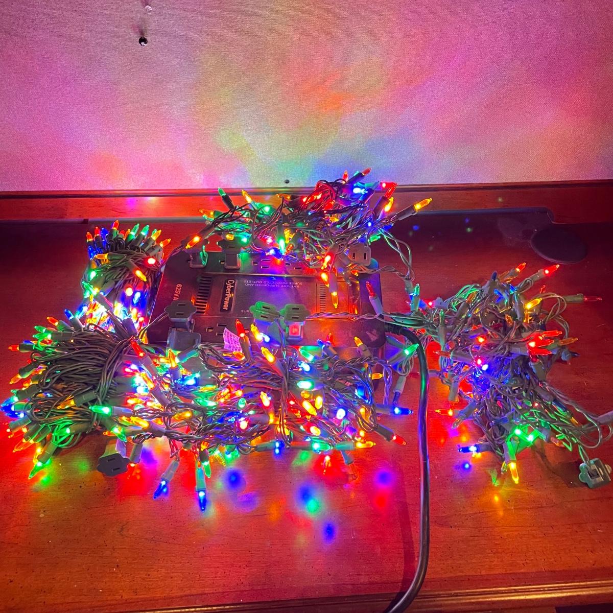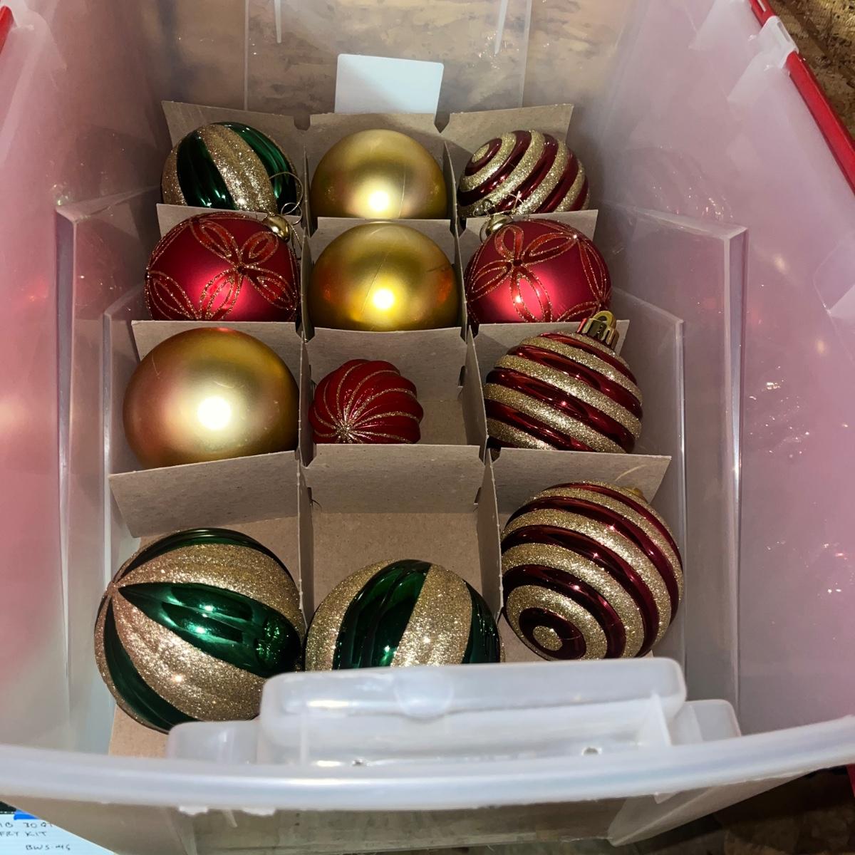 Lot includes over 50 loose Christmas ornaments in a variety of styles, sizes and shapes. Also includes five strings of colored lights with three packages of small ornaments and storage boxes. All strings of colored lights turned on when plugged in, we did not monitor individual bulbs. Surge protector seen in photos is not included, but available in lot 124. Boxes measure 22” x 15” x 12”H.