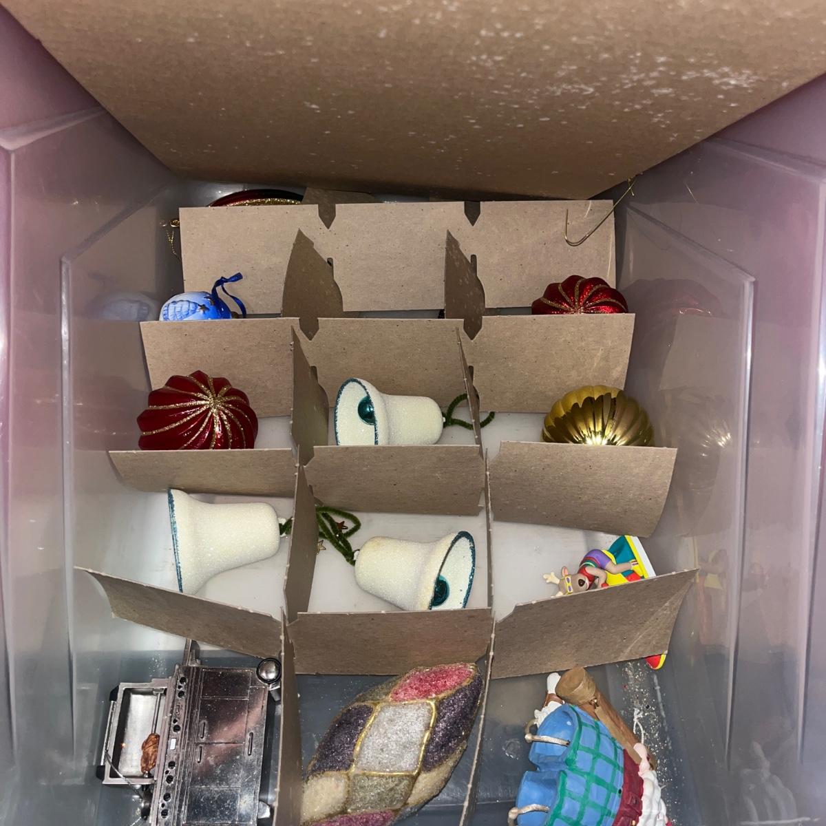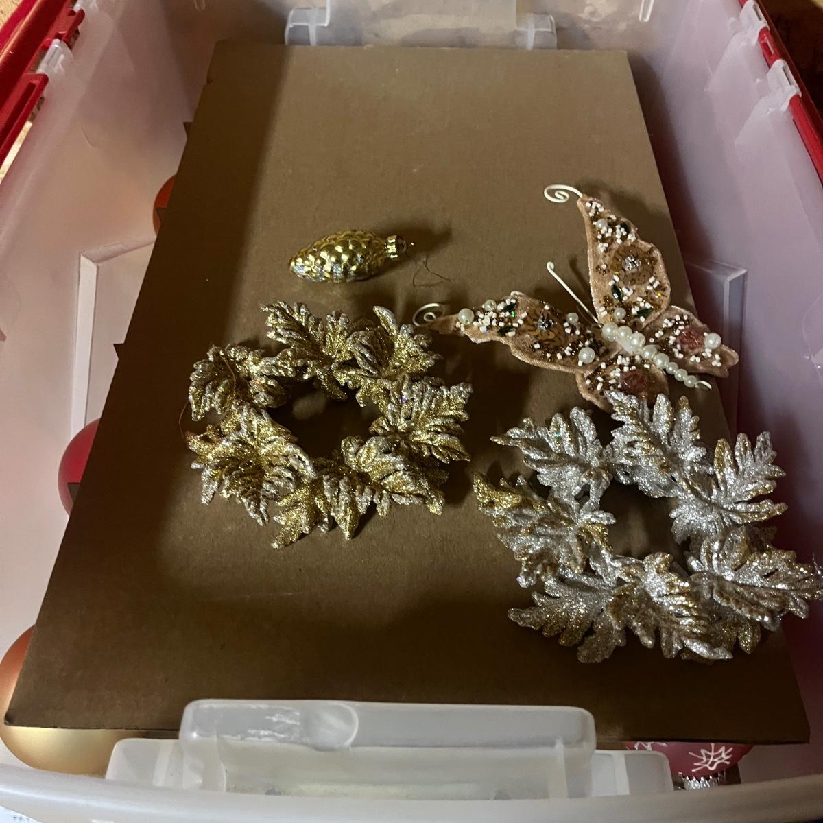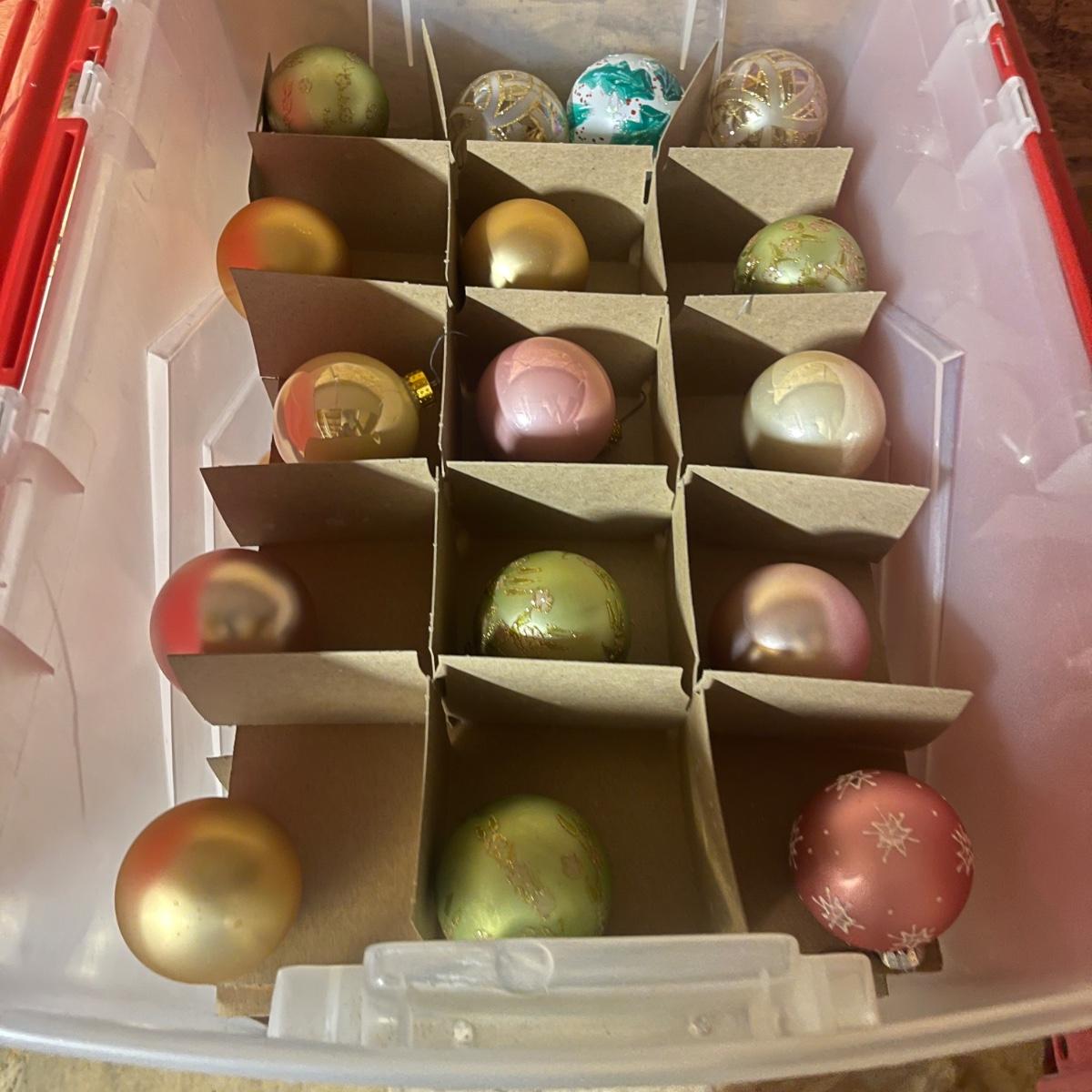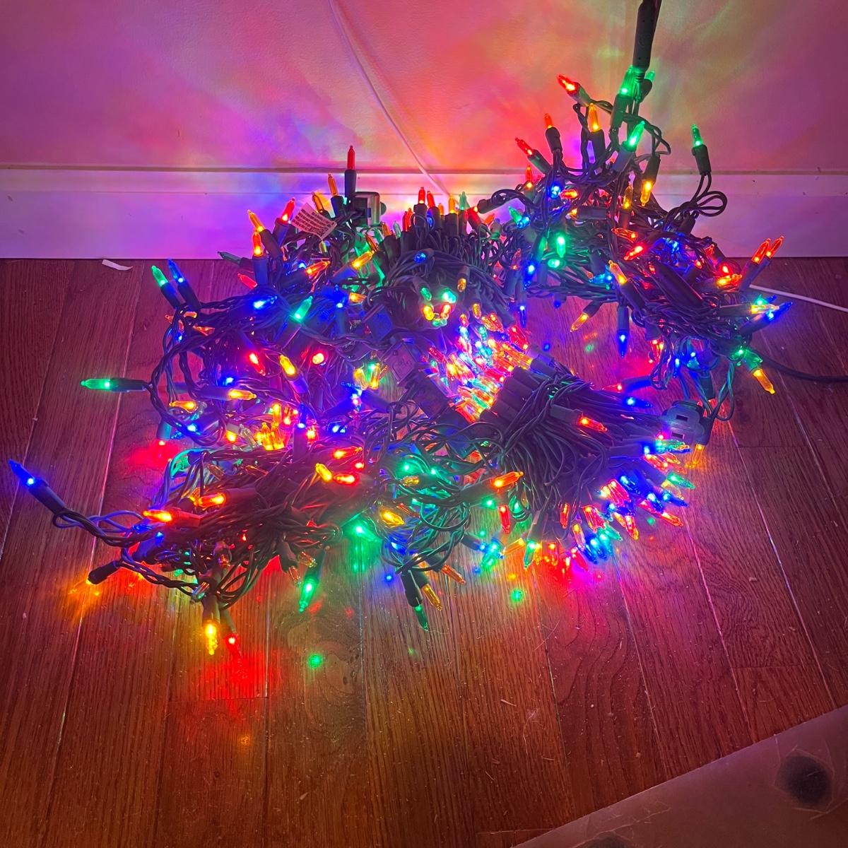 Lot includes over 50 loose Christmas ornaments in a variety of styles, sizes and shapes. Also includes five strings of colored lights with three packages of small ornaments and storage boxes. All strings of colored lights turned on when plugged in, we did not monitor individual bulbs. Surge protector seen in photos is not included, but available in lot 124. Boxes measure 22” x 15” x 12”H.