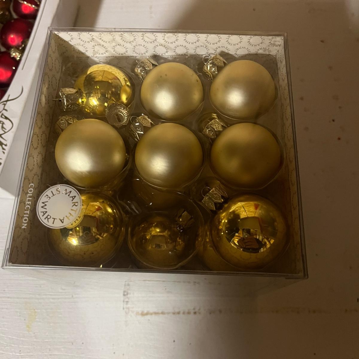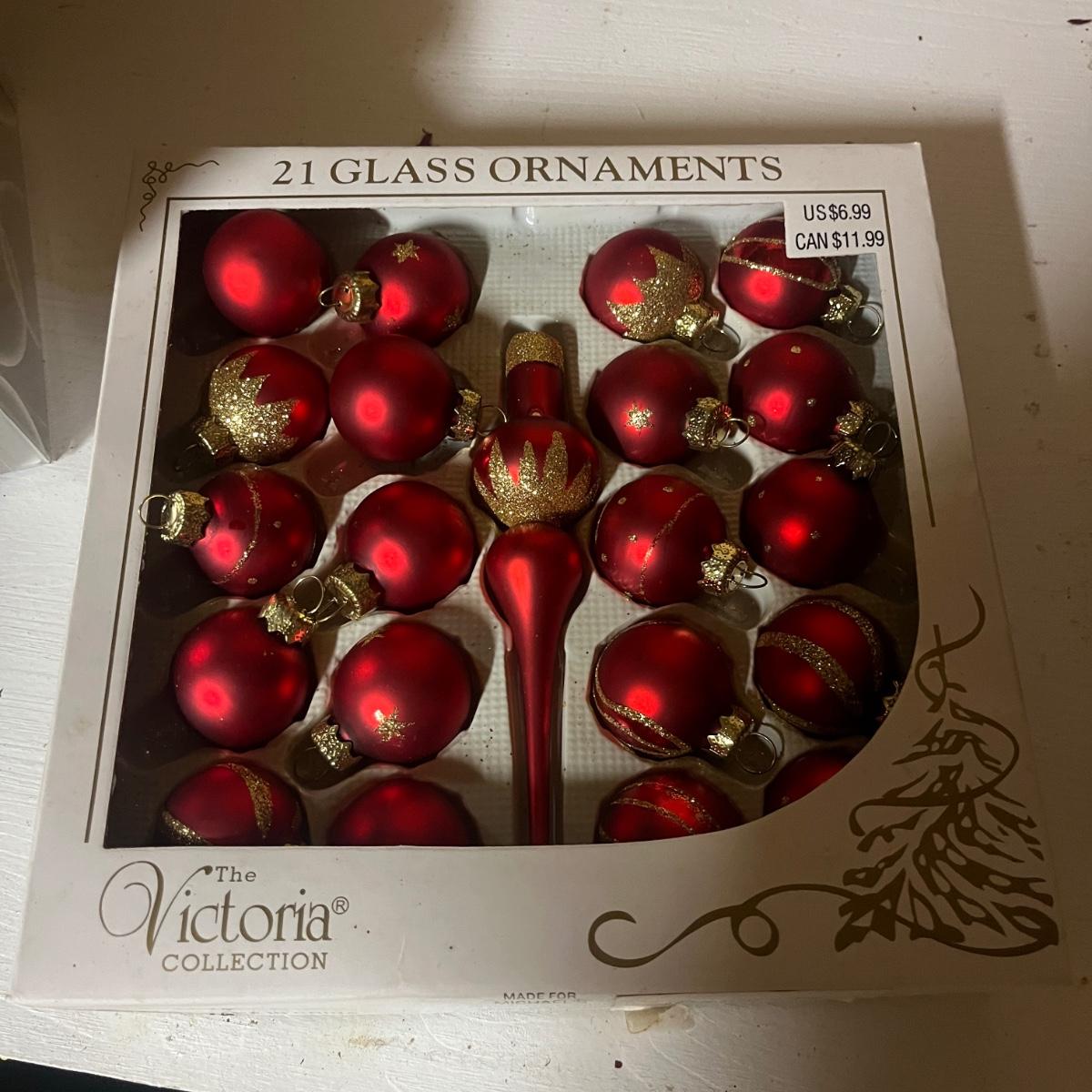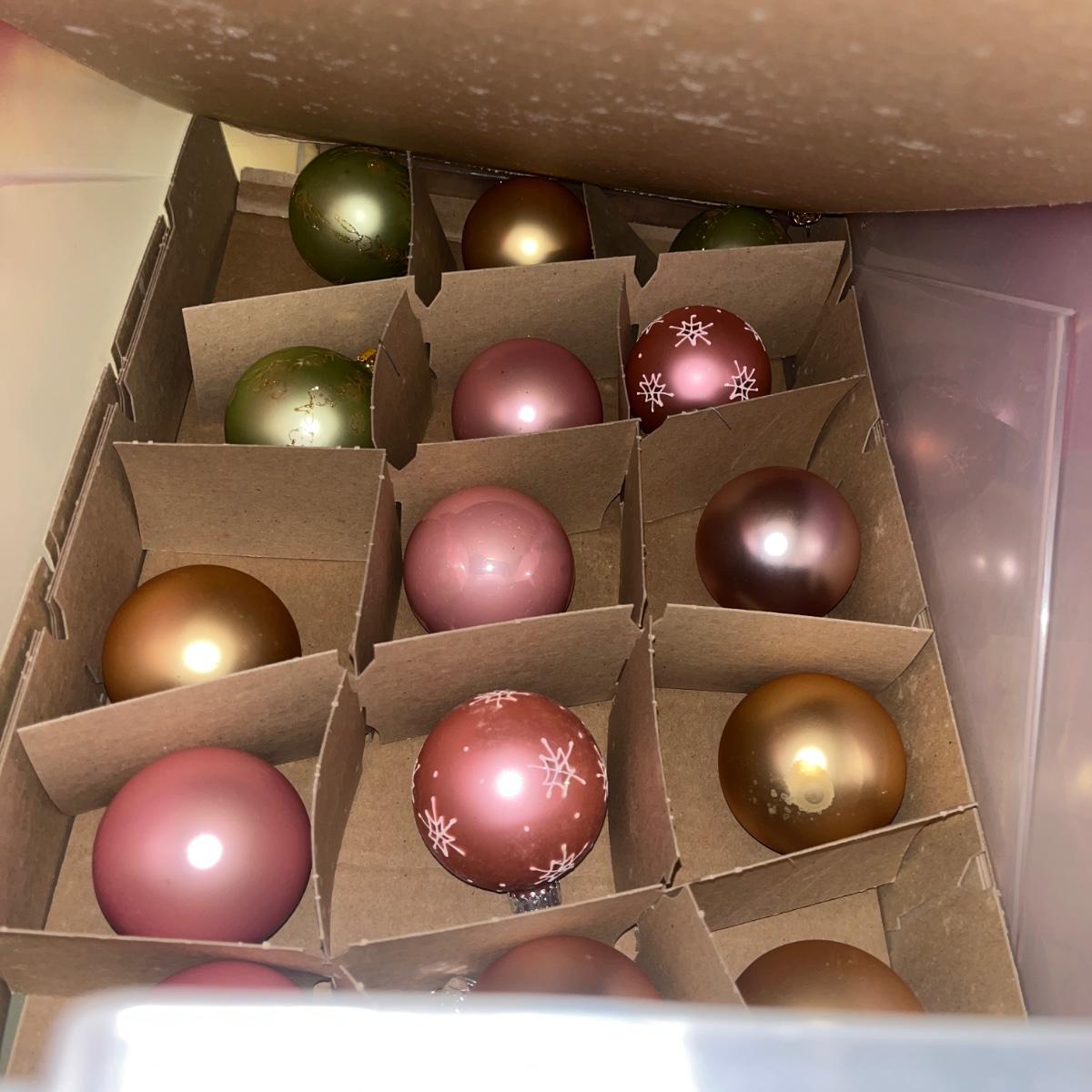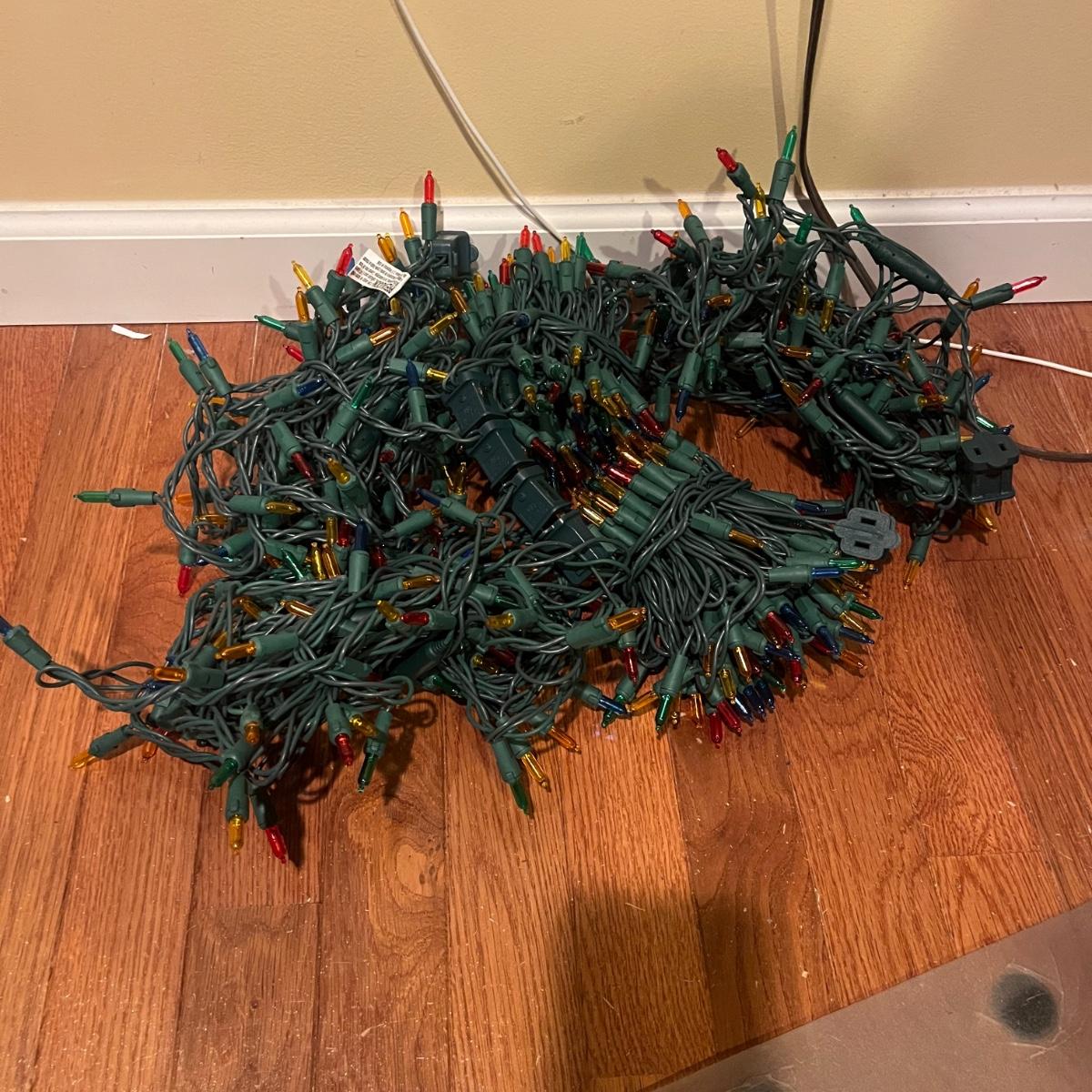 Lot includes over 50 loose Christmas ornaments in a variety of styles, sizes and shapes. Also includes five strings of colored lights with three packages of small ornaments and storage boxes. All strings of colored lights turned on when plugged in, we did not monitor individual bulbs. Surge protector seen in photos is not included, but available in lot 124. Boxes measure 22” x 15” x 12”H.