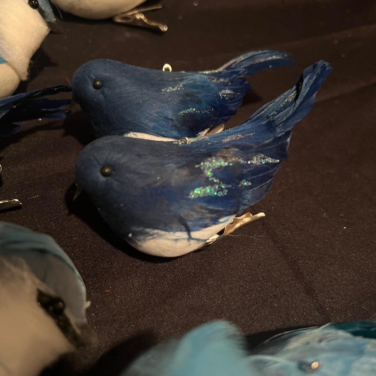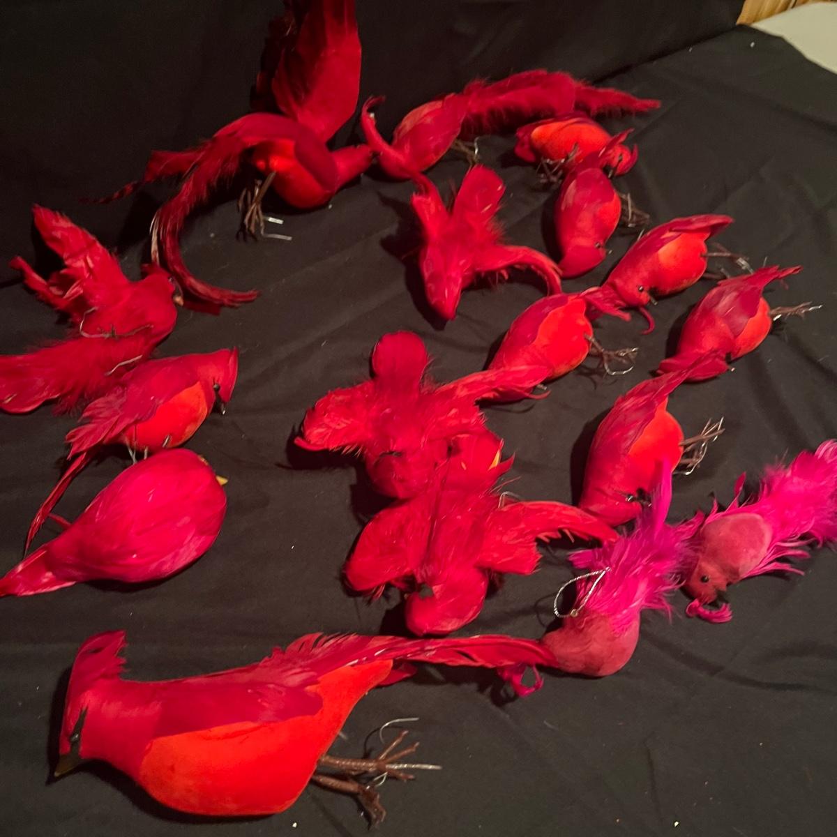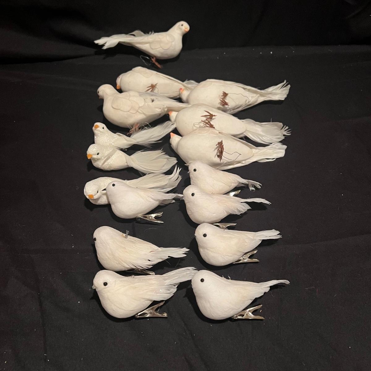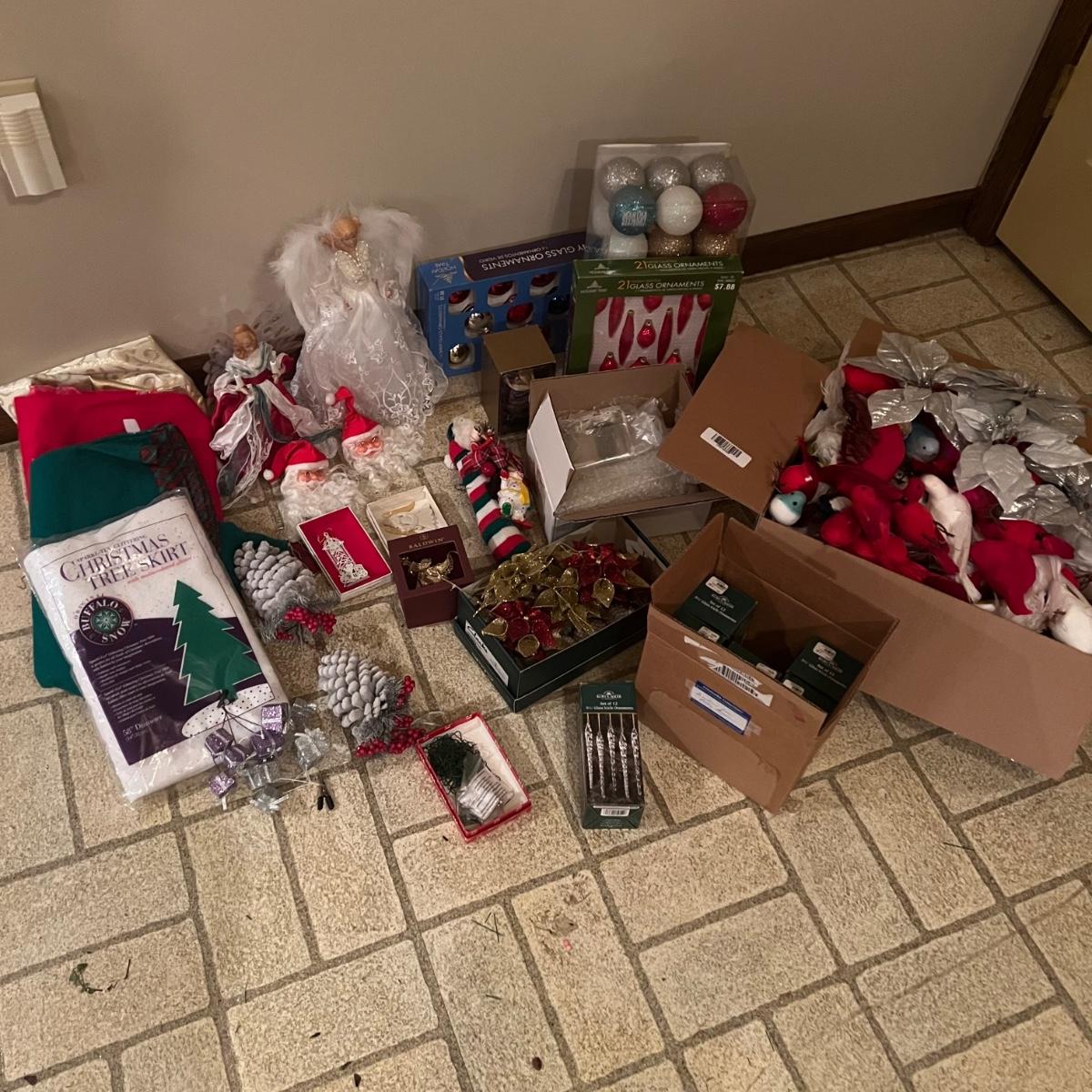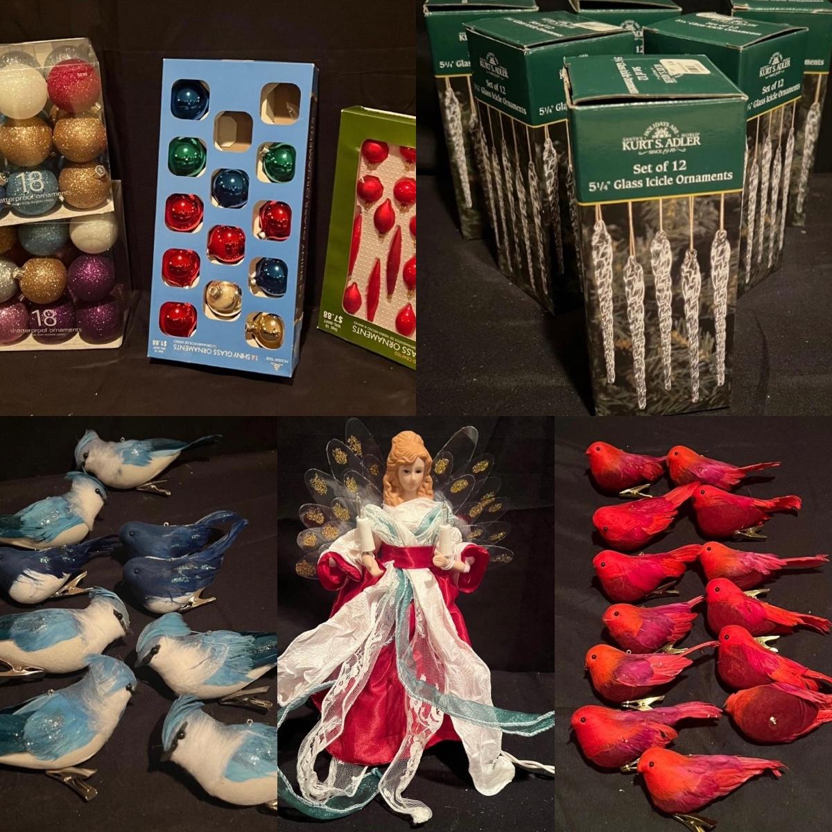 Three fabric Christmas tree skirts and one Sparkl-Tex glittering tree skirt, 58”D. Six silver poinsettia ornaments with clips and 13 red bird clip ornaments, each 4” X 2” X 2”H. Twenty red bird ornaments with feathers, each approximately 7” X 2” X 2”H. Fourteen white feathered birds, eight with clips and six with wire attachments. Sixteen white bird ornaments with wire or clip attachments. Three small brown bird ornaments and 10 yellow and black bird clip ornaments. Nine light and dark blue birds and 40 light blue bird clip ornaments and one white beaded ornament measuring approximately 3.5”D X 6”H. Two white pine cone ornaments and two Christmas box ornaments. Seventy-two 5.25” glass icicle ornaments. Three miscellaneous angel ornaments approximately 4”H. Four boxes of ornaments. A white angel tree topper measures 8”D X 14”H and a red light up angel that measures 5”D X 9”H. Five star ornaments measuring 5.5”D and 10 glass 2”D round ornaments and 2 silver bells. Approximately 100 unboxed 5.5” icicle ornaments. A box of ornament hooks and a ceramic egg ornament. Shipping available.