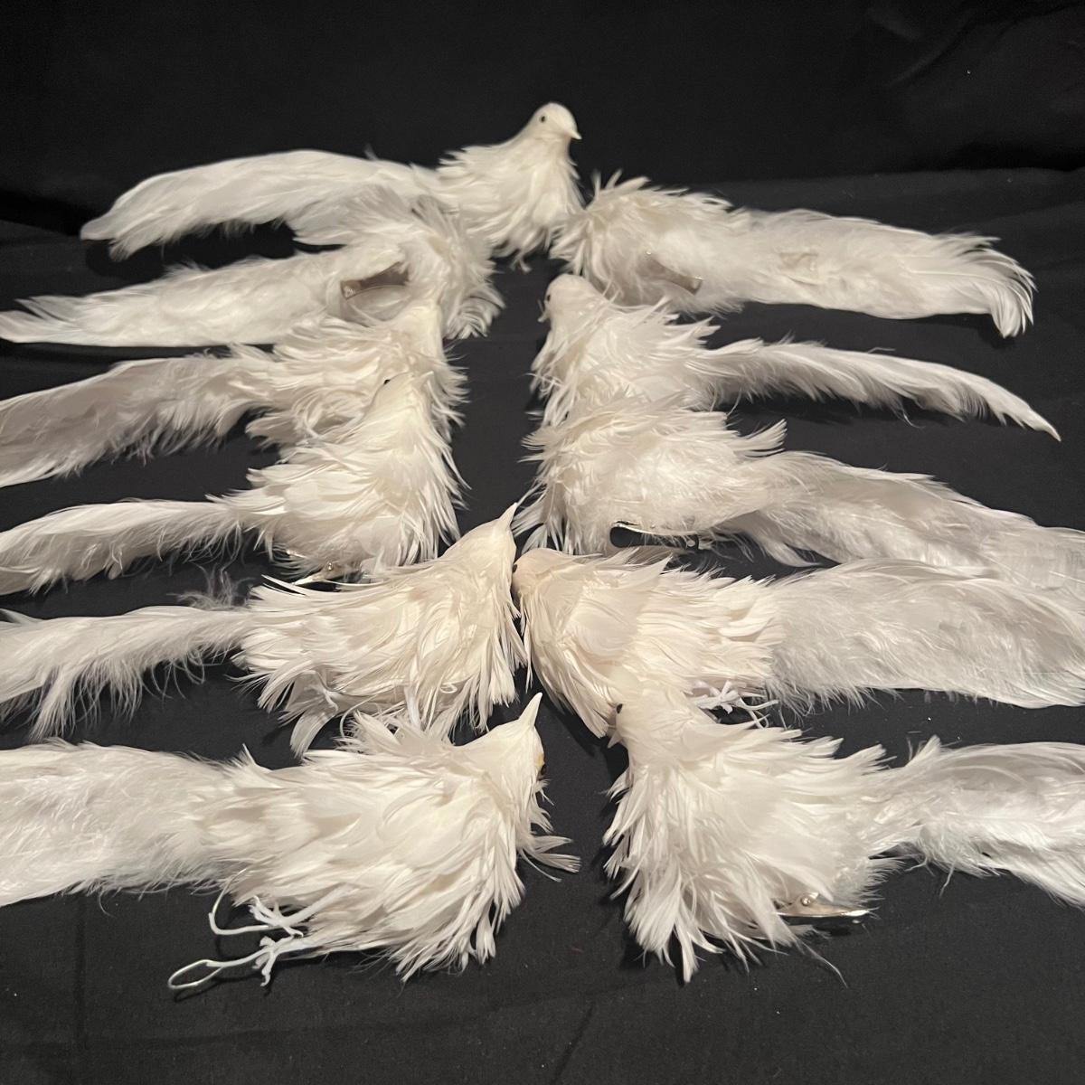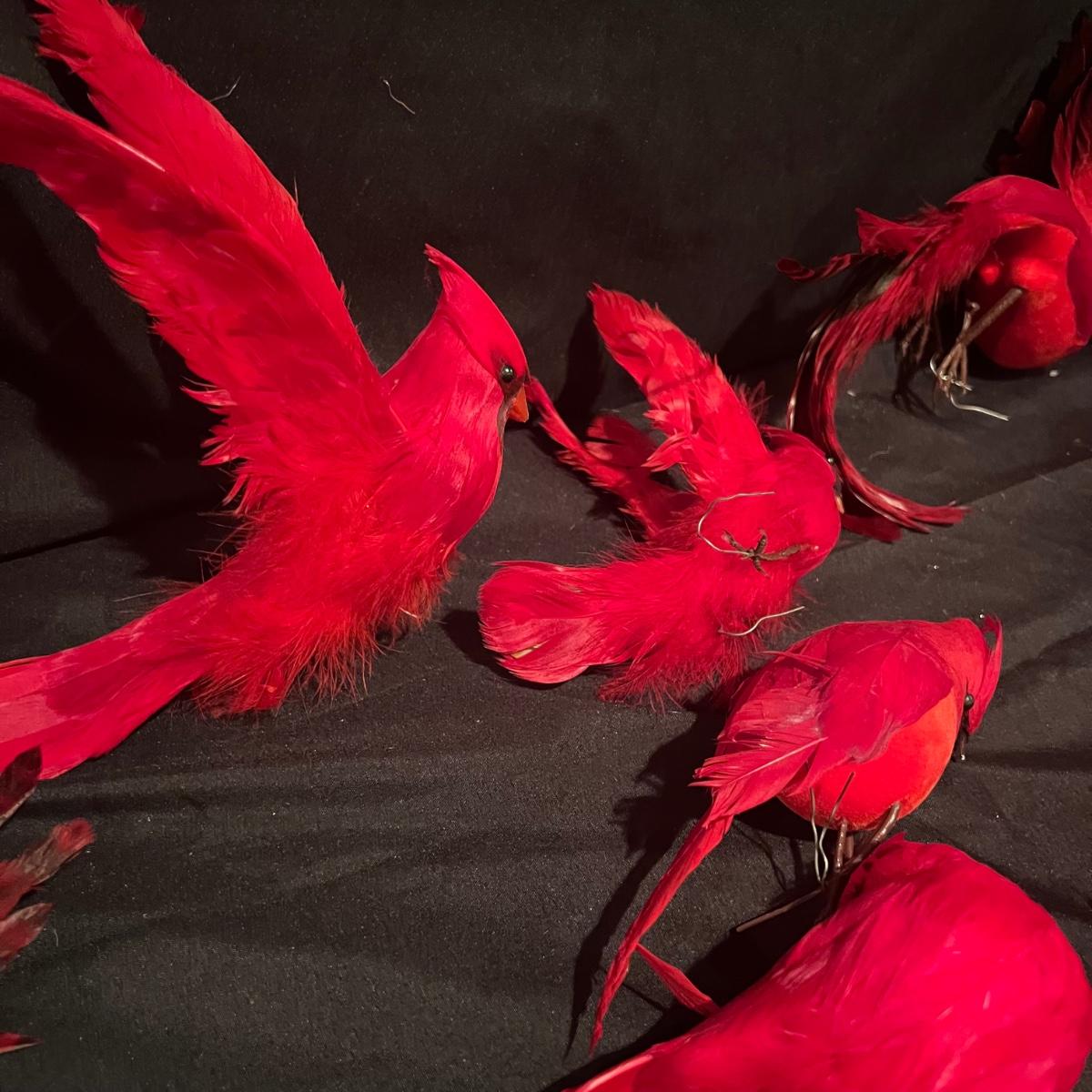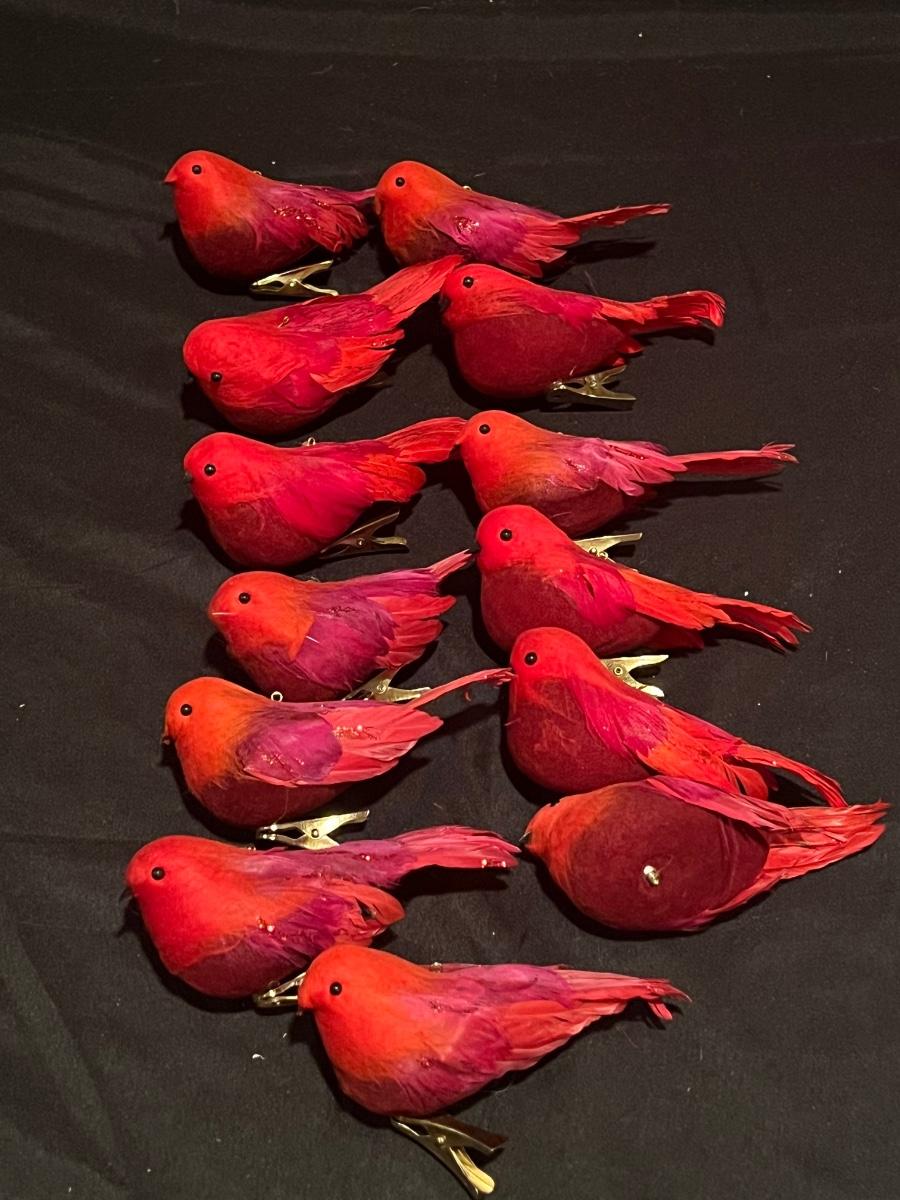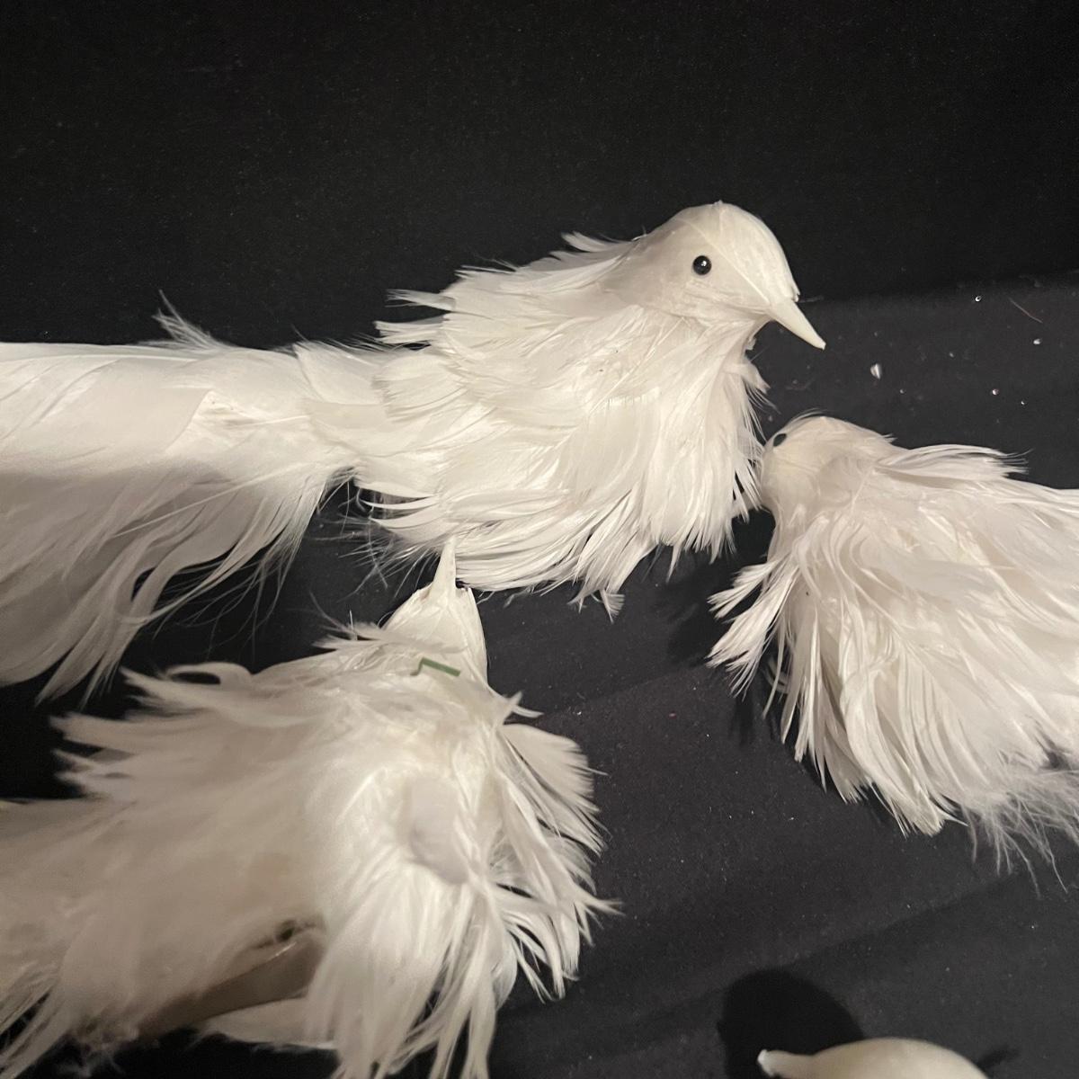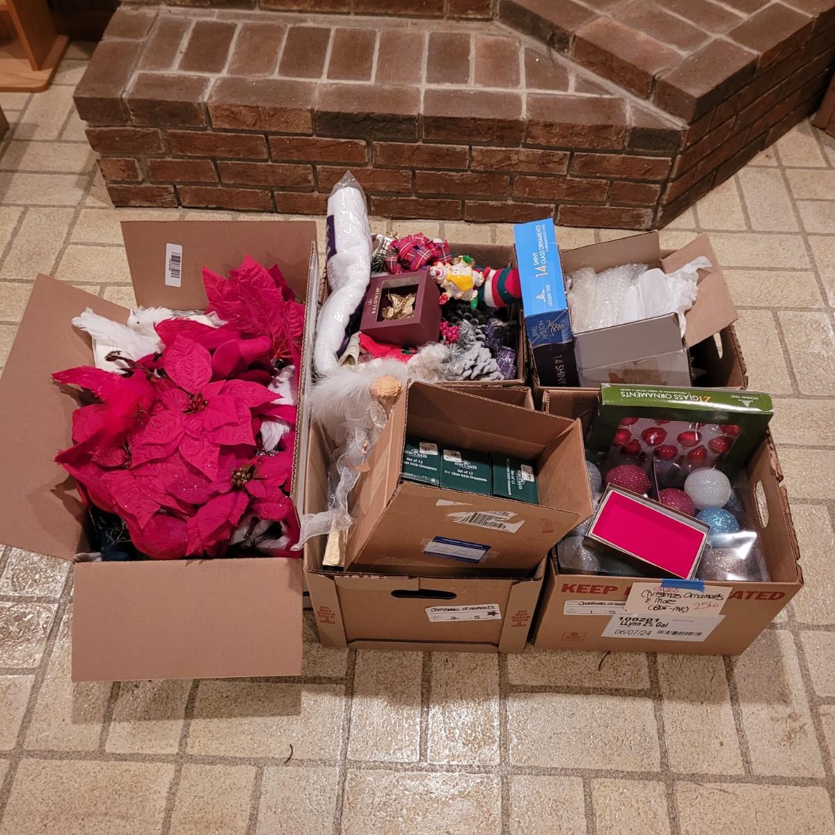 Three fabric Christmas tree skirts and one Sparkl-Tex glittering tree skirt, 58”D. Six silver poinsettia ornaments with clips and 13 red bird clip ornaments, each 4” X 2” X 2”H. Twenty red bird ornaments with feathers, each approximately 7” X 2” X 2”H. Fourteen white feathered birds, eight with clips and six with wire attachments. Sixteen white bird ornaments with wire or clip attachments. Three small brown bird ornaments and 10 yellow and black bird clip ornaments. Nine light and dark blue birds and 40 light blue bird clip ornaments and one white beaded ornament measuring approximately 3.5”D X 6”H. Two white pine cone ornaments and two Christmas box ornaments. Seventy-two 5.25” glass icicle ornaments. Three miscellaneous angel ornaments approximately 4”H. Four boxes of ornaments. A white angel tree topper measures 8”D X 14”H and a red light up angel that measures 5”D X 9”H. Five star ornaments measuring 5.5”D and 10 glass 2”D round ornaments and 2 silver bells. Approximately 100 unboxed 5.5” icicle ornaments. A box of ornament hooks and a ceramic egg ornament. Shipping available.