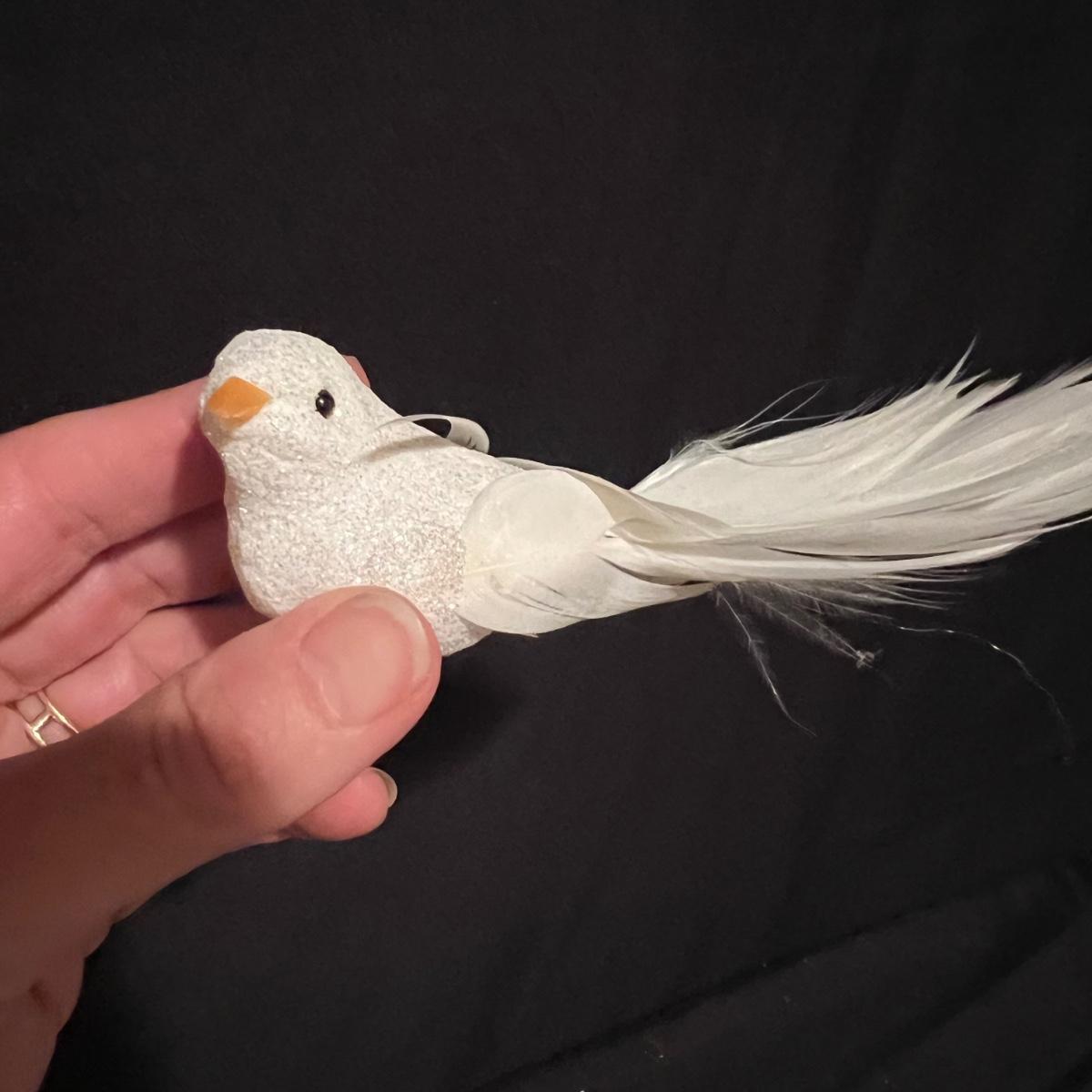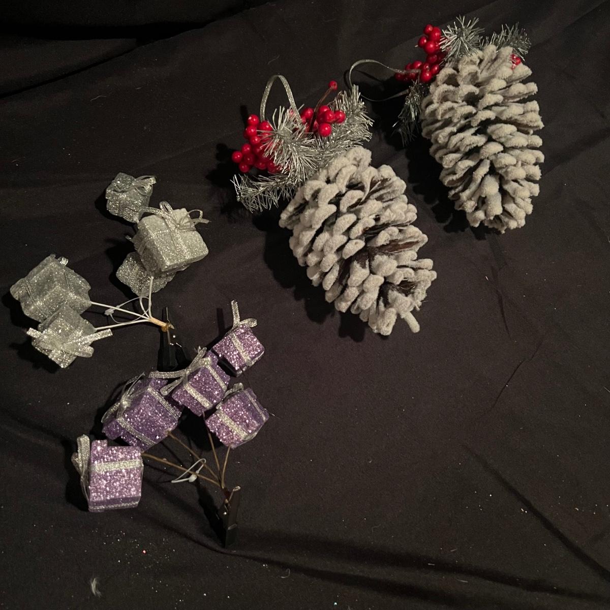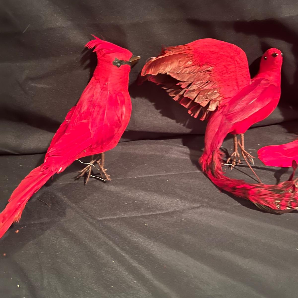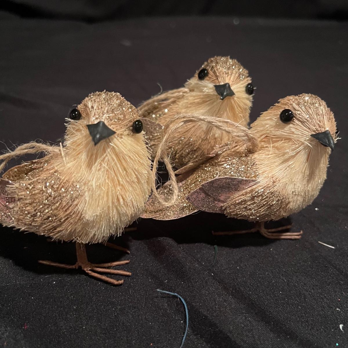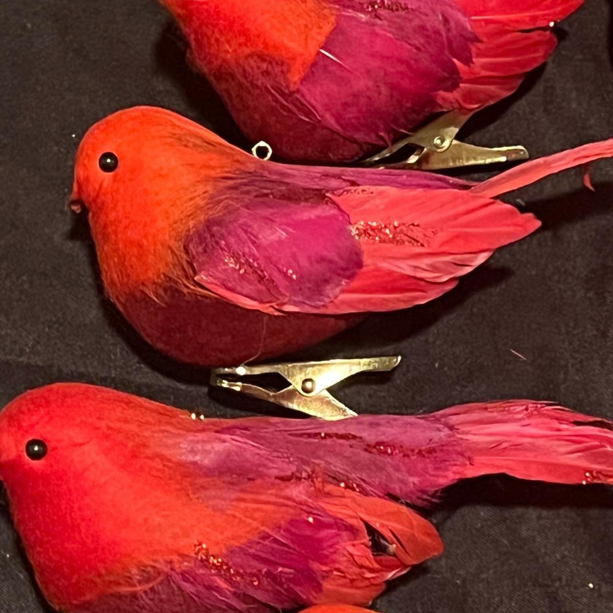 Three fabric Christmas tree skirts and one Sparkl-Tex glittering tree skirt, 58”D. Six silver poinsettia ornaments with clips and 13 red bird clip ornaments, each 4” X 2” X 2”H. Twenty red bird ornaments with feathers, each approximately 7” X 2” X 2”H. Fourteen white feathered birds, eight with clips and six with wire attachments. Sixteen white bird ornaments with wire or clip attachments. Three small brown bird ornaments and 10 yellow and black bird clip ornaments. Nine light and dark blue birds and 40 light blue bird clip ornaments and one white beaded ornament measuring approximately 3.5”D X 6”H. Two white pine cone ornaments and two Christmas box ornaments. Seventy-two 5.25” glass icicle ornaments. Three miscellaneous angel ornaments approximately 4”H. Four boxes of ornaments. A white angel tree topper measures 8”D X 14”H and a red light up angel that measures 5”D X 9”H. Five star ornaments measuring 5.5”D and 10 glass 2”D round ornaments and 2 silver bells. Approximately 100 unboxed 5.5” icicle ornaments. A box of ornament hooks and a ceramic egg ornament. Shipping available.