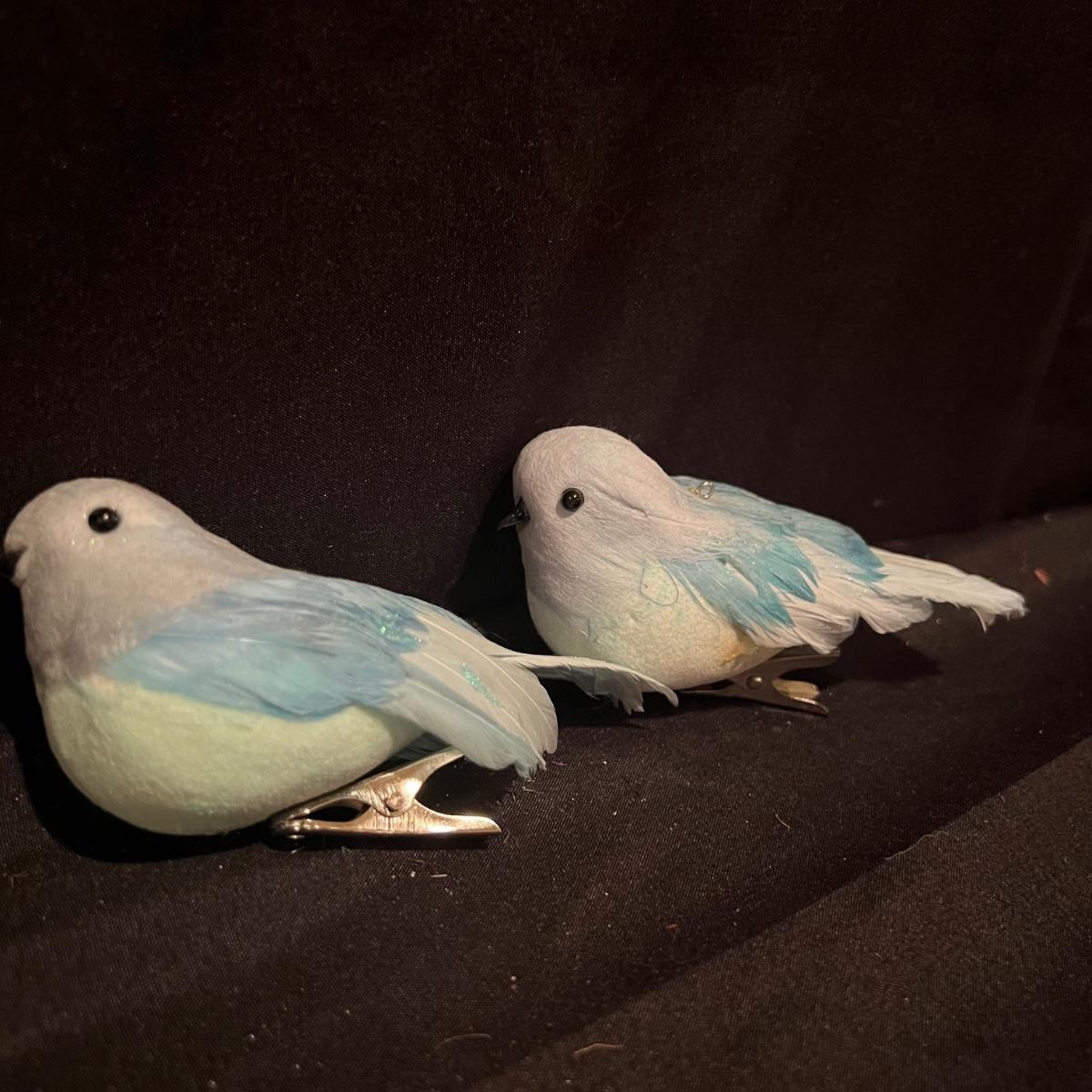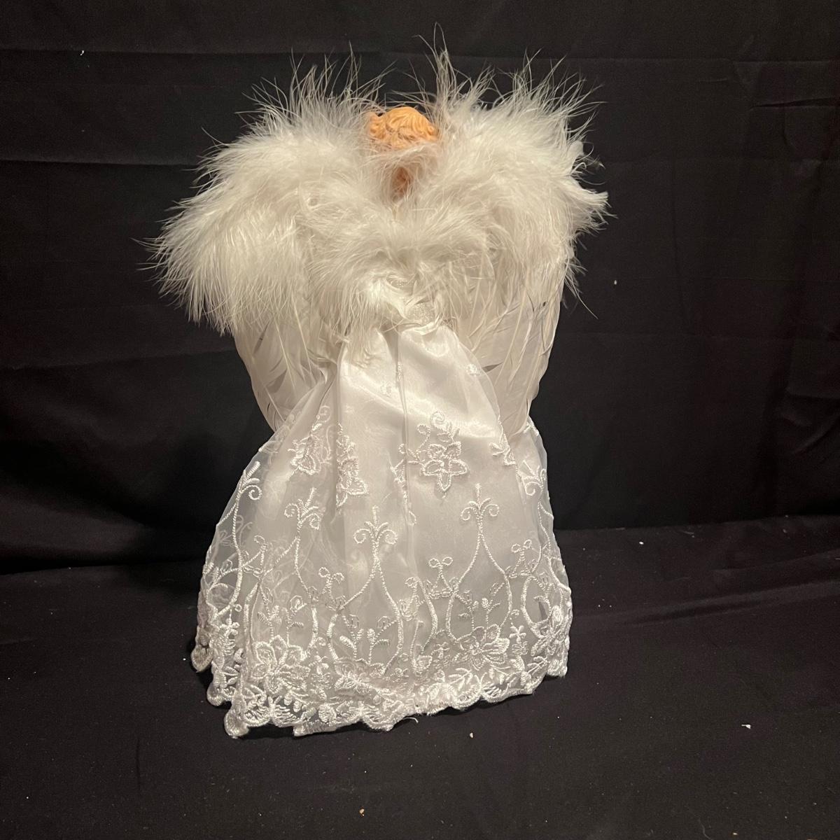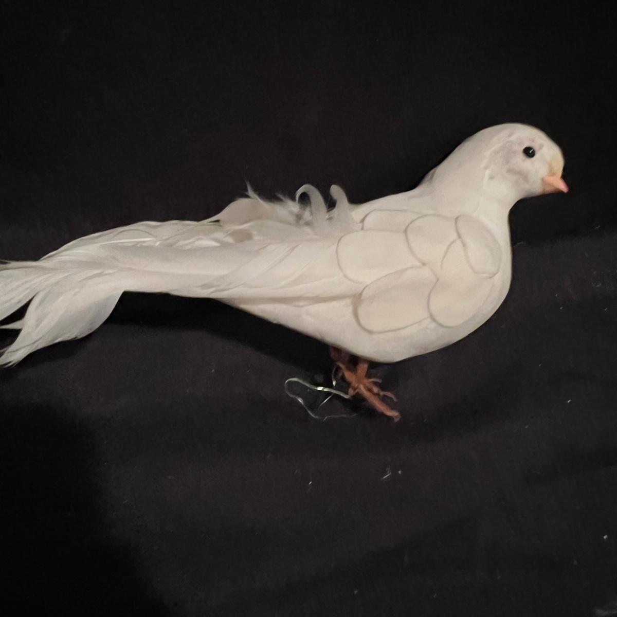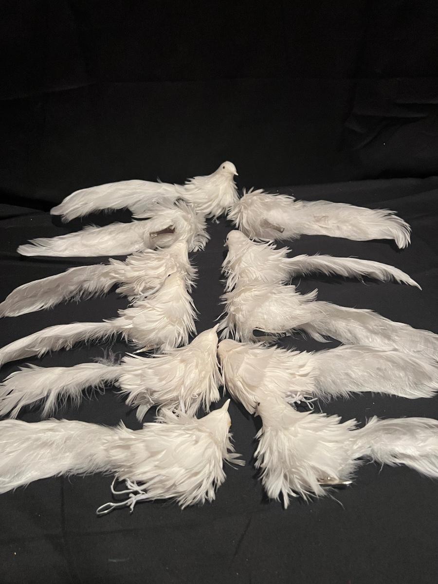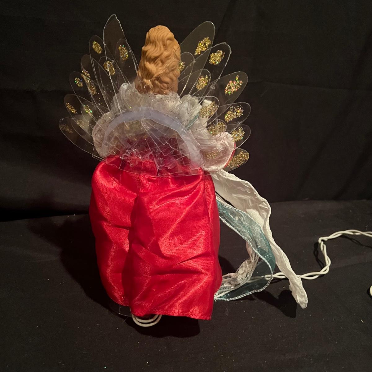 Three fabric Christmas tree skirts and one Sparkl-Tex glittering tree skirt, 58”D. Six silver poinsettia ornaments with clips and 13 red bird clip ornaments, each 4” X 2” X 2”H. Twenty red bird ornaments with feathers, each approximately 7” X 2” X 2”H. Fourteen white feathered birds, eight with clips and six with wire attachments. Sixteen white bird ornaments with wire or clip attachments. Three small brown bird ornaments and 10 yellow and black bird clip ornaments. Nine light and dark blue birds and 40 light blue bird clip ornaments and one white beaded ornament measuring approximately 3.5”D X 6”H. Two white pine cone ornaments and two Christmas box ornaments. Seventy-two 5.25” glass icicle ornaments. Three miscellaneous angel ornaments approximately 4”H. Four boxes of ornaments. A white angel tree topper measures 8”D X 14”H and a red light up angel that measures 5”D X 9”H. Five star ornaments measuring 5.5”D and 10 glass 2”D round ornaments and 2 silver bells. Approximately 100 unboxed 5.5” icicle ornaments. A box of ornament hooks and a ceramic egg ornament. Shipping available.