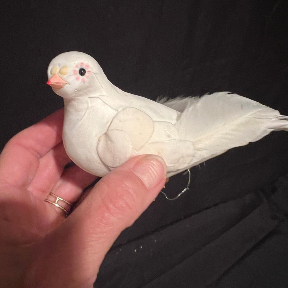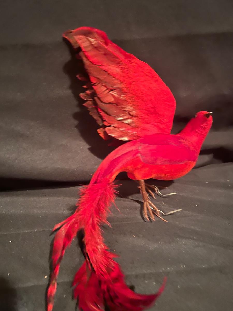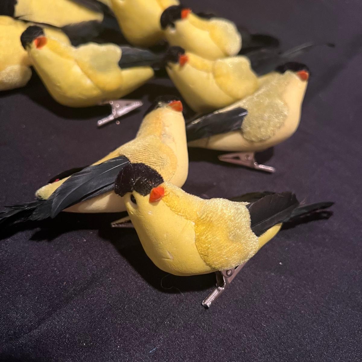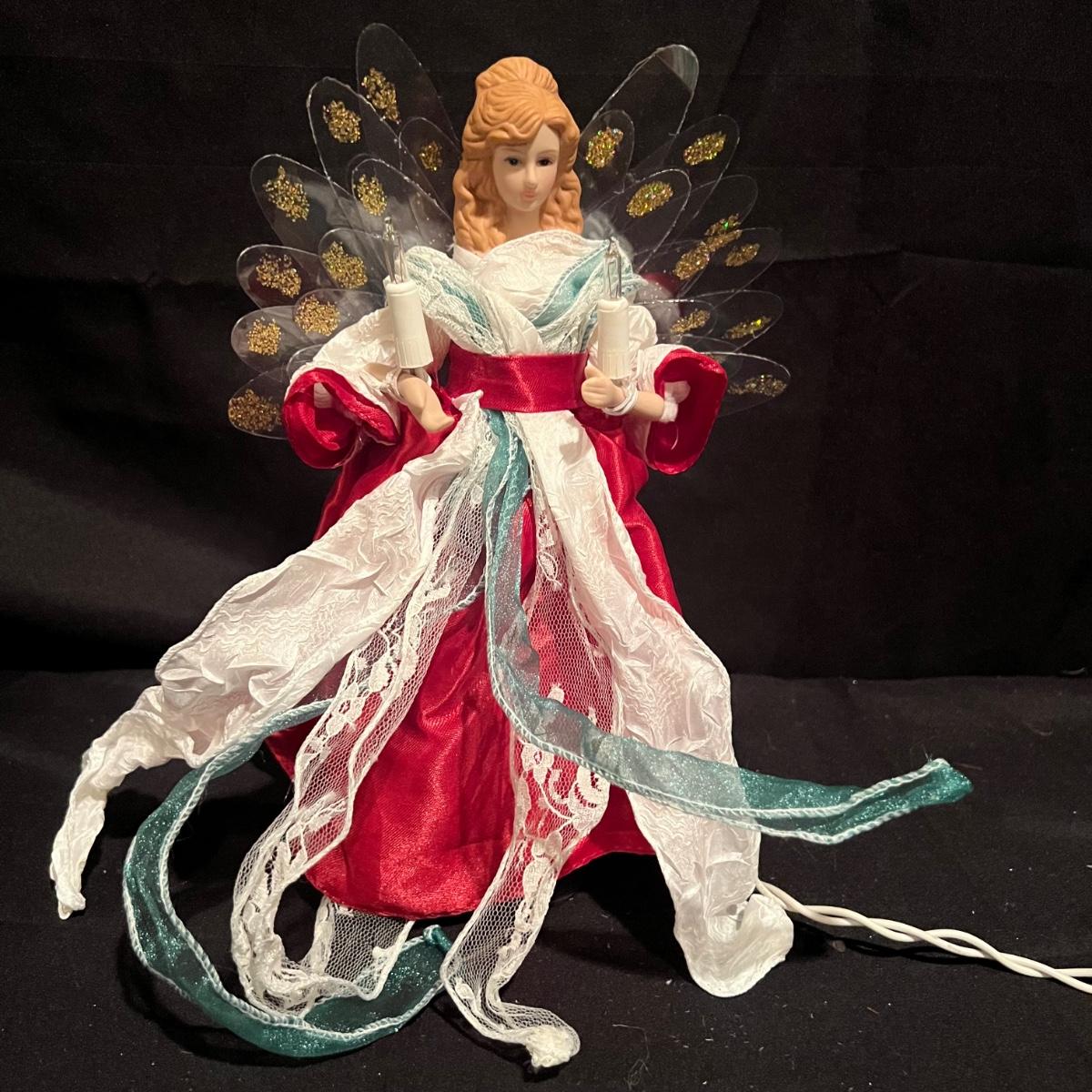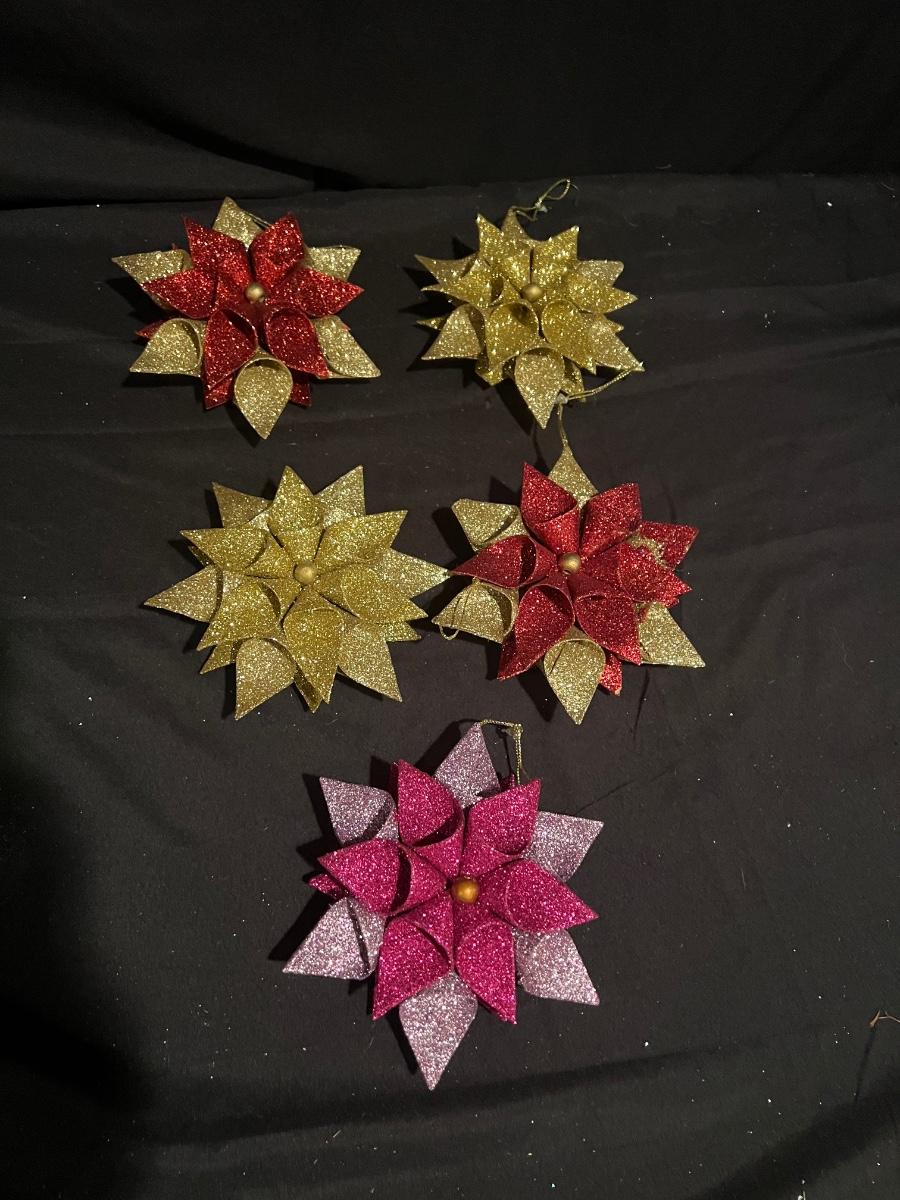 Three fabric Christmas tree skirts and one Sparkl-Tex glittering tree skirt, 58”D. Six silver poinsettia ornaments with clips and 13 red bird clip ornaments, each 4” X 2” X 2”H. Twenty red bird ornaments with feathers, each approximately 7” X 2” X 2”H. Fourteen white feathered birds, eight with clips and six with wire attachments. Sixteen white bird ornaments with wire or clip attachments. Three small brown bird ornaments and 10 yellow and black bird clip ornaments. Nine light and dark blue birds and 40 light blue bird clip ornaments and one white beaded ornament measuring approximately 3.5”D X 6”H. Two white pine cone ornaments and two Christmas box ornaments. Seventy-two 5.25” glass icicle ornaments. Three miscellaneous angel ornaments approximately 4”H. Four boxes of ornaments. A white angel tree topper measures 8”D X 14”H and a red light up angel that measures 5”D X 9”H. Five star ornaments measuring 5.5”D and 10 glass 2”D round ornaments and 2 silver bells. Approximately 100 unboxed 5.5” icicle ornaments. A box of ornament hooks and a ceramic egg ornament. Shipping available.