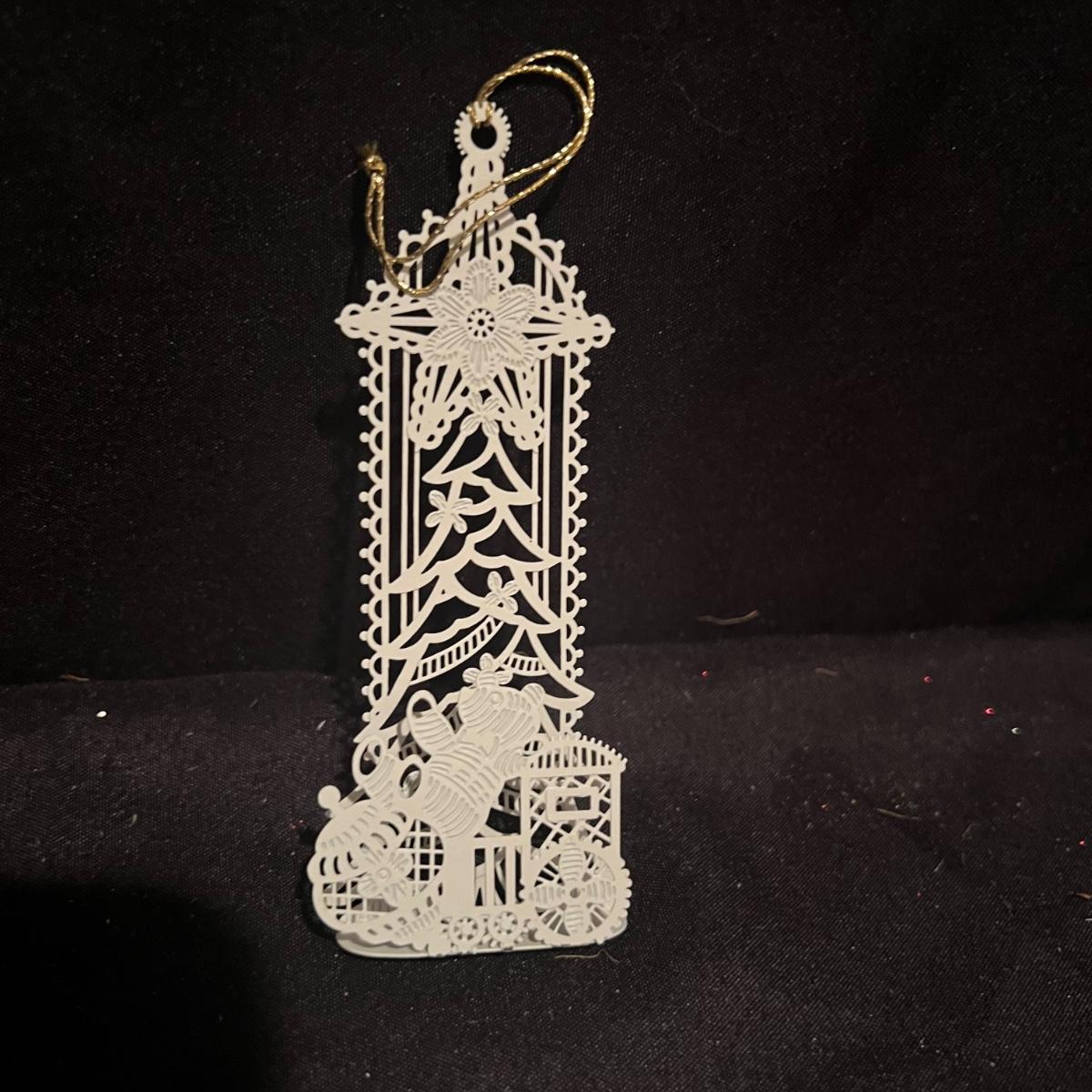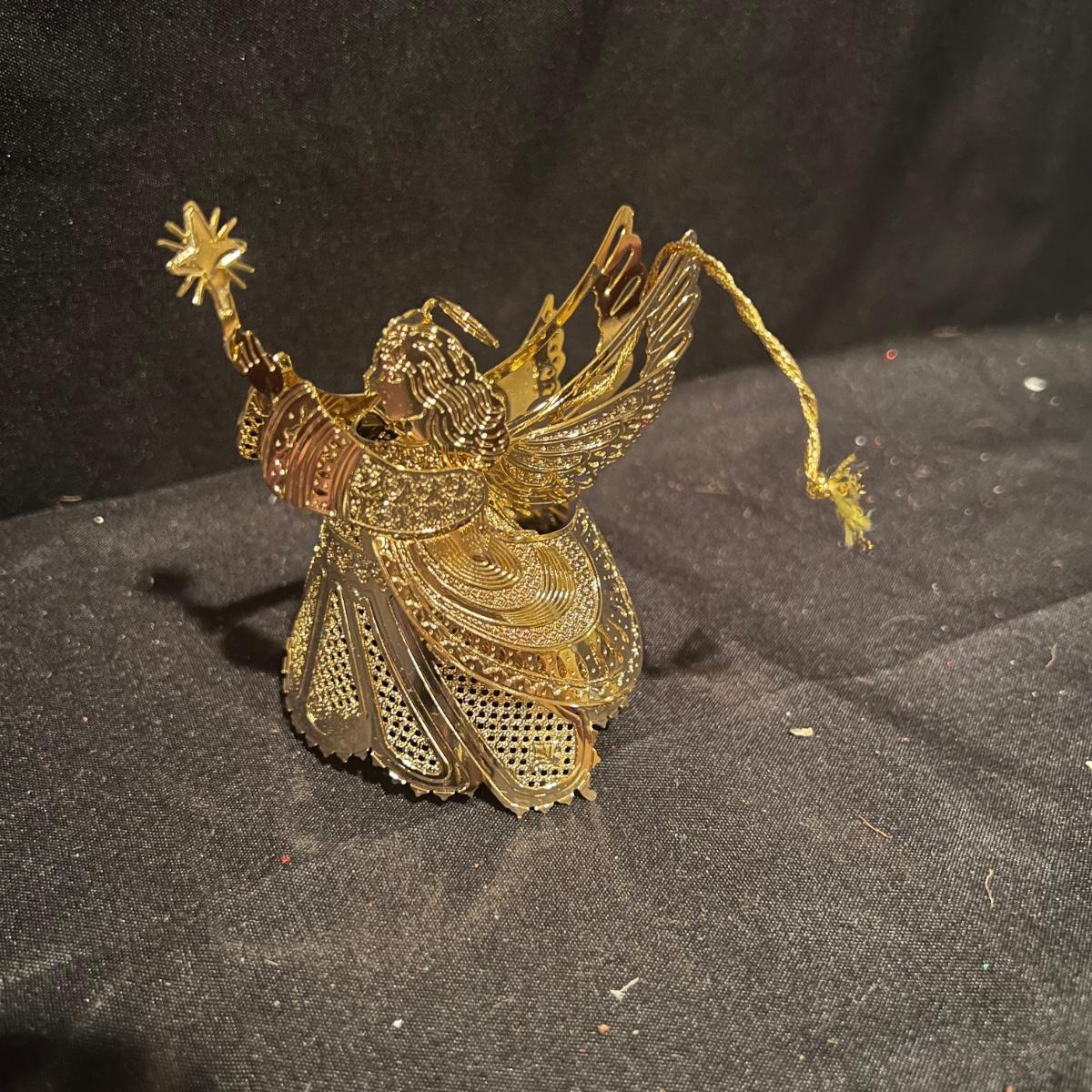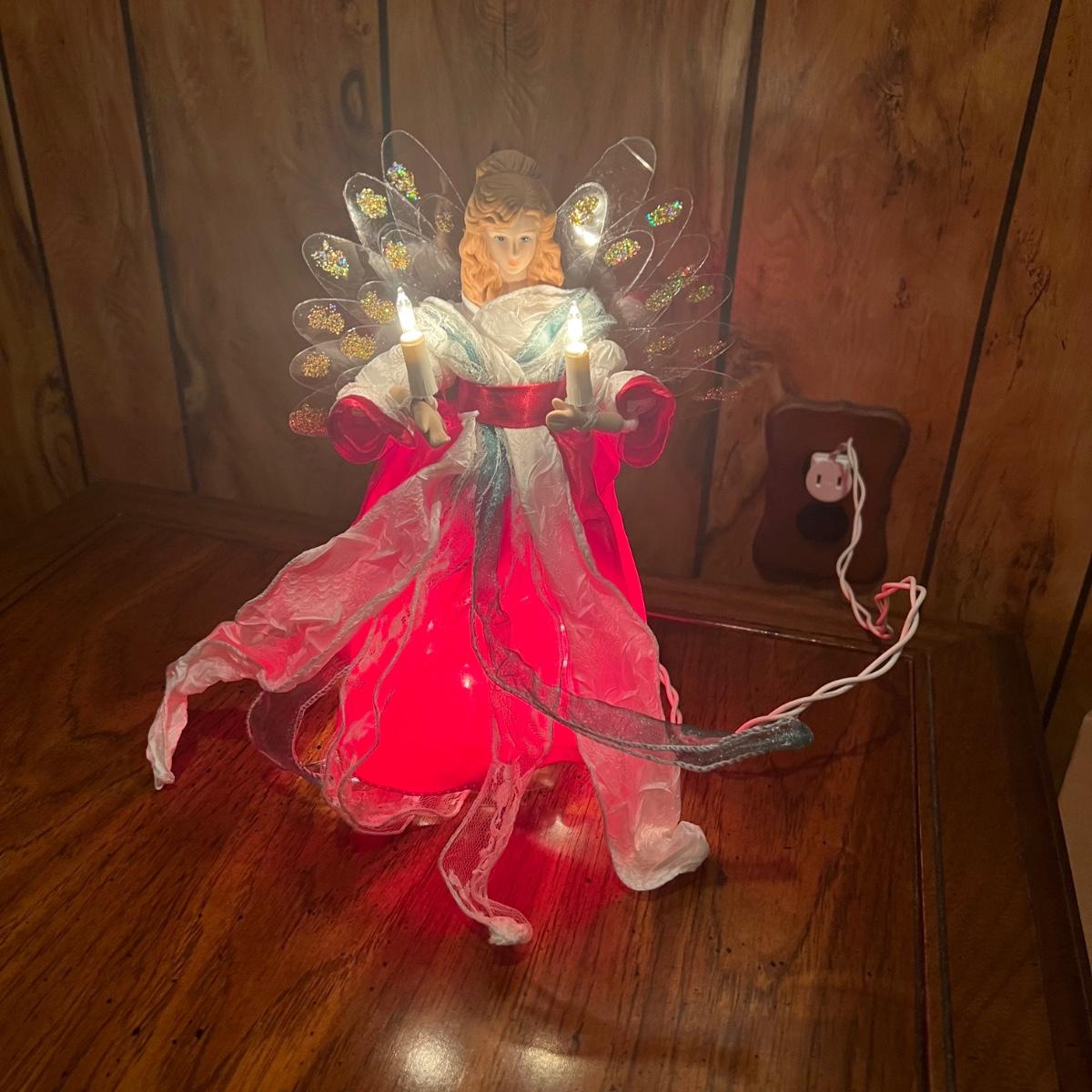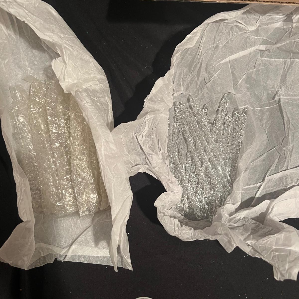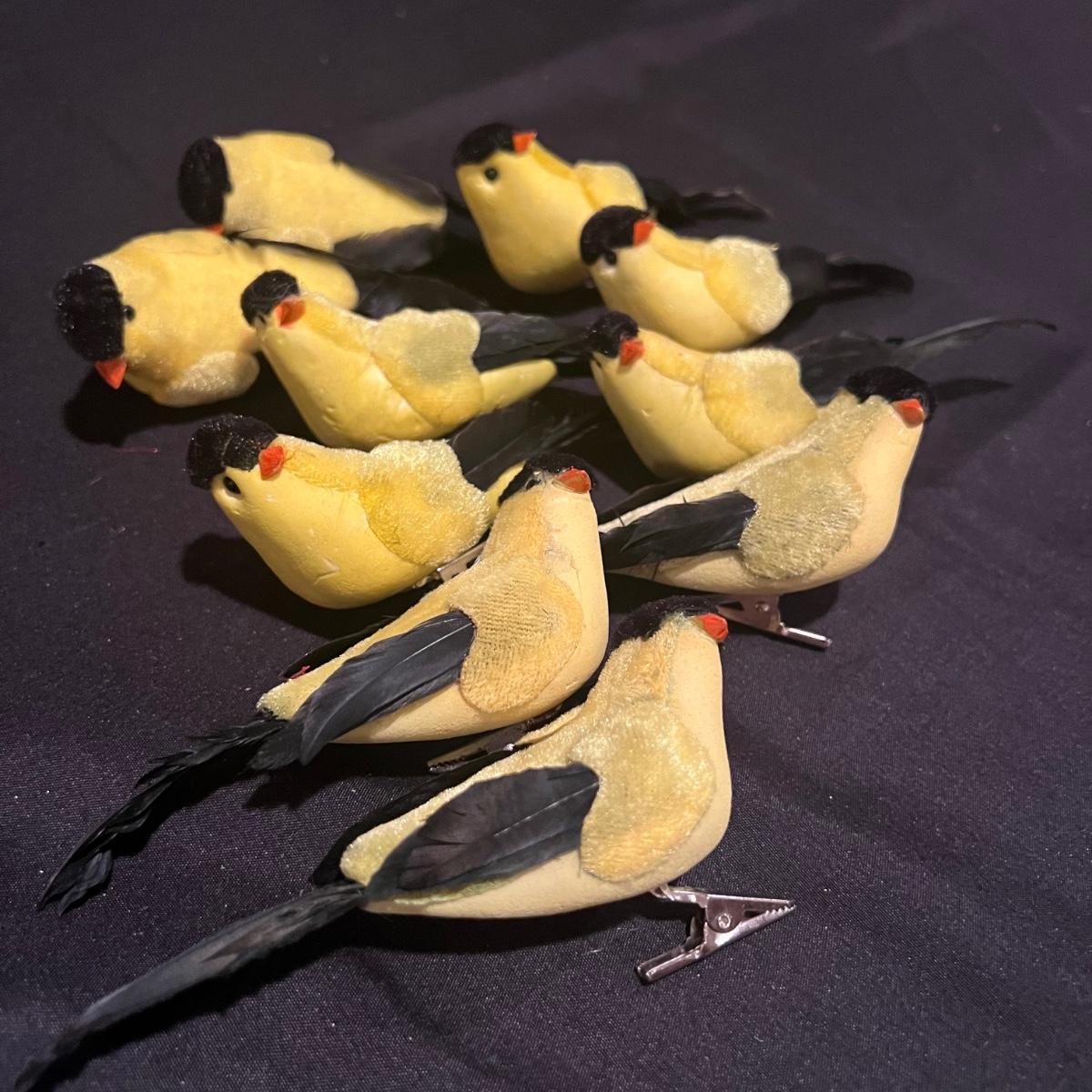 Three fabric Christmas tree skirts and one Sparkl-Tex glittering tree skirt, 58”D. Six silver poinsettia ornaments with clips and 13 red bird clip ornaments, each 4” X 2” X 2”H. Twenty red bird ornaments with feathers, each approximately 7” X 2” X 2”H. Fourteen white feathered birds, eight with clips and six with wire attachments. Sixteen white bird ornaments with wire or clip attachments. Three small brown bird ornaments and 10 yellow and black bird clip ornaments. Nine light and dark blue birds and 40 light blue bird clip ornaments and one white beaded ornament measuring approximately 3.5”D X 6”H. Two white pine cone ornaments and two Christmas box ornaments. Seventy-two 5.25” glass icicle ornaments. Three miscellaneous angel ornaments approximately 4”H. Four boxes of ornaments. A white angel tree topper measures 8”D X 14”H and a red light up angel that measures 5”D X 9”H. Five star ornaments measuring 5.5”D and 10 glass 2”D round ornaments and 2 silver bells. Approximately 100 unboxed 5.5” icicle ornaments. A box of ornament hooks and a ceramic egg ornament. Shipping available.