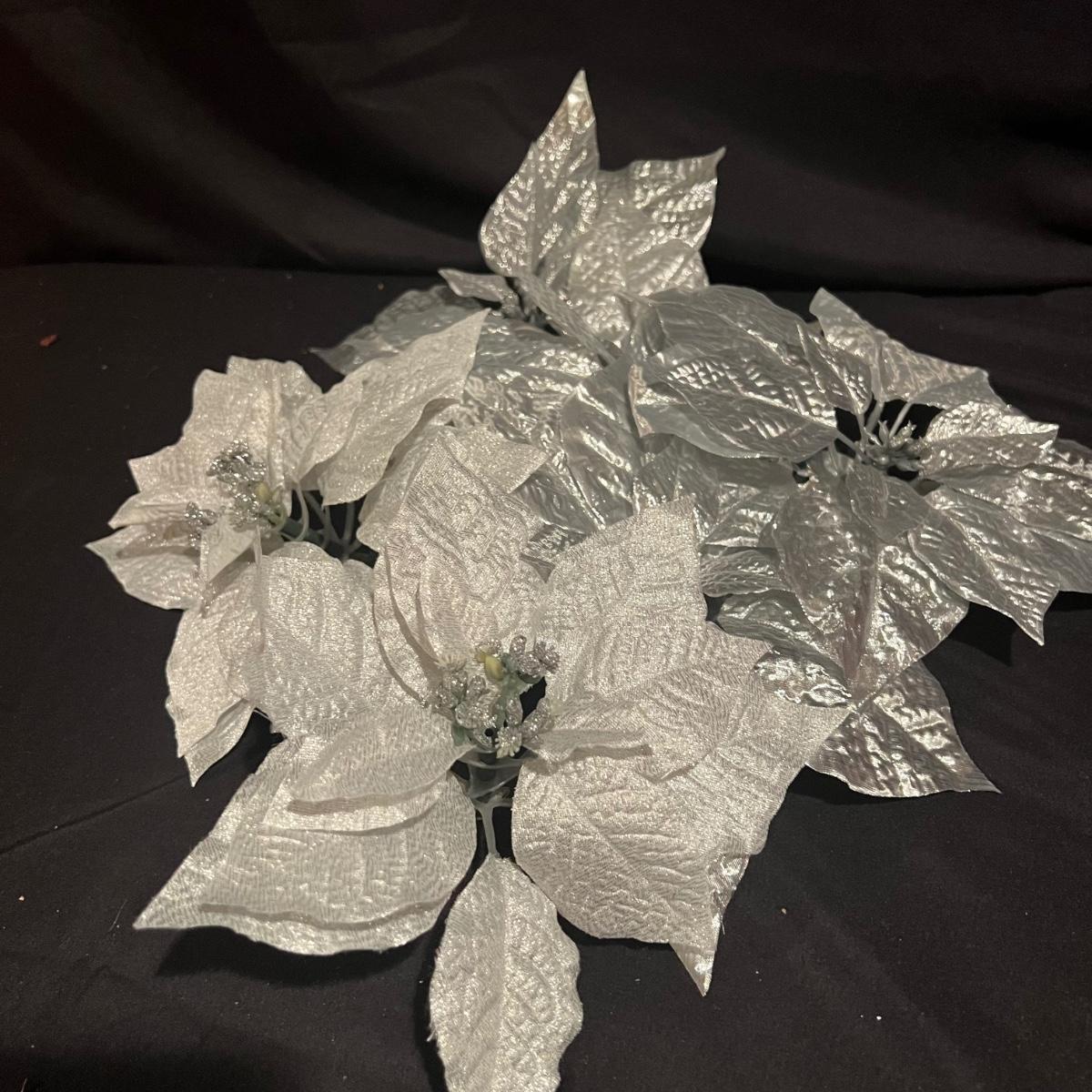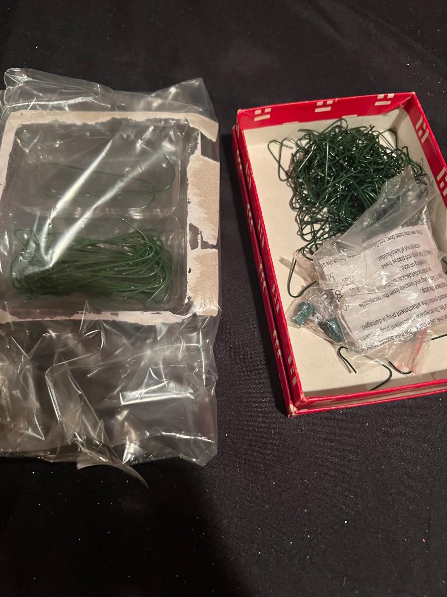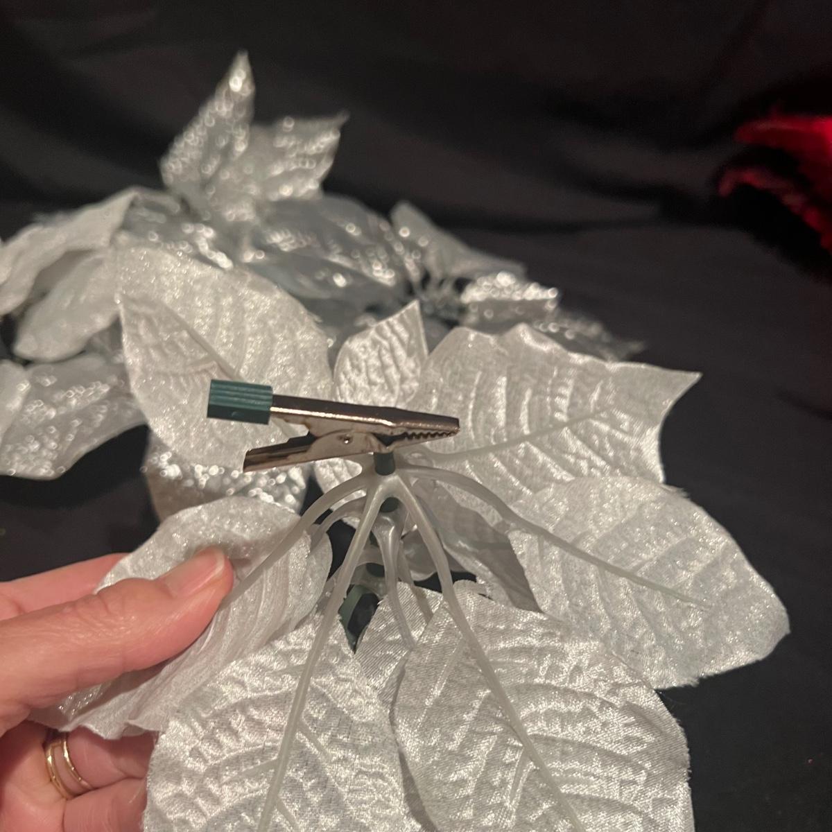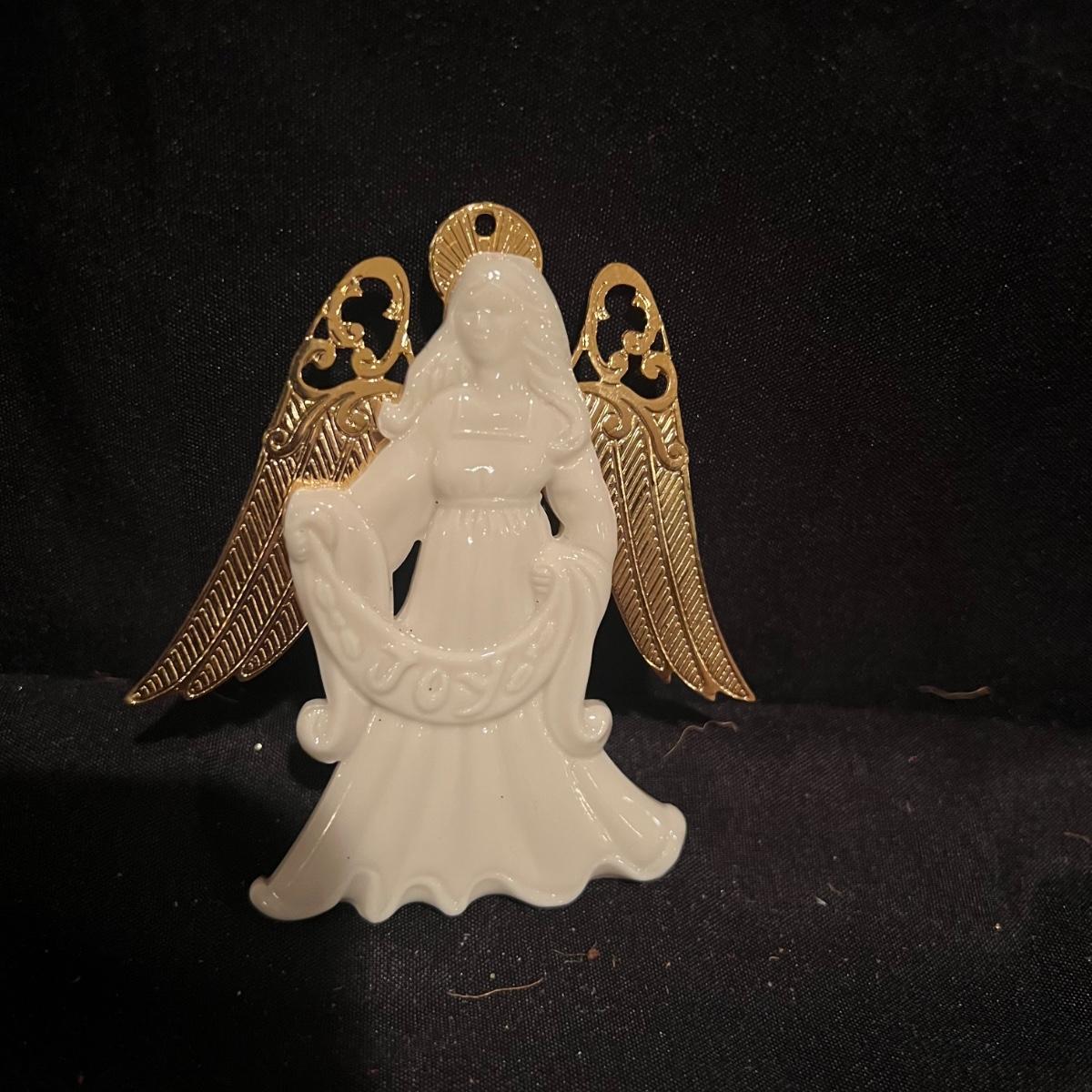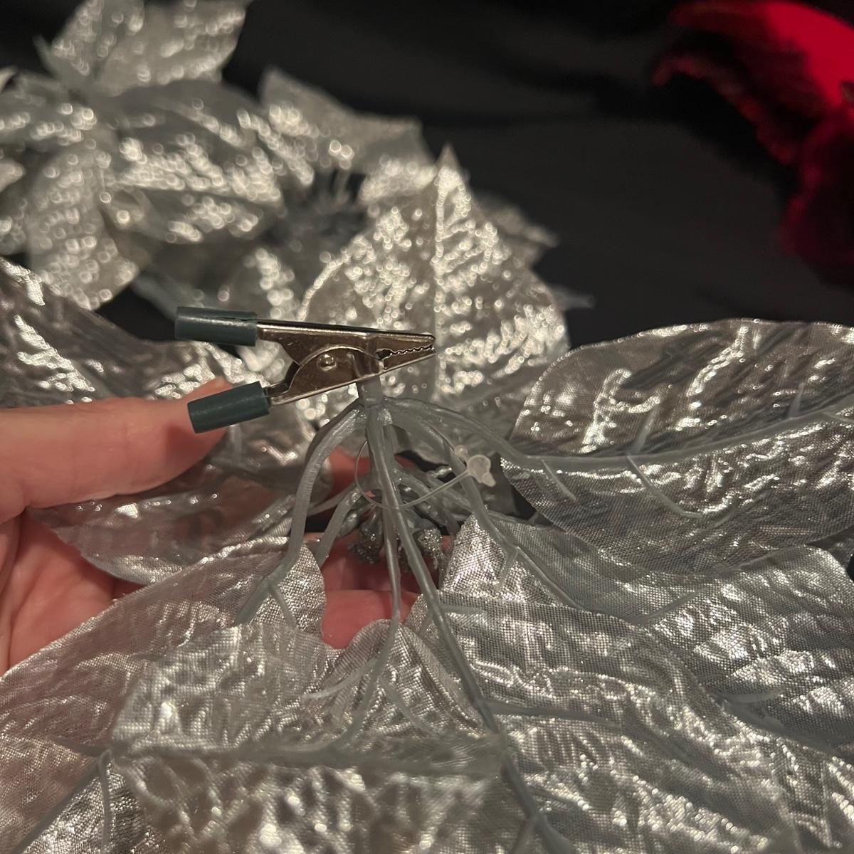 Three fabric Christmas tree skirts and one Sparkl-Tex glittering tree skirt, 58”D. Six silver poinsettia ornaments with clips and 13 red bird clip ornaments, each 4” X 2” X 2”H. Twenty red bird ornaments with feathers, each approximately 7” X 2” X 2”H. Fourteen white feathered birds, eight with clips and six with wire attachments. Sixteen white bird ornaments with wire or clip attachments. Three small brown bird ornaments and 10 yellow and black bird clip ornaments. Nine light and dark blue birds and 40 light blue bird clip ornaments and one white beaded ornament measuring approximately 3.5”D X 6”H. Two white pine cone ornaments and two Christmas box ornaments. Seventy-two 5.25” glass icicle ornaments. Three miscellaneous angel ornaments approximately 4”H. Four boxes of ornaments. A white angel tree topper measures 8”D X 14”H and a red light up angel that measures 5”D X 9”H. Five star ornaments measuring 5.5”D and 10 glass 2”D round ornaments and 2 silver bells. Approximately 100 unboxed 5.5” icicle ornaments. A box of ornament hooks and a ceramic egg ornament. Shipping available.