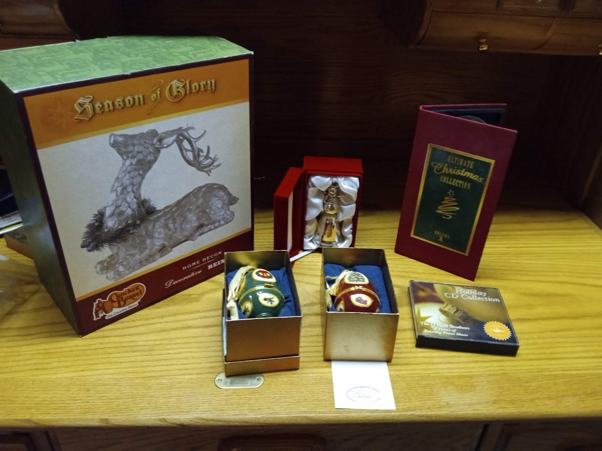 CHRISTMAS ORNAMENTS, MUSIC ON CD AND REINDEER DECOR