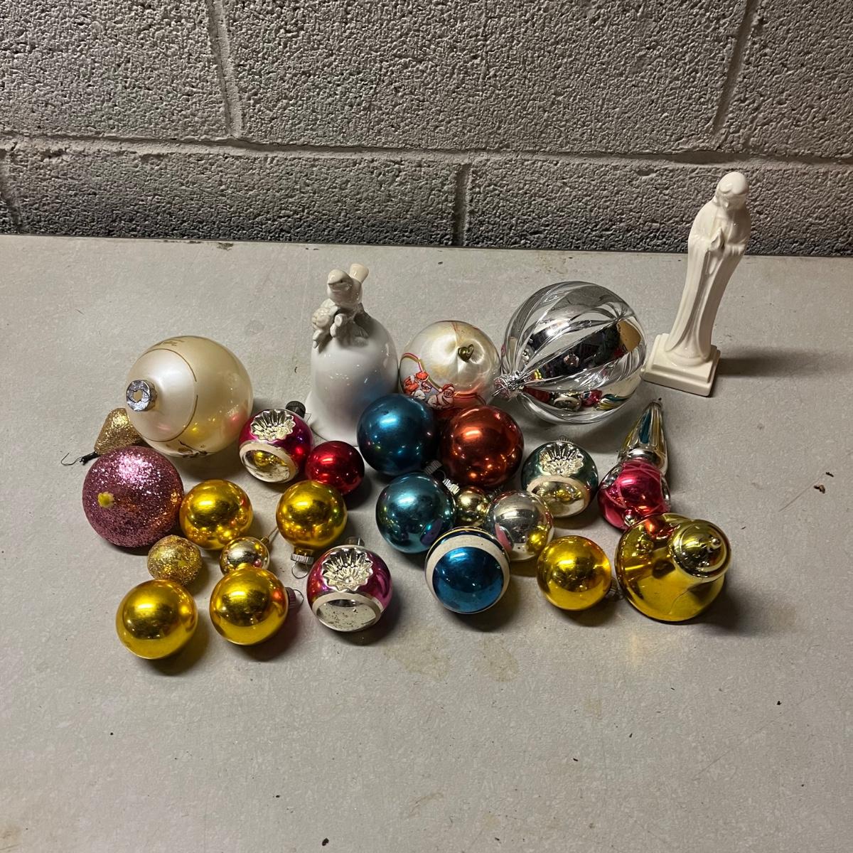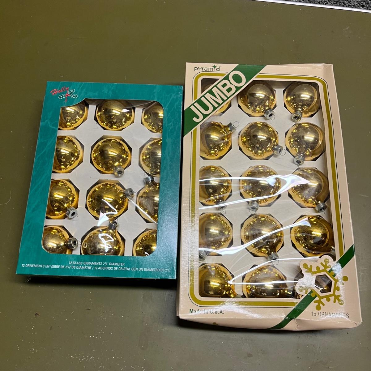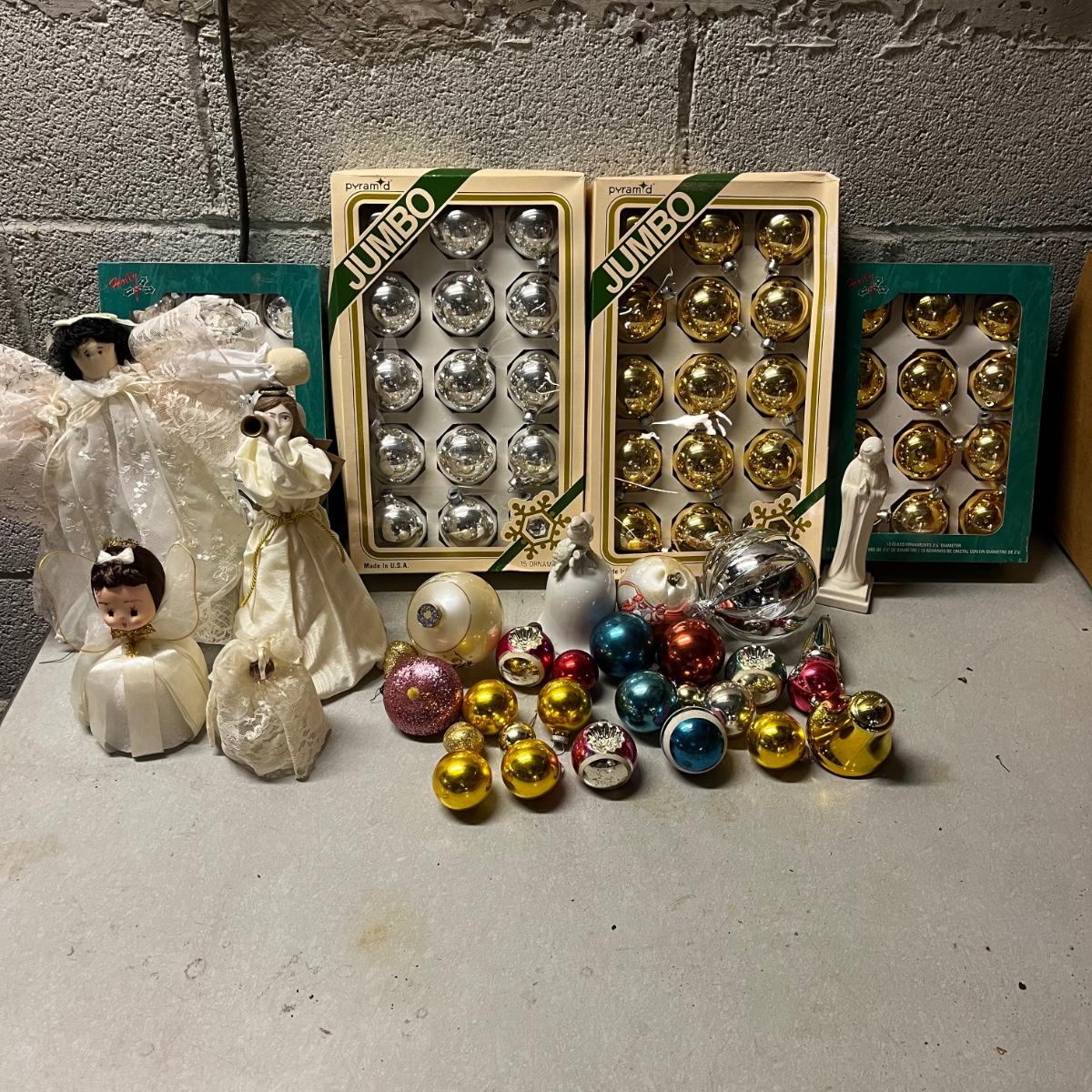Lot includes twenty seven gold colored and twenty seven silver colored glass ornaments, two angel tree toppers and some assorted ornaments.