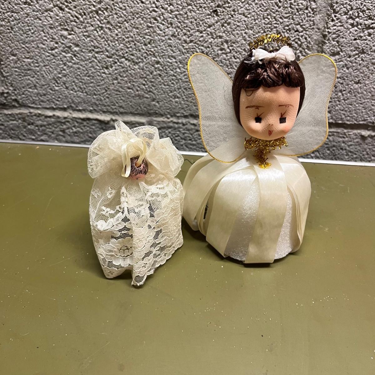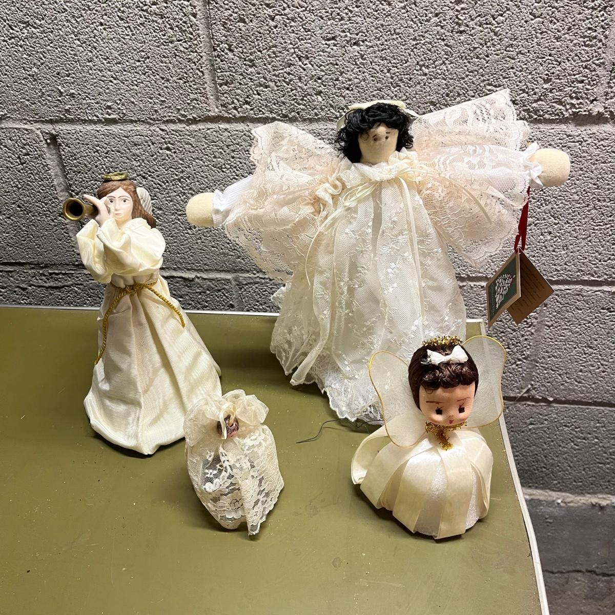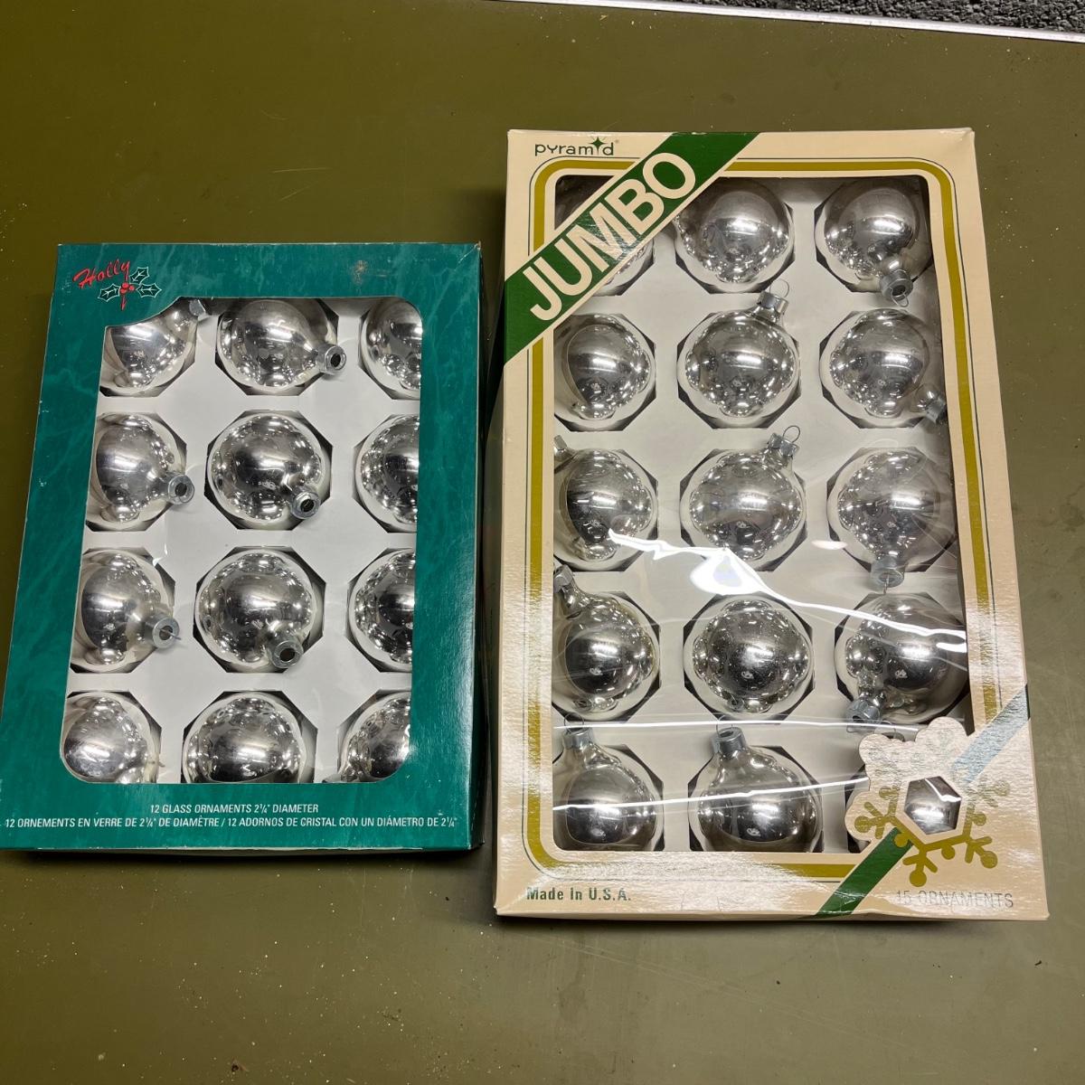 Lot includes twenty seven gold colored and twenty seven silver colored glass ornaments, two angel tree toppers and some assorted ornaments.