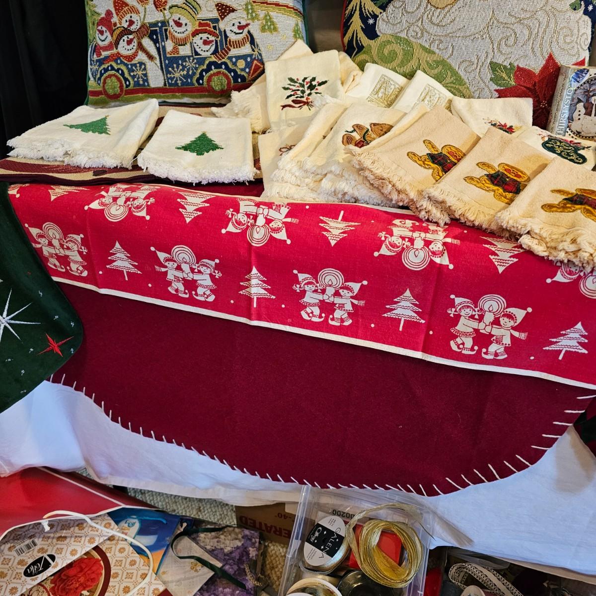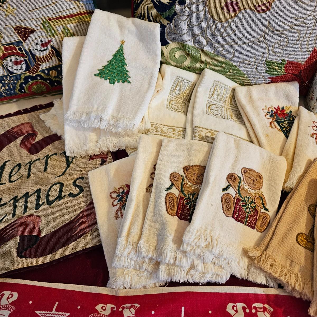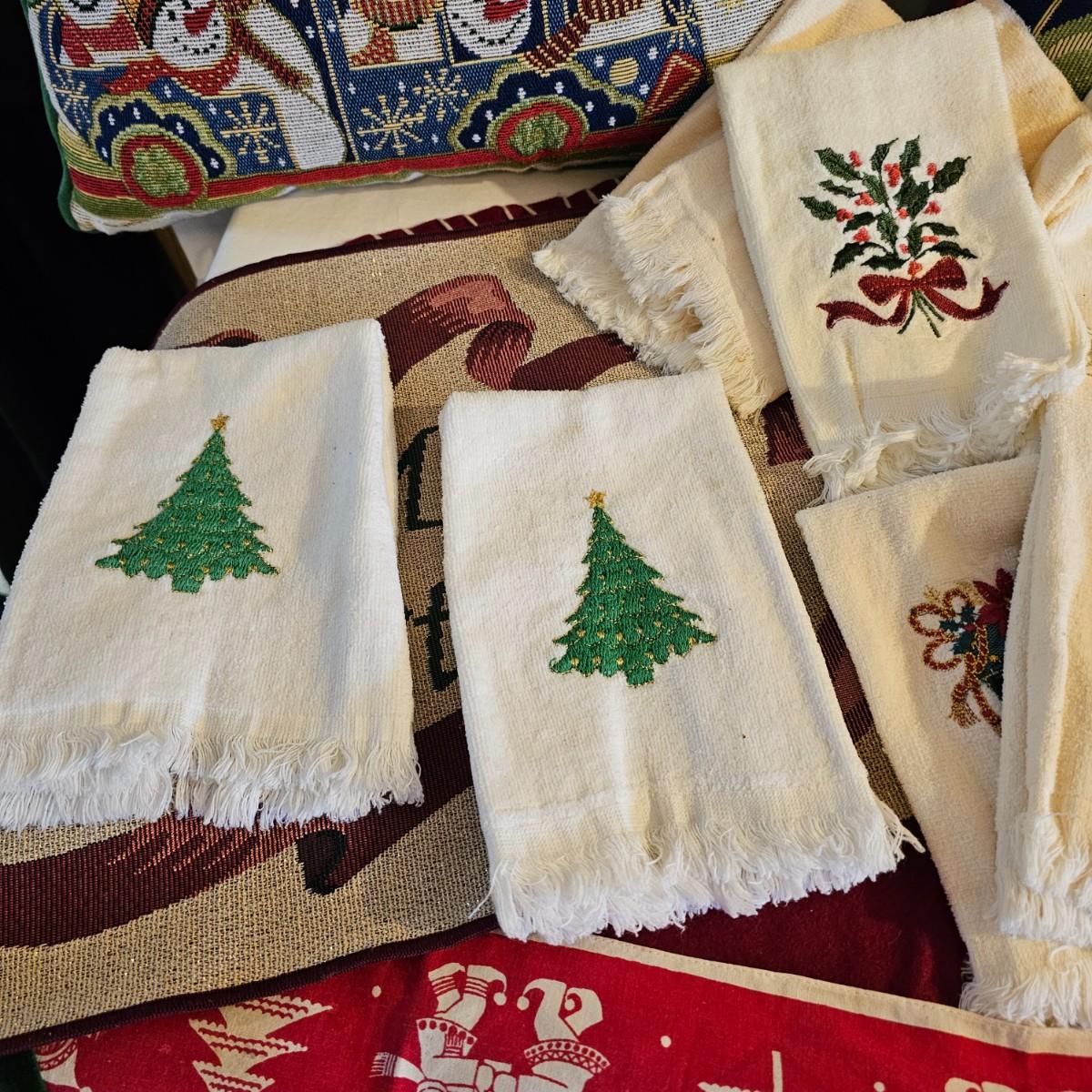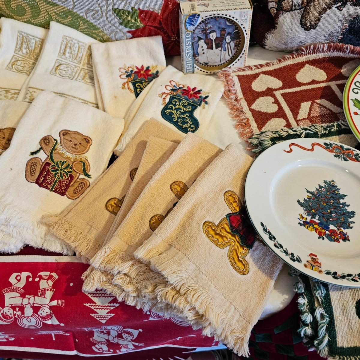 Guest towels, stockings, tablecloths, pillows and more. Several different sizes and seasons of gift bags, and lots of ribbon for wrapping. Small hand size towels with Christmas embroidery. A 36"D felt tree skirt. Three felt on burlap wall hangings, approximately 16" x 23". Three holiday themed pillows, the large Santa is 16"Sq. Some discoloring on the towels. See photos for details and inventory. Shipping available.