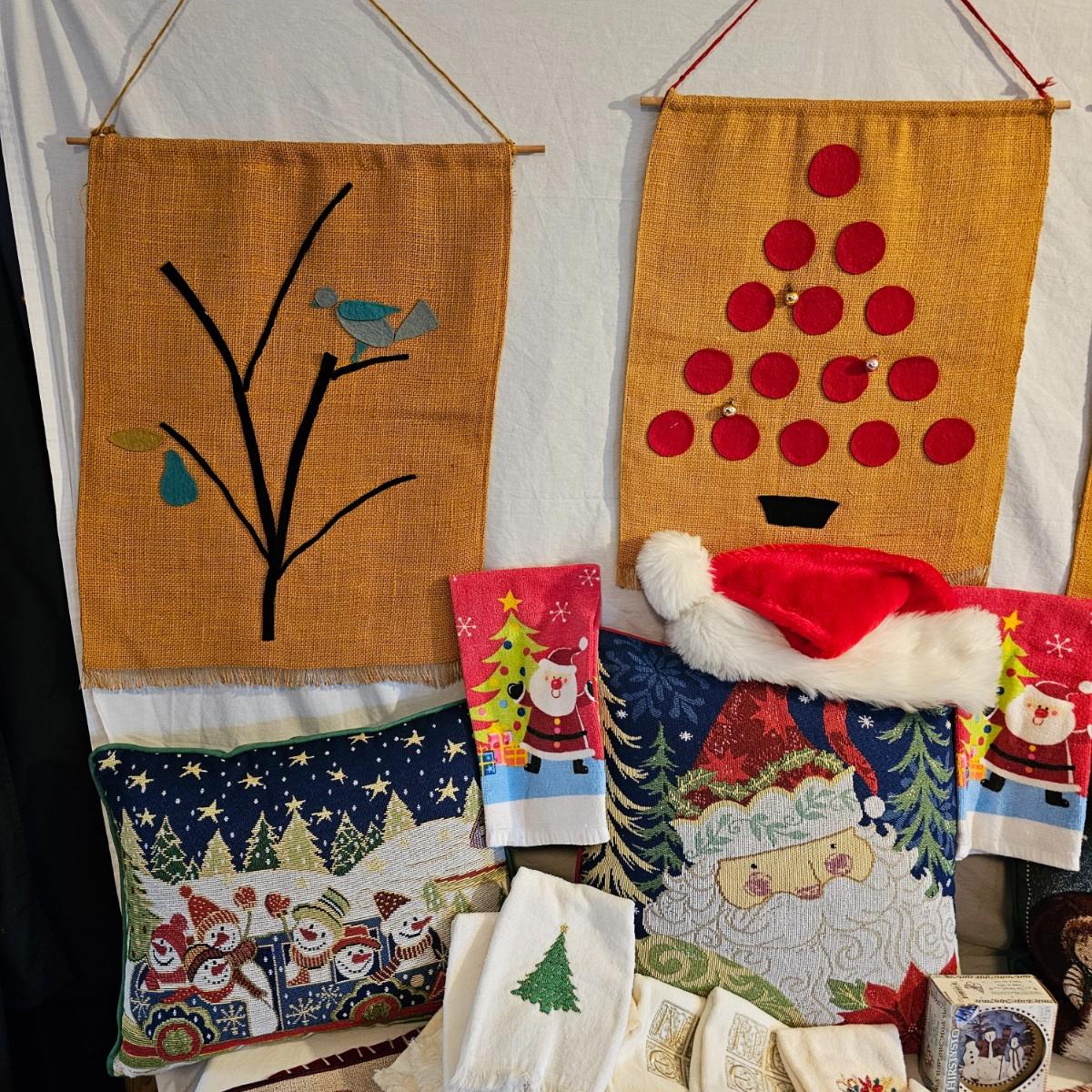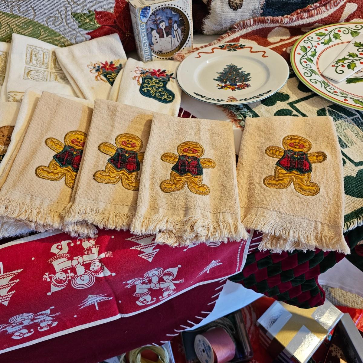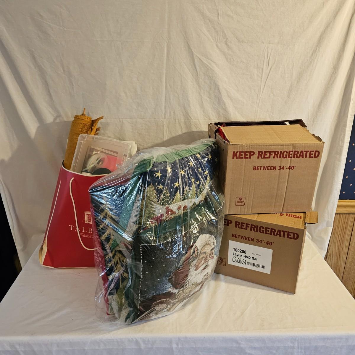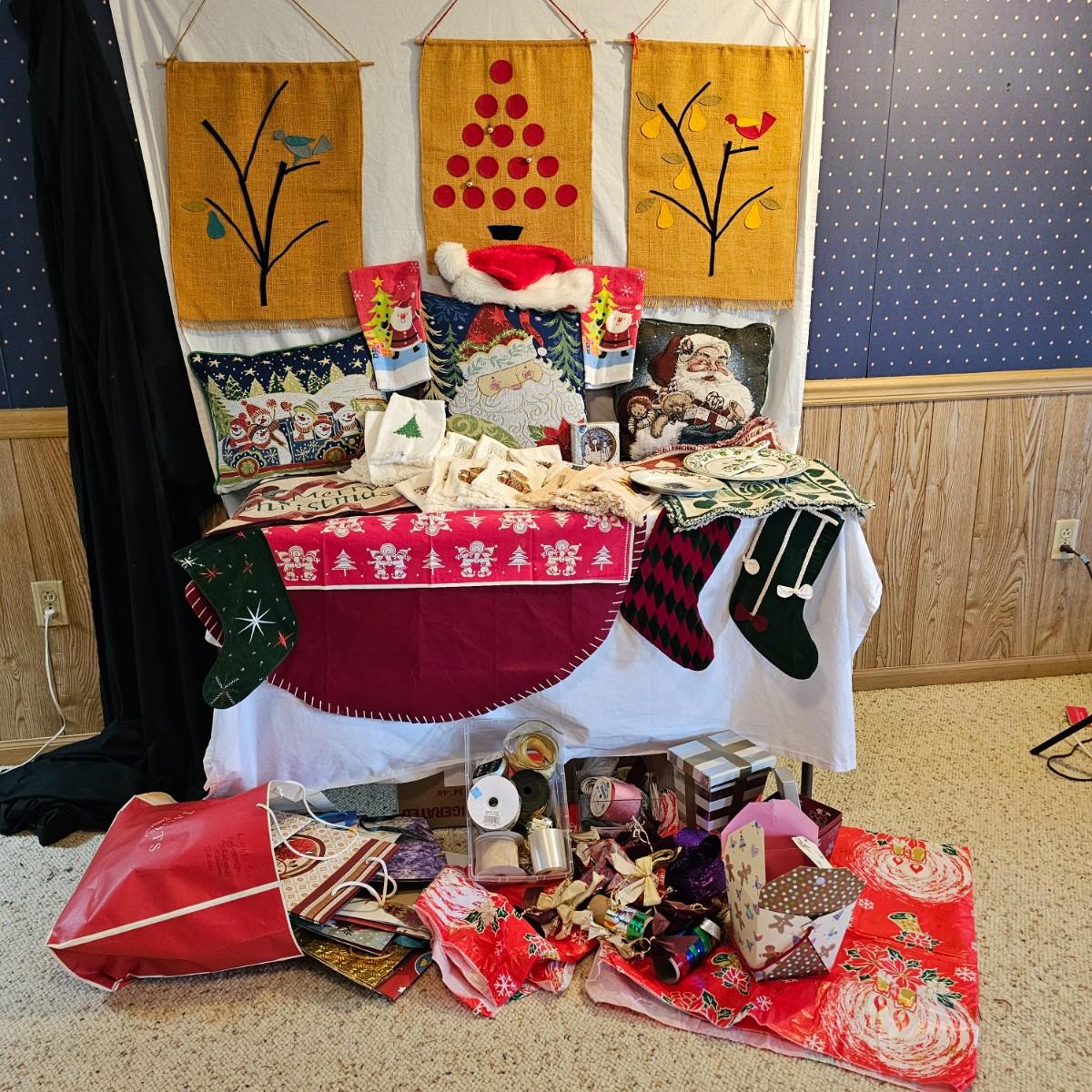 Guest towels, stockings, tablecloths, pillows and more. Several different sizes and seasons of gift bags, and lots of ribbon for wrapping. Small hand size towels with Christmas embroidery. A 36"D felt tree skirt. Three felt on burlap wall hangings, approximately 16" x 23". Three holiday themed pillows, the large Santa is 16"Sq. Some discoloring on the towels. See photos for details and inventory. Shipping available.