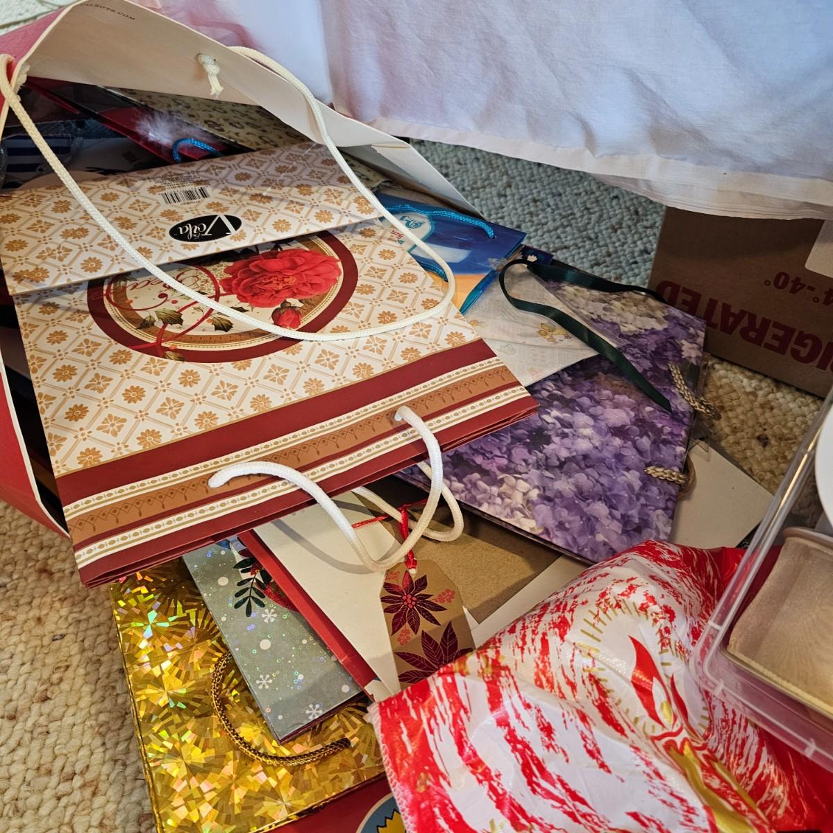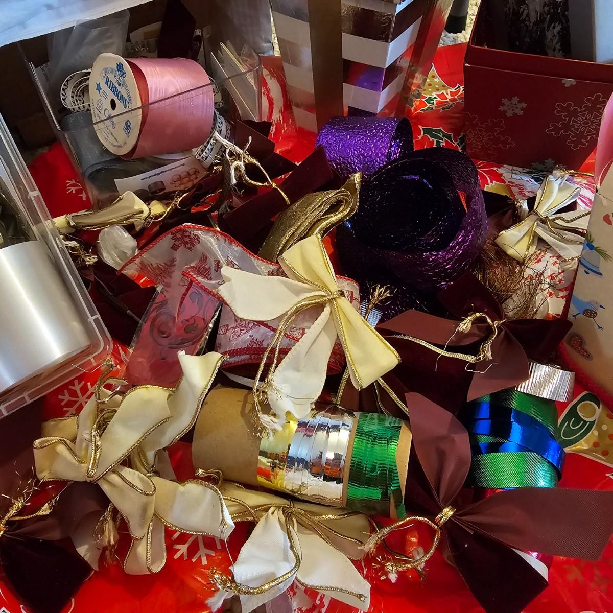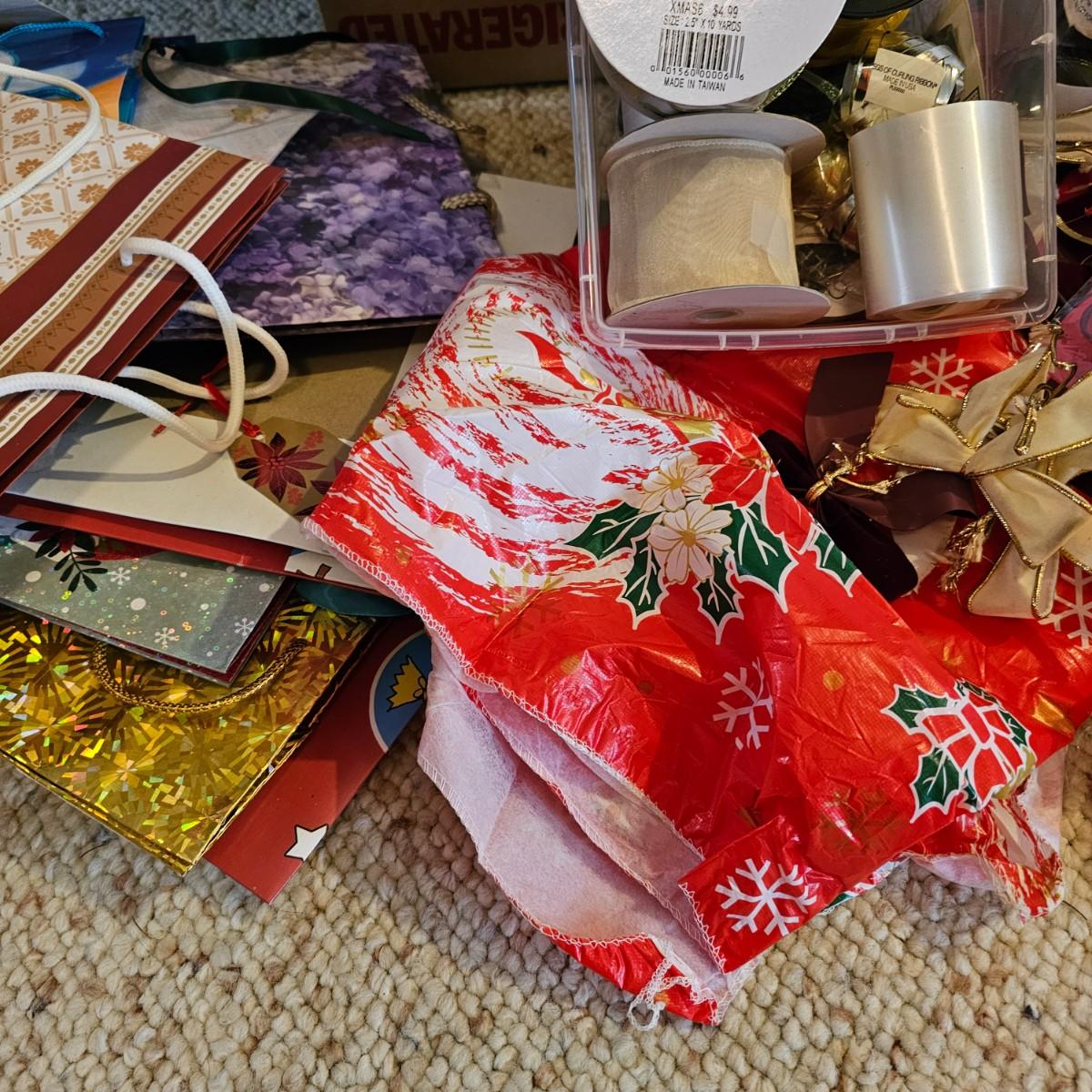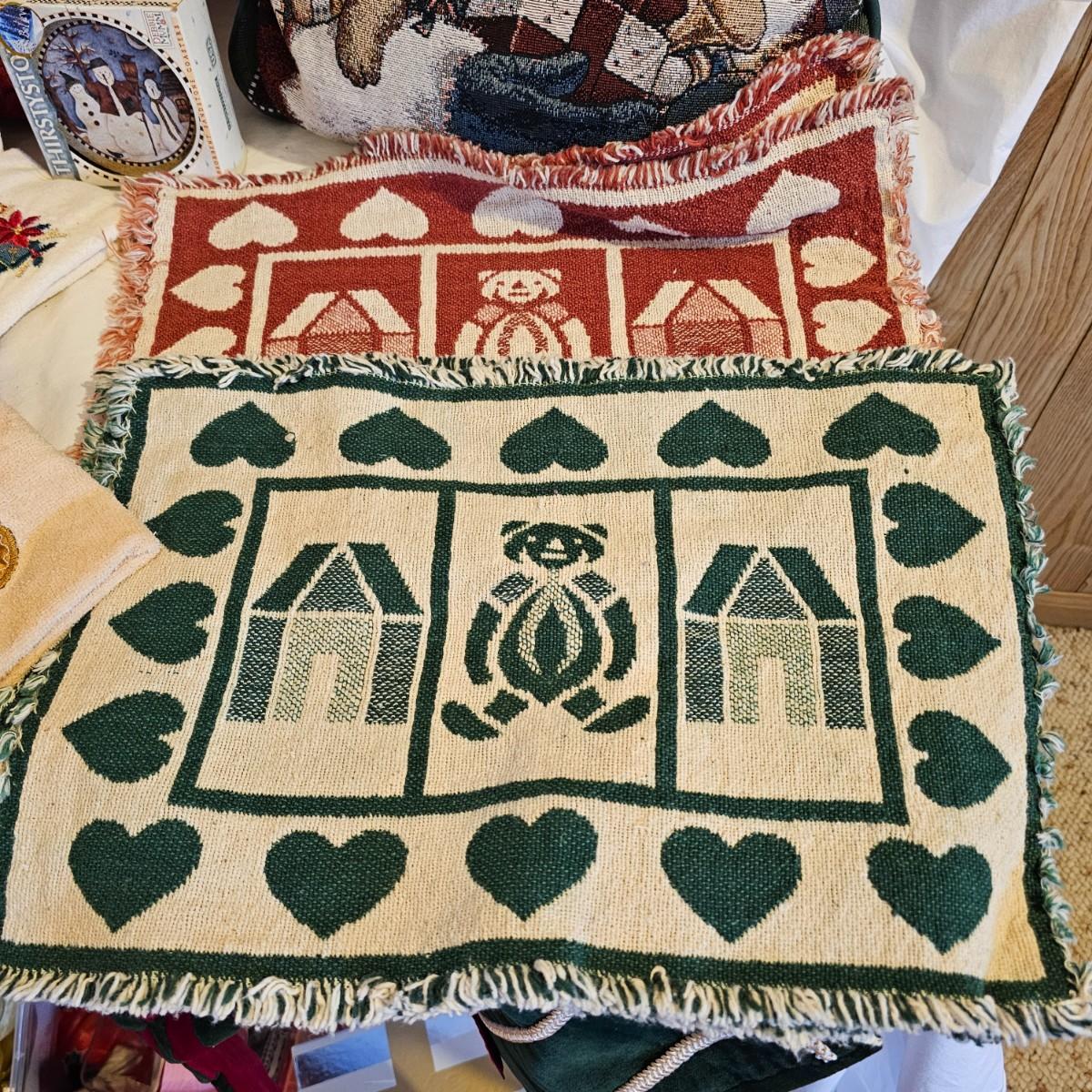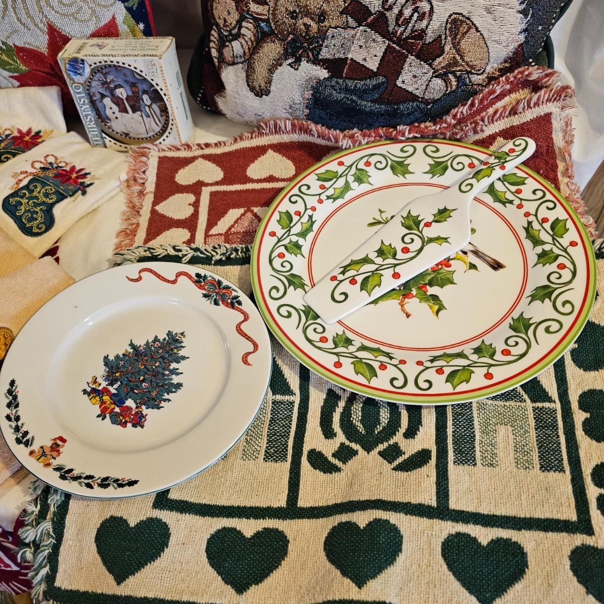 Guest towels, stockings, tablecloths, pillows and more. Several different sizes and seasons of gift bags, and lots of ribbon for wrapping. Small hand size towels with Christmas embroidery. A 36"D felt tree skirt. Three felt on burlap wall hangings, approximately 16" x 23". Three holiday themed pillows, the large Santa is 16"Sq. Some discoloring on the towels. See photos for details and inventory. Shipping available.