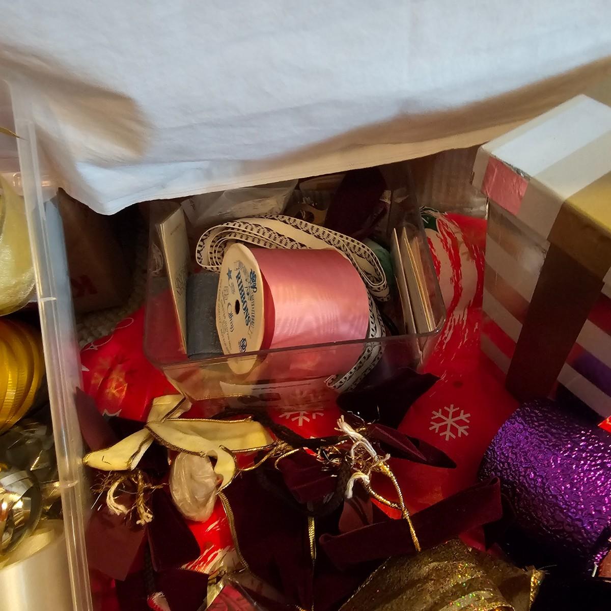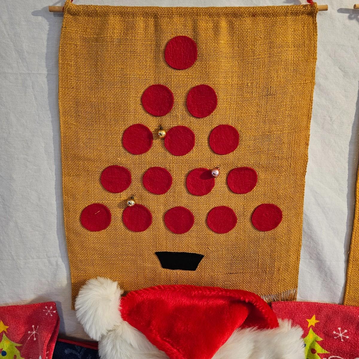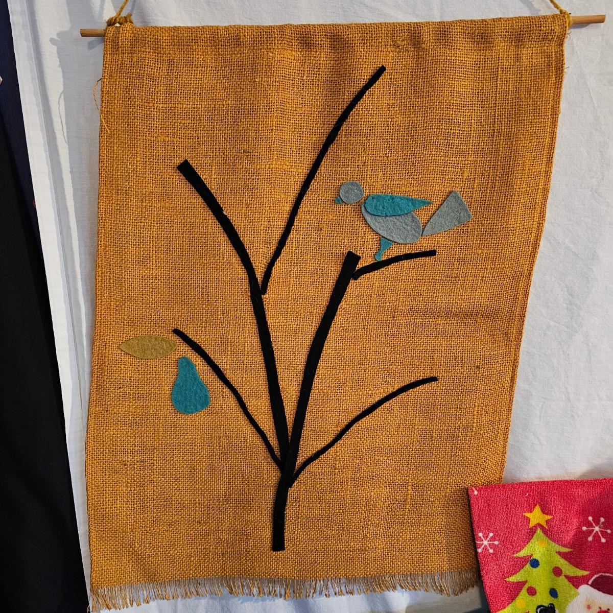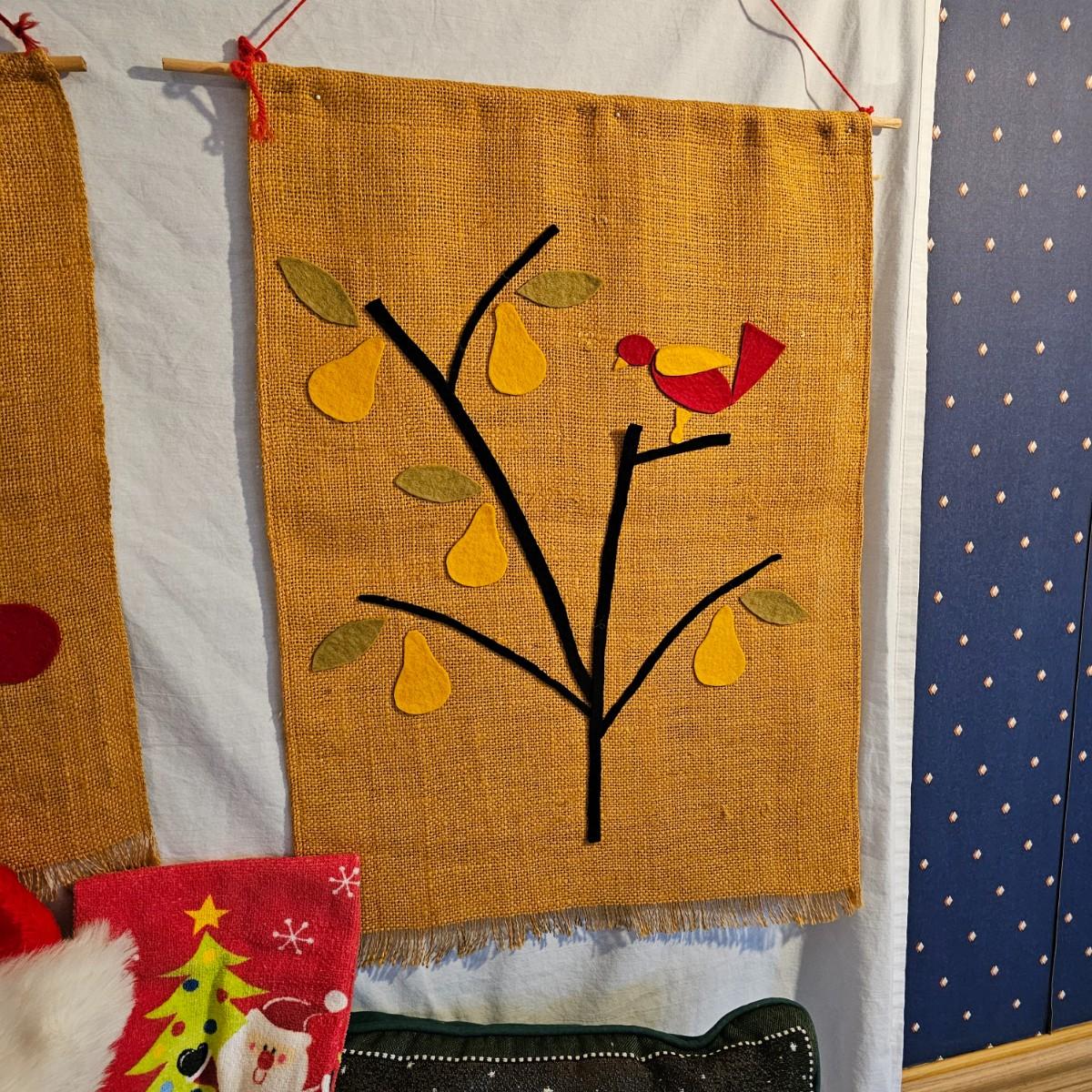 Guest towels, stockings, tablecloths, pillows and more. Several different sizes and seasons of gift bags, and lots of ribbon for wrapping. Small hand size towels with Christmas embroidery. A 36"D felt tree skirt. Three felt on burlap wall hangings, approximately 16" x 23". Three holiday themed pillows, the large Santa is 16"Sq. Some discoloring on the towels. See photos for details and inventory. Shipping available.