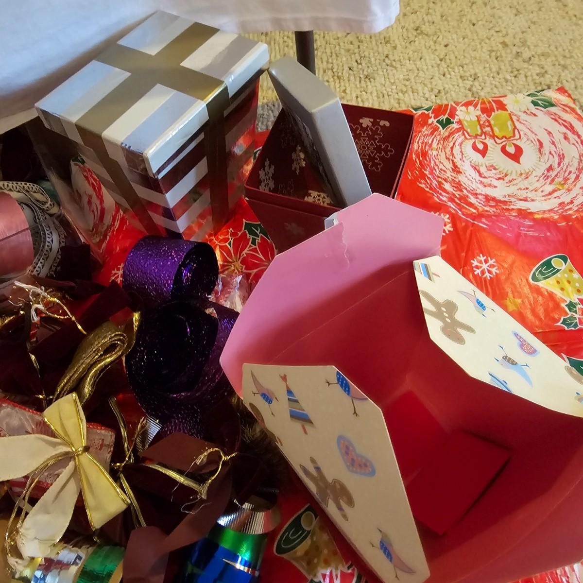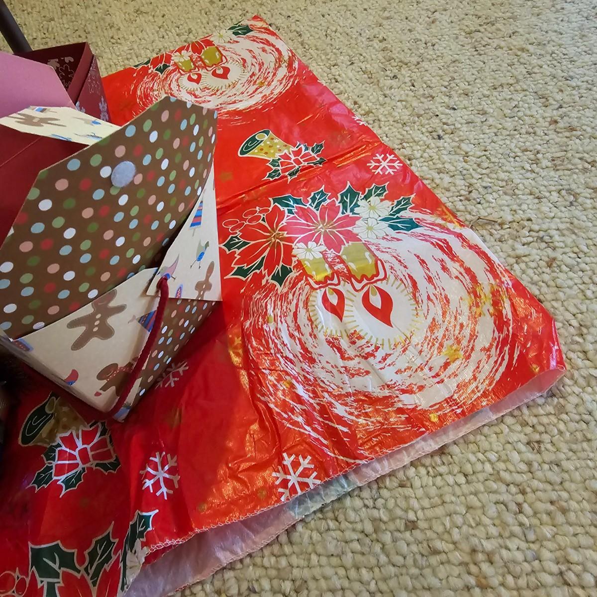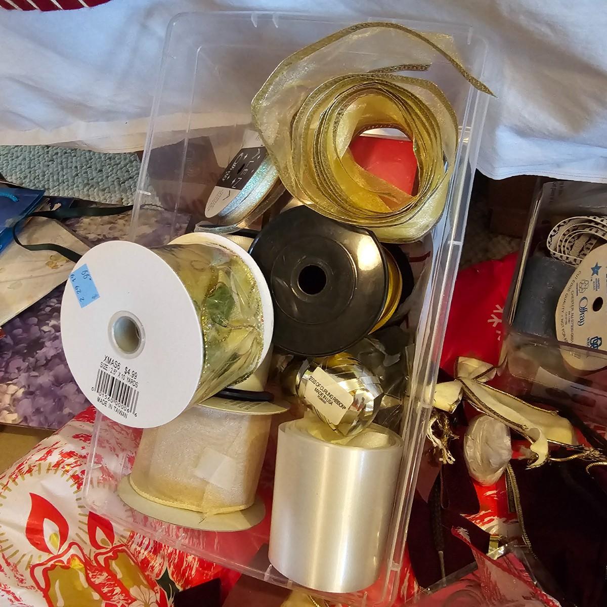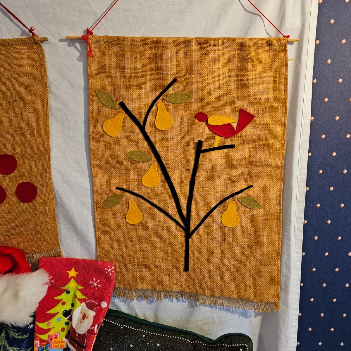 Guest towels, stockings, tablecloths, pillows and more. Several different sizes and seasons of gift bags, and lots of ribbon for wrapping. Small hand size towels with Christmas embroidery. A 36"D felt tree skirt. Three felt on burlap wall hangings, approximately 16" x 23". Three holiday themed pillows, the large Santa is 16"Sq. Some discoloring on the towels. See photos for details and inventory. Shipping available.