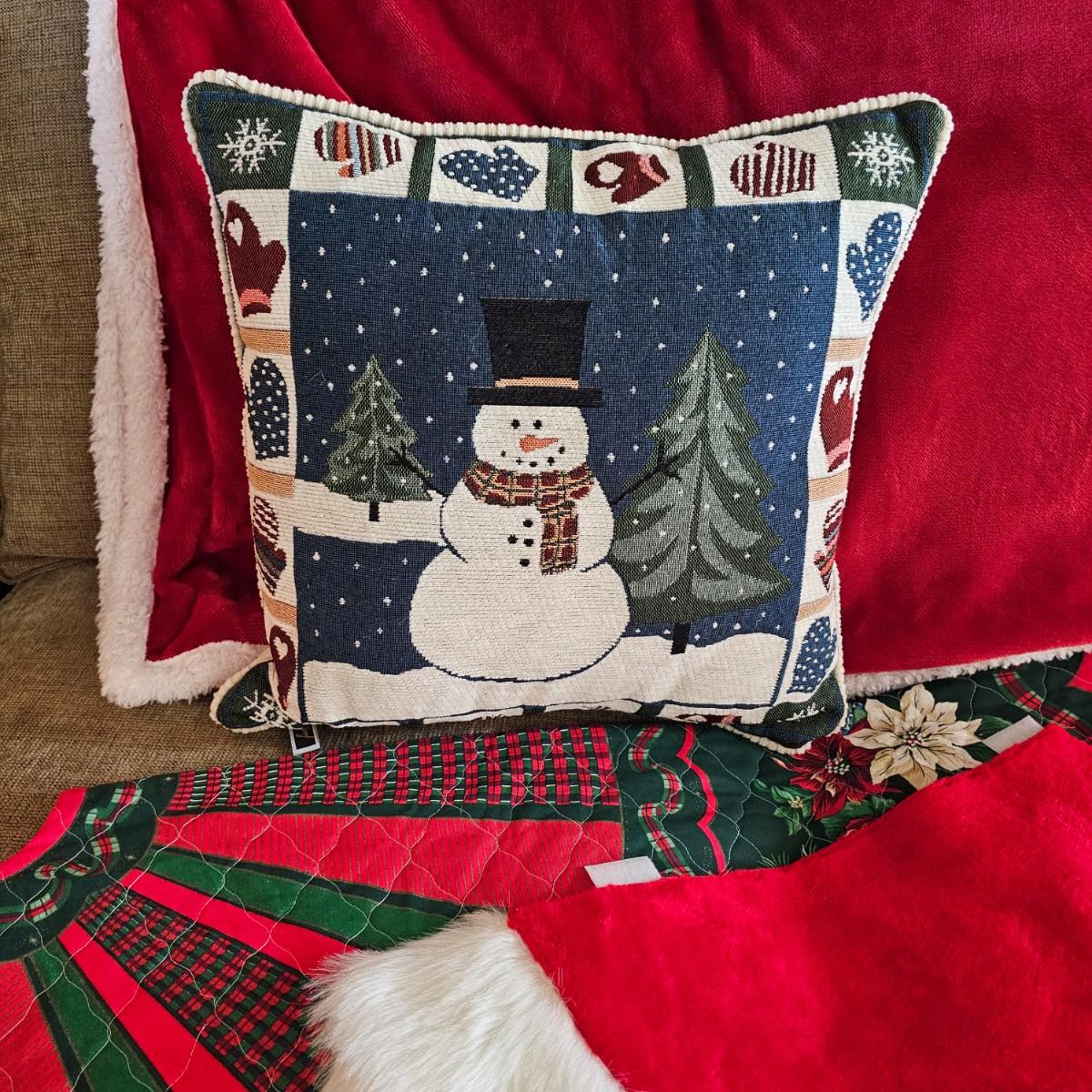 Lots of colorful Christmas items for the home. Snowmen and other pillows, two tree skirts, blankets and more. Tree skirts are 42"D and 58"D, pillows sre 13"Sq and 15" Sq. Red throw is 48" x 66"L. Includes one stocking and one beaded table runner. See photos for details. Shipping available.