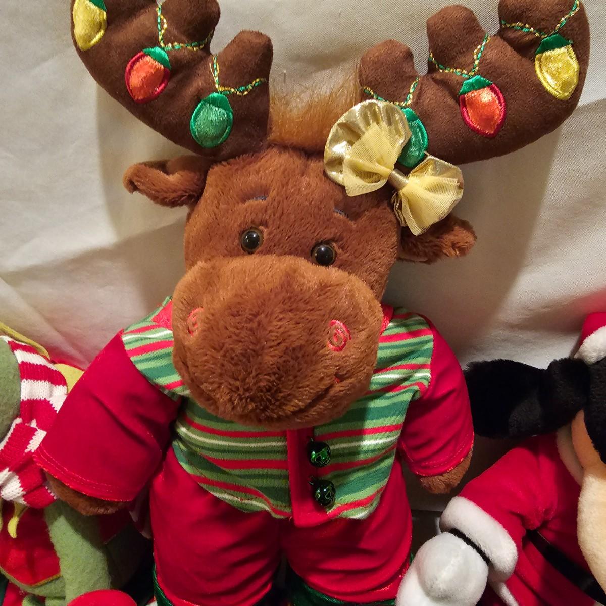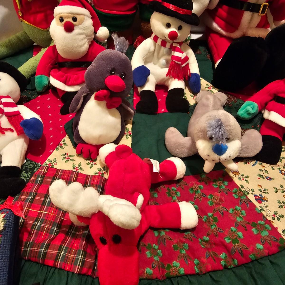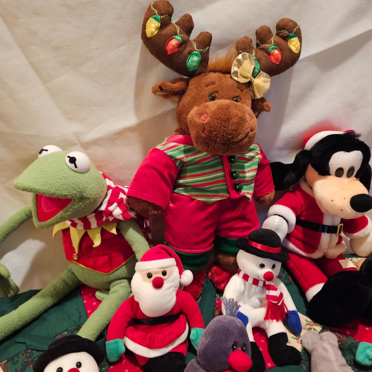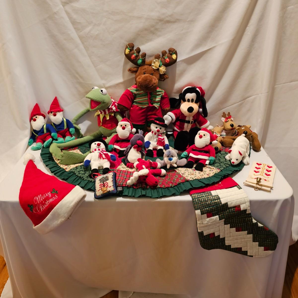 Fun stuffed characters in Christmas attire. Kermit, Goofy, Santa and others show their best holiday duds. Moose is 20"H. Also includes a hat, stocking and tree skirt, 44"D. See photos for details. Shipping available.
