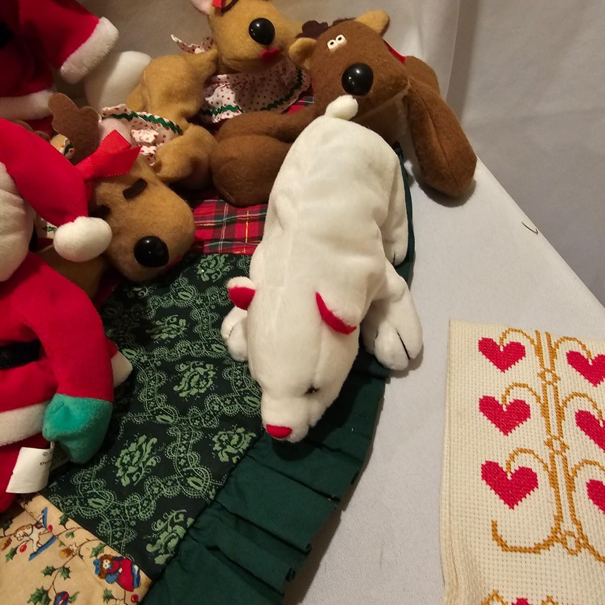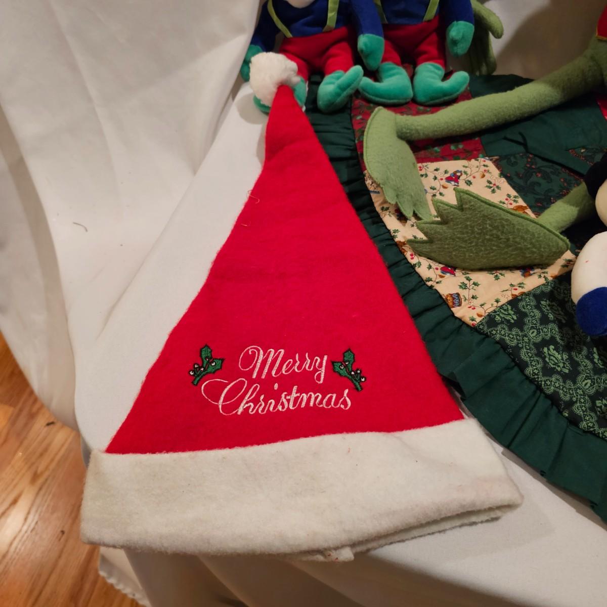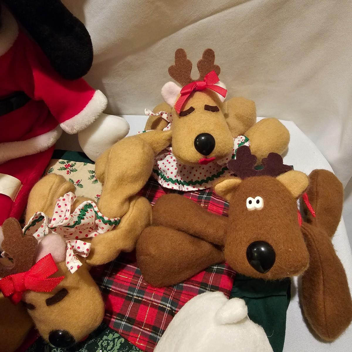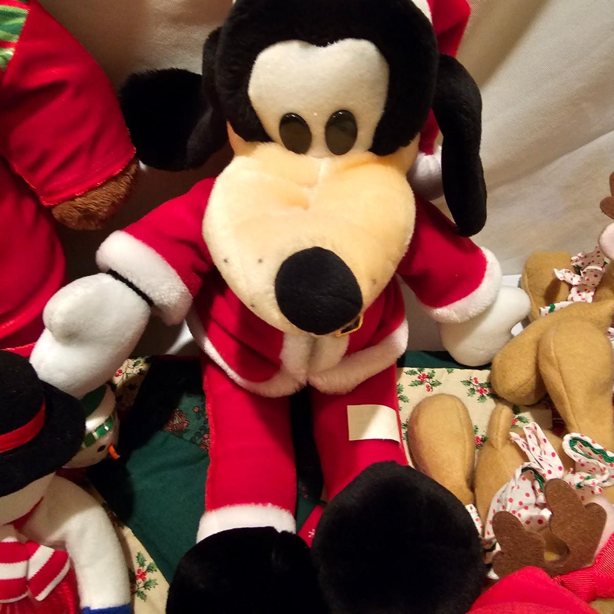 Fun stuffed characters in Christmas attire. Kermit, Goofy, Santa and others show their best holiday duds. Moose is 20"H. Also includes a hat, stocking and tree skirt, 44"D. See photos for details. Shipping available.