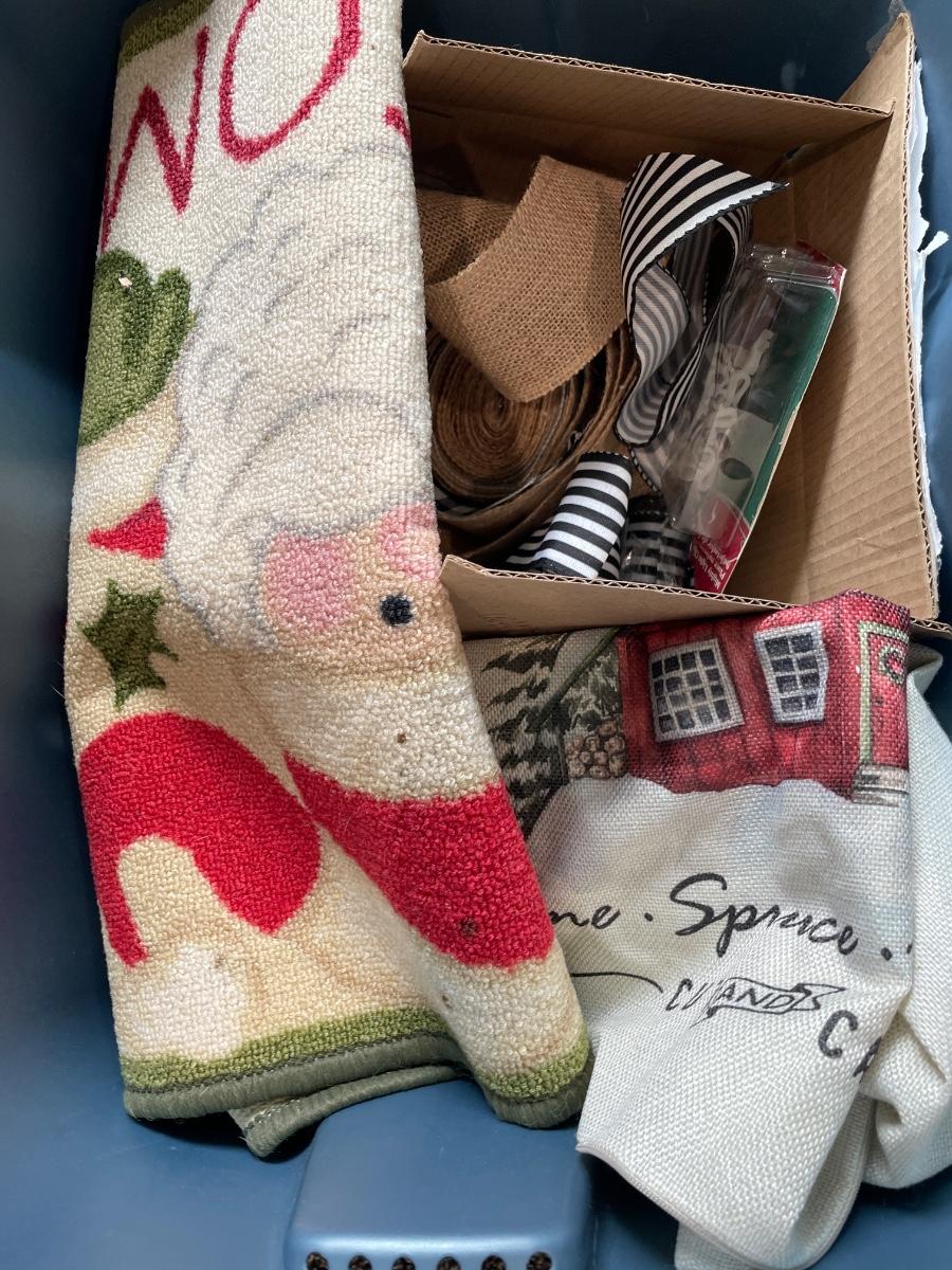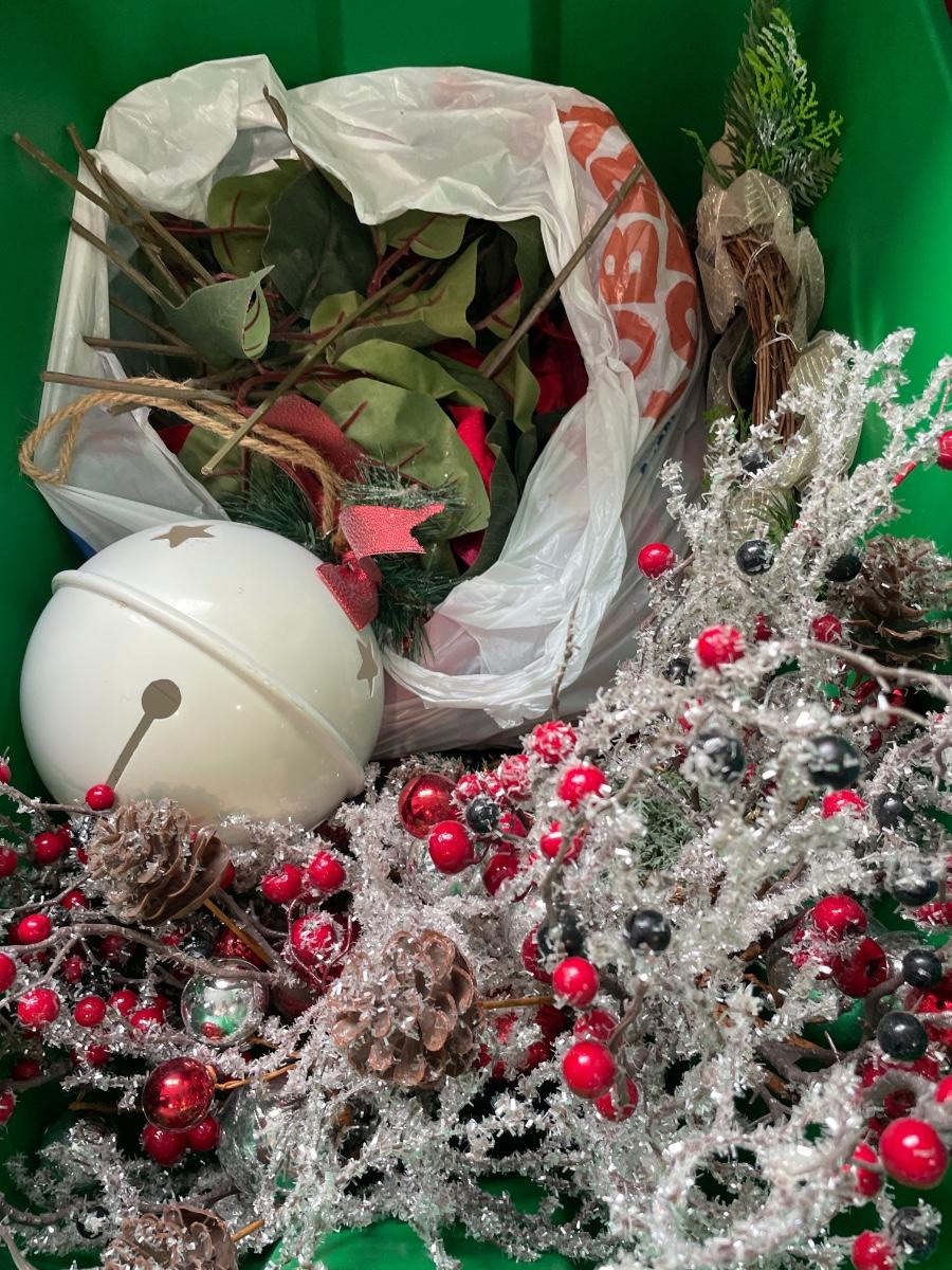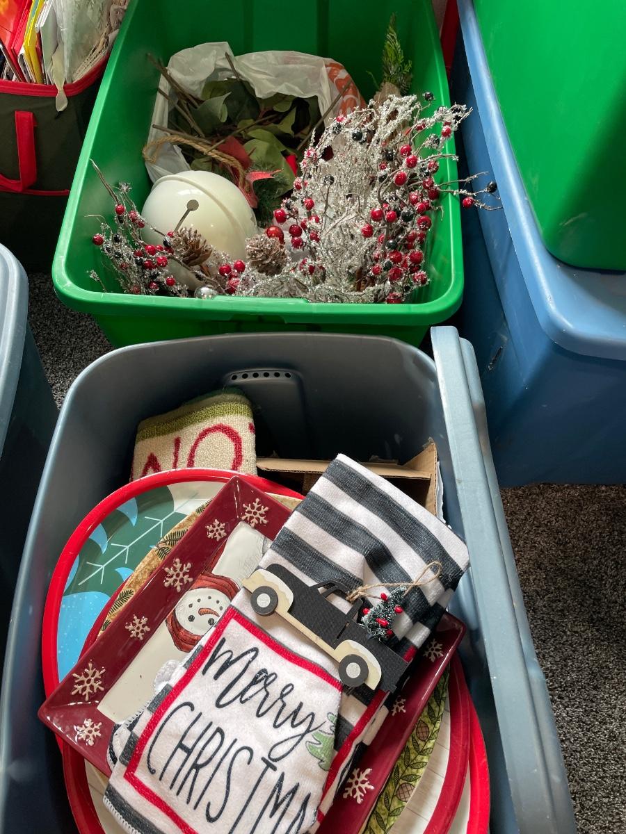 2 totes of red and green decor