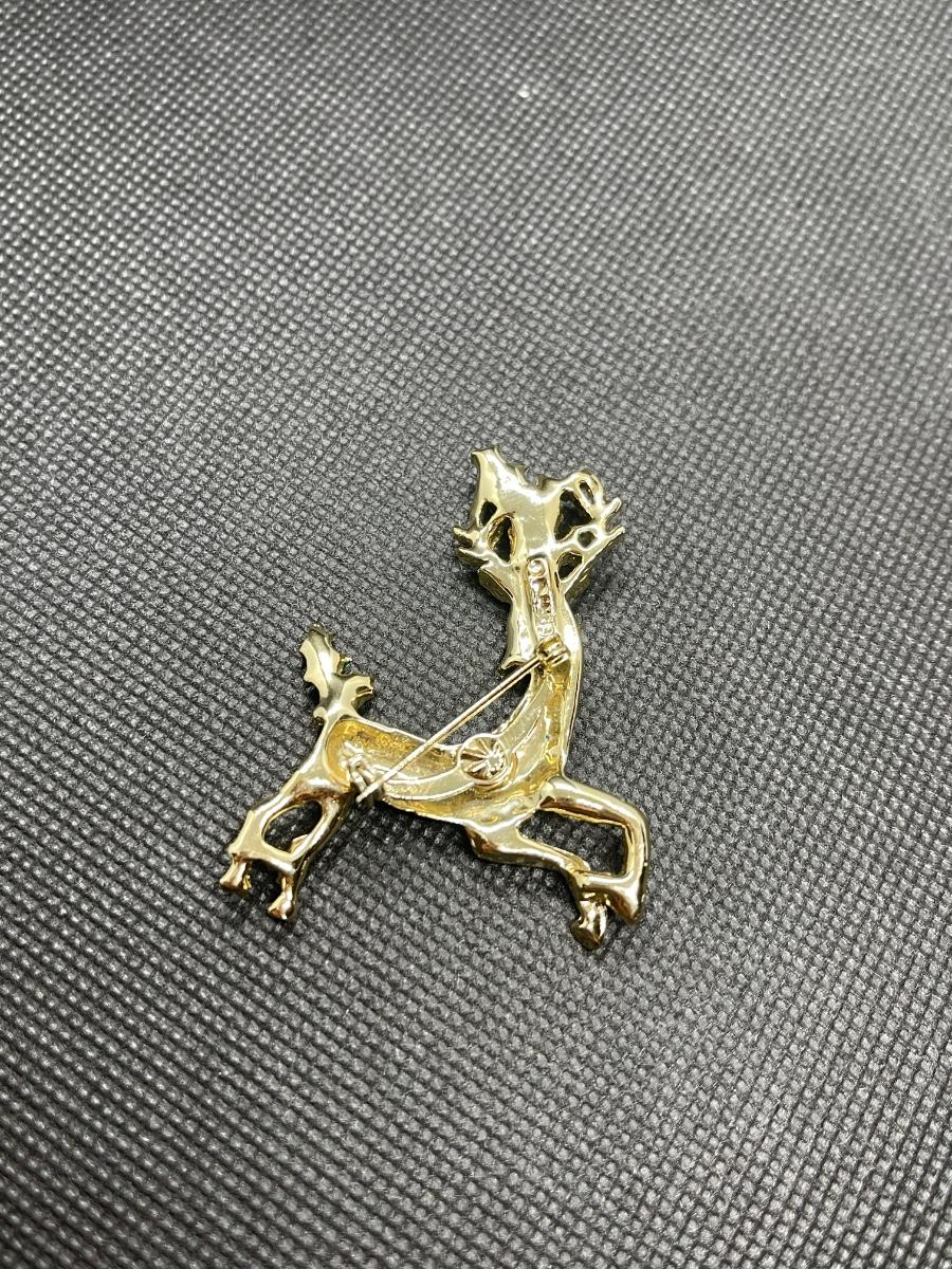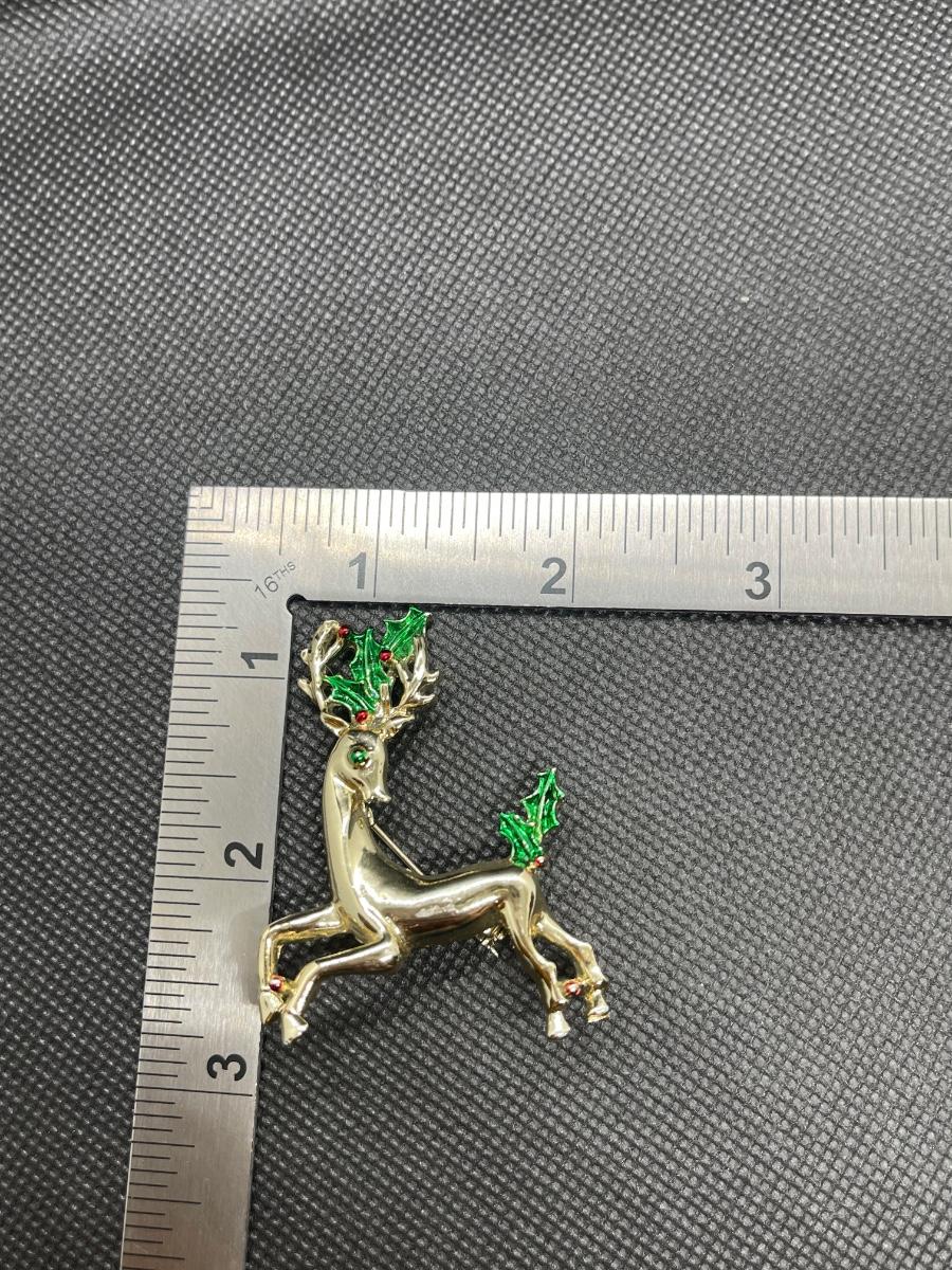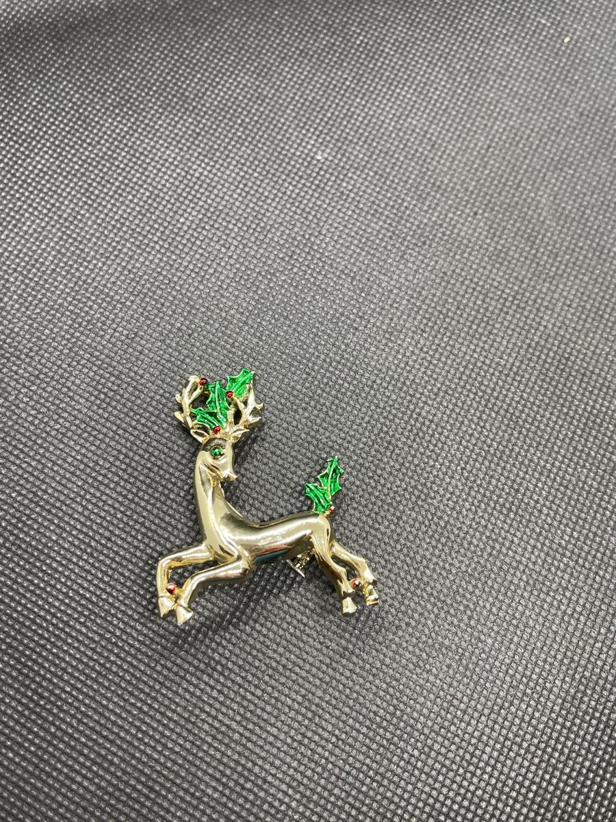 Vintage Reindeer Brooch Green Red Holly Gold Tone Pin Signed Gerrys