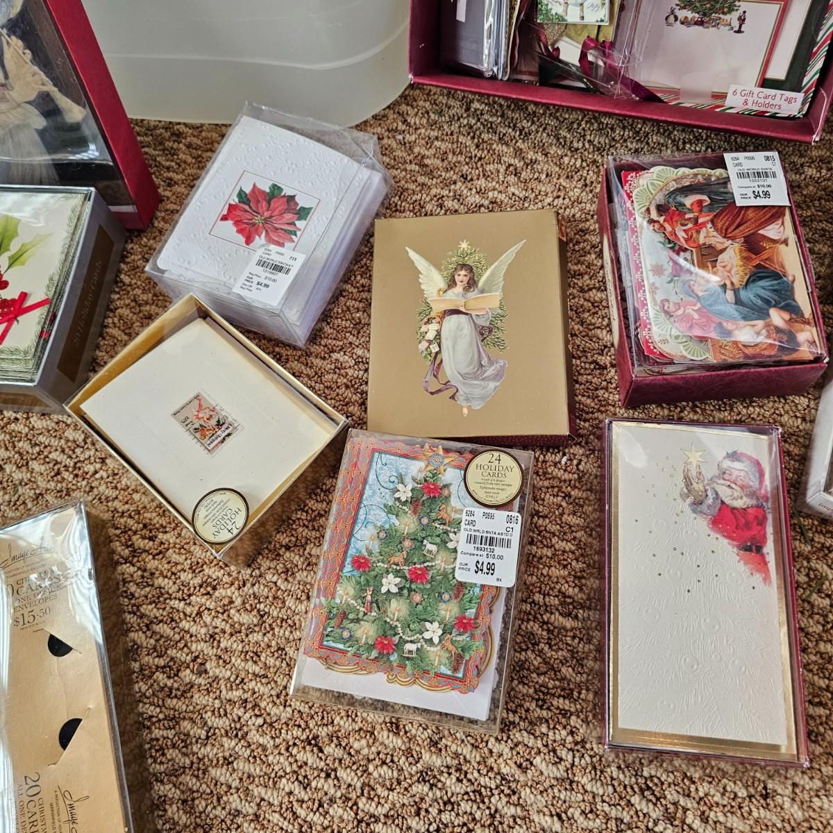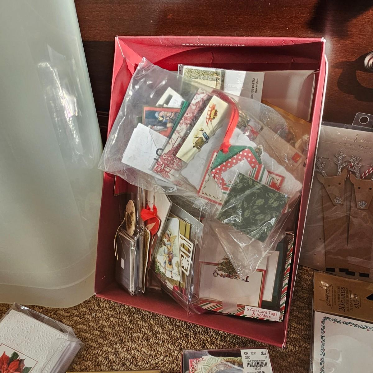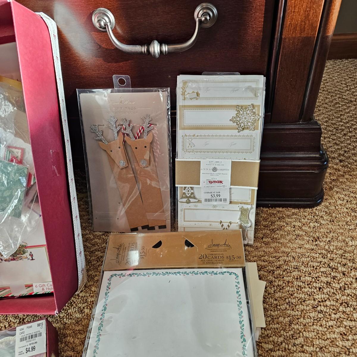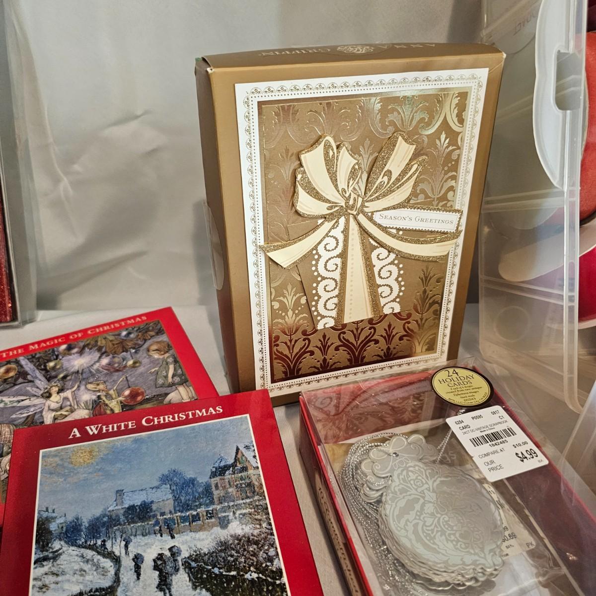 Two tolls brand new Christmas wrapping paper, 30" long, and a clear plastic storage tote. One double stack handled container with rolls of red ribbon in it, two snap lid smaller containers with pre-cut pieces of red ribbon in one and gold ribbon in the other. Also one glittery candle table decor. Also includes multiple boxes of Christmas cards and package tags. All containers included. See photos for details. Local pickup only.