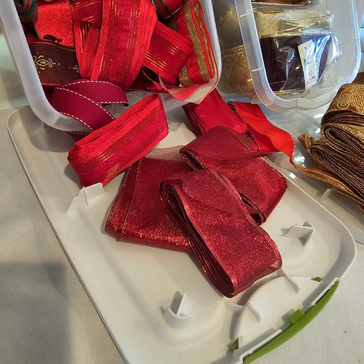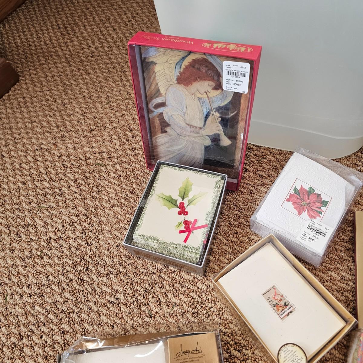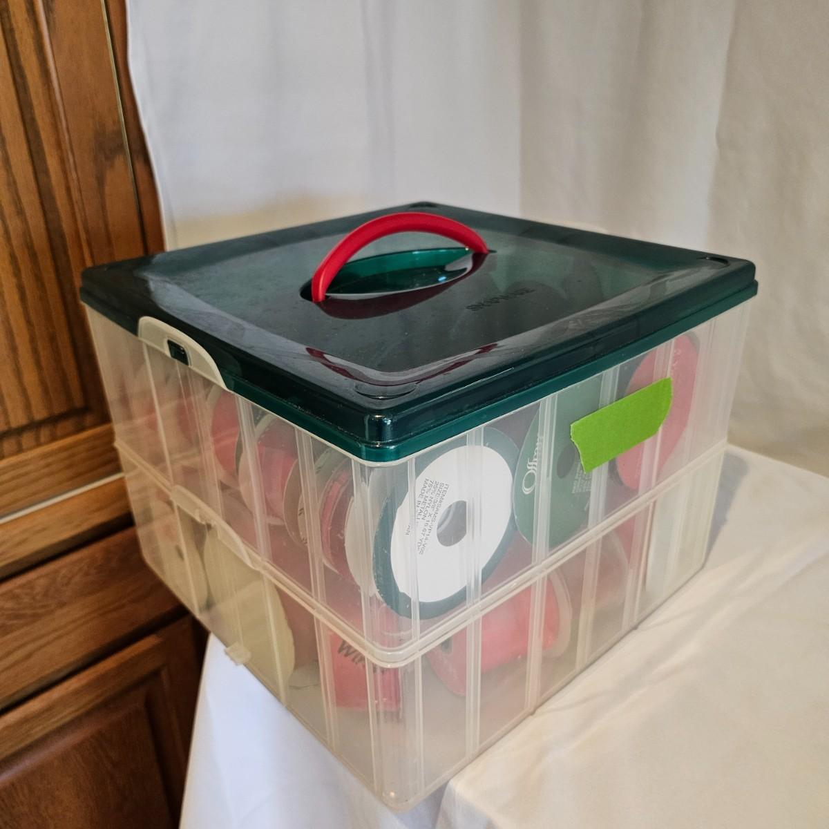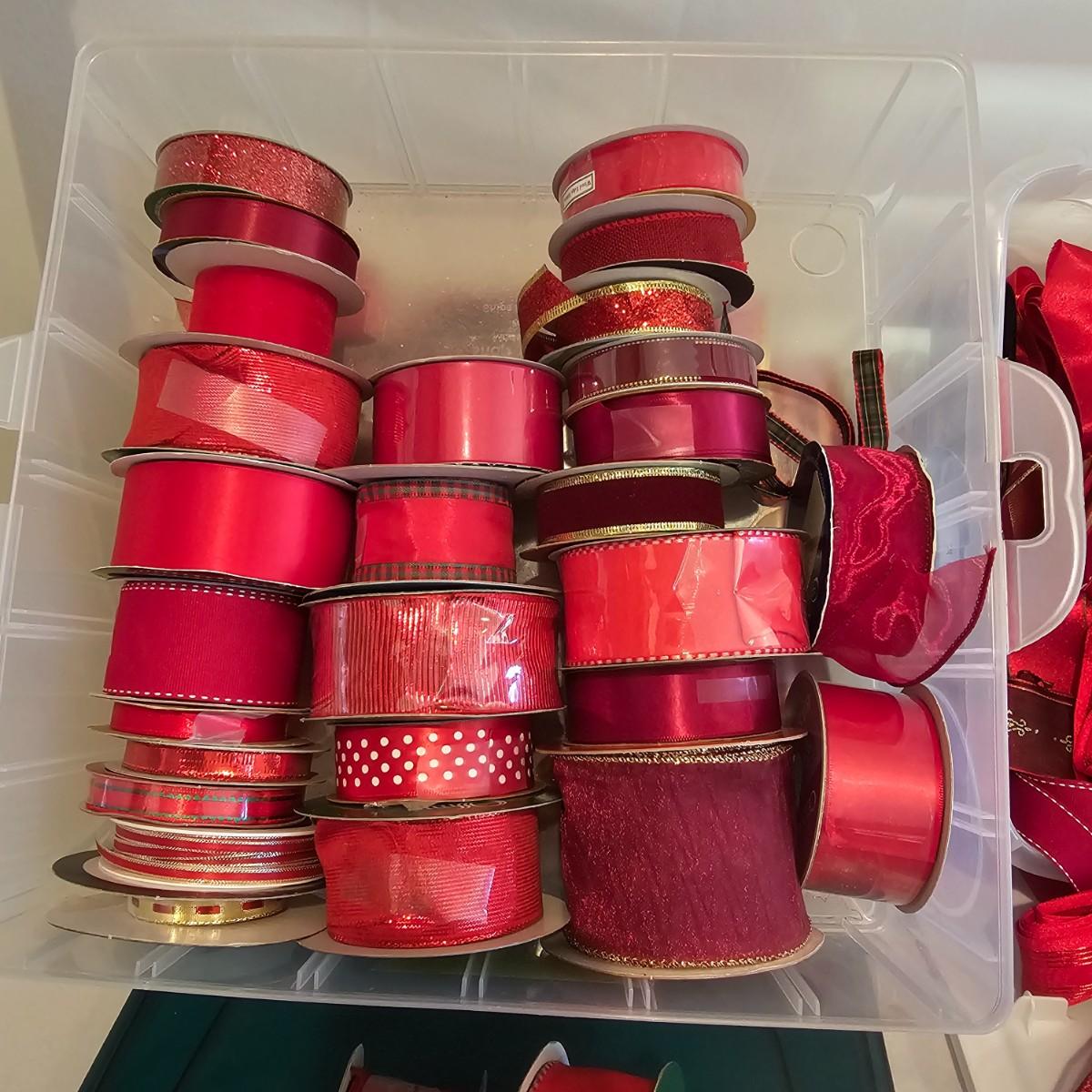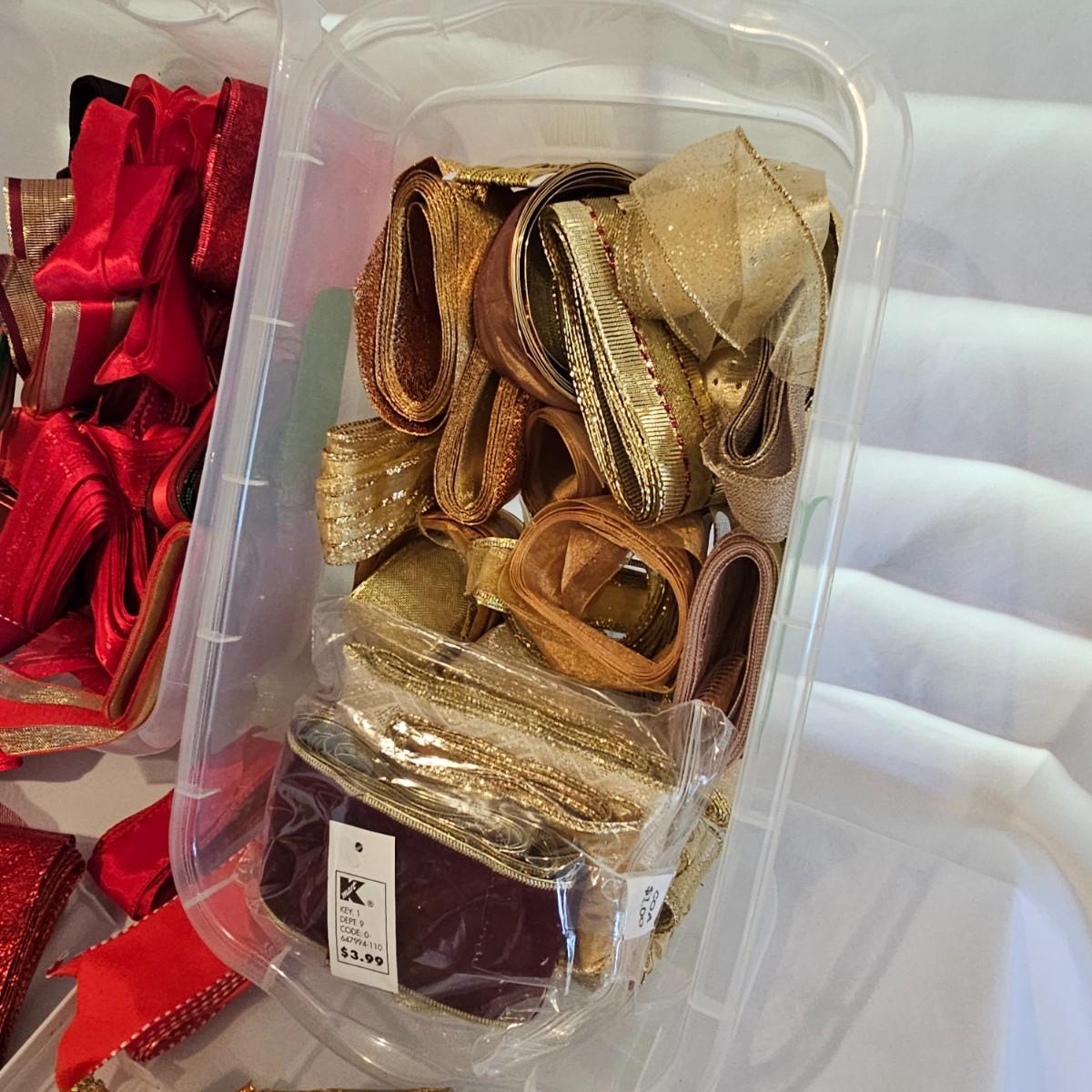 Two tolls brand new Christmas wrapping paper, 30" long, and a clear plastic storage tote. One double stack handled container with rolls of red ribbon in it, two snap lid smaller containers with pre-cut pieces of red ribbon in one and gold ribbon in the other. Also one glittery candle table decor. Also includes multiple boxes of Christmas cards and package tags. All containers included. See photos for details. Local pickup only.