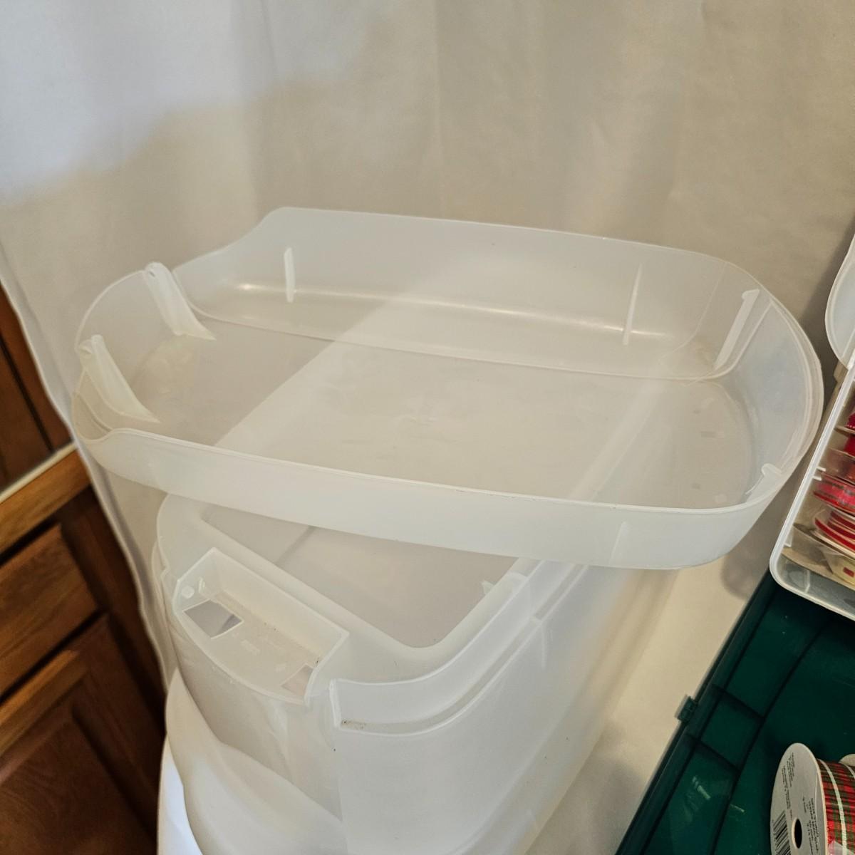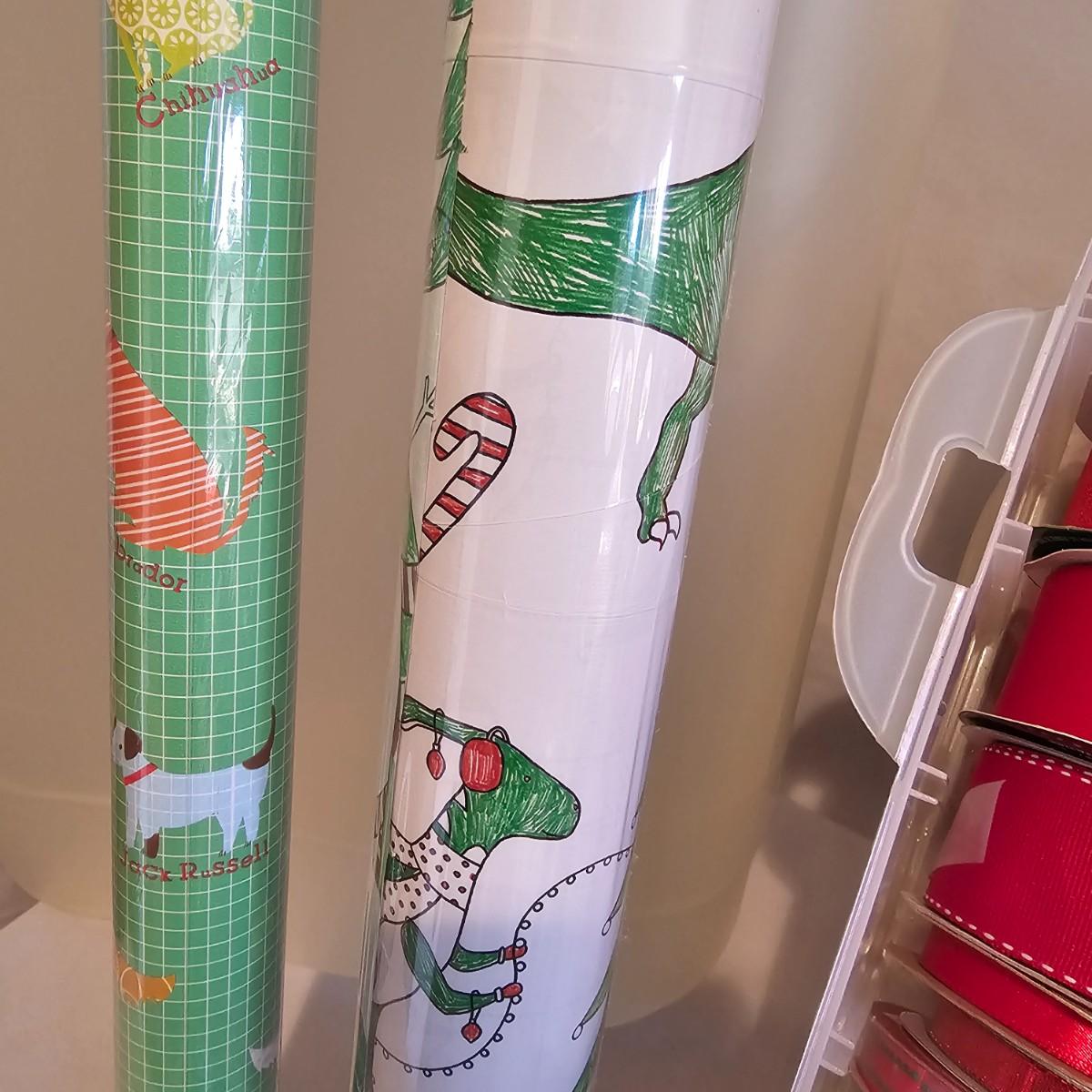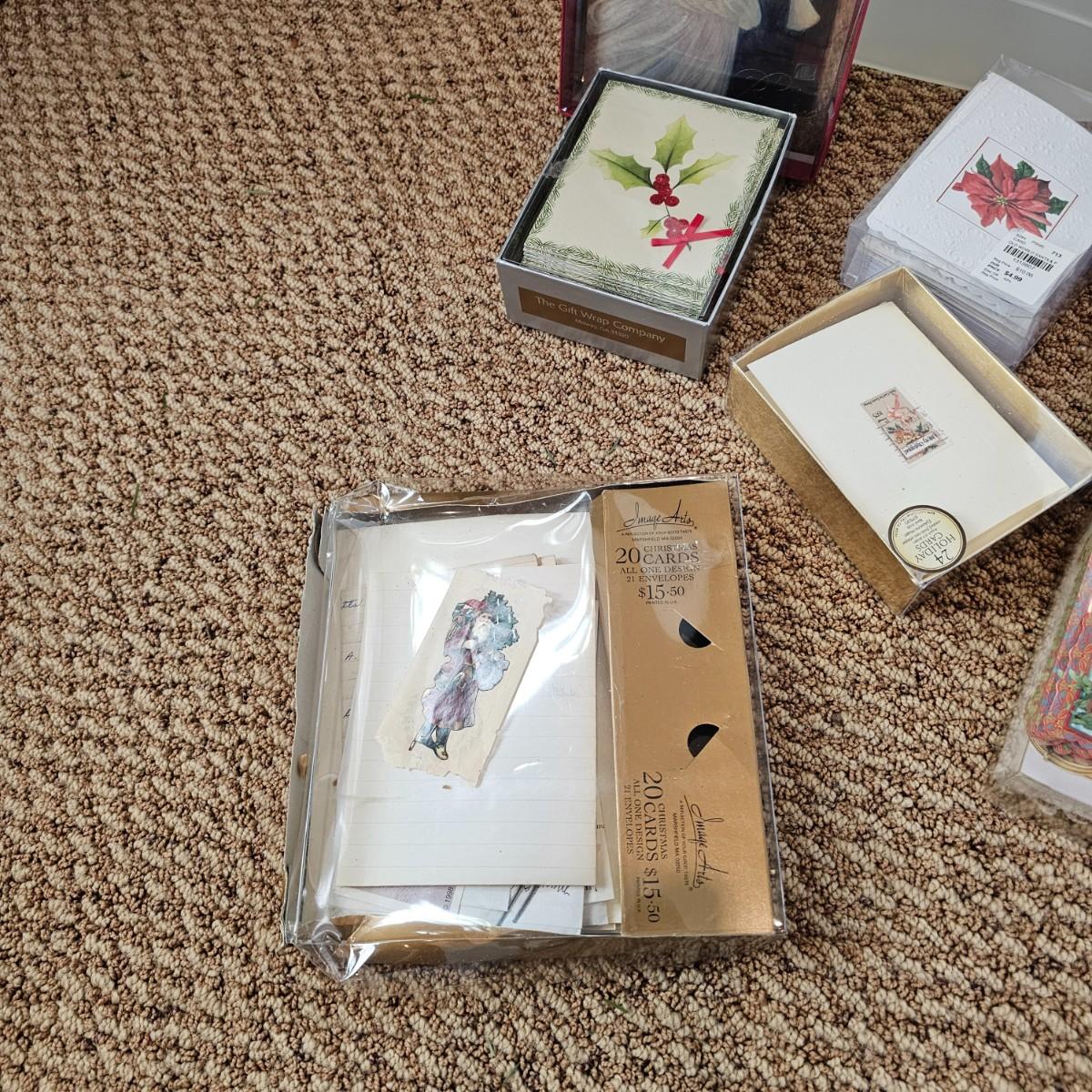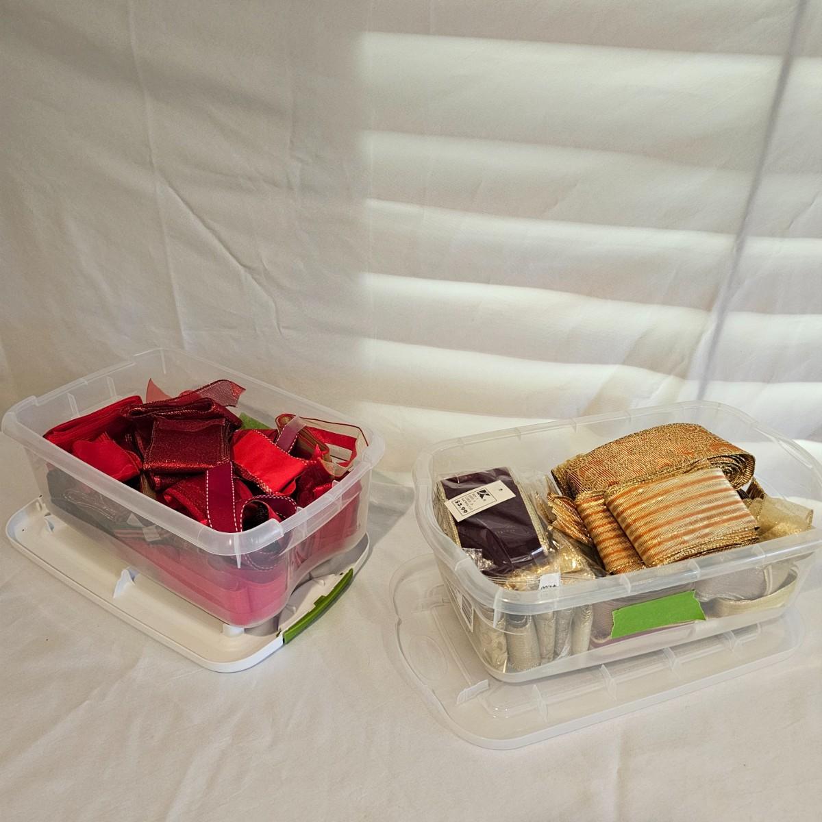 Two tolls brand new Christmas wrapping paper, 30" long, and a clear plastic storage tote. One double stack handled container with rolls of red ribbon in it, two snap lid smaller containers with pre-cut pieces of red ribbon in one and gold ribbon in the other. Also one glittery candle table decor. Also includes multiple boxes of Christmas cards and package tags. All containers included. See photos for details. Local pickup only.