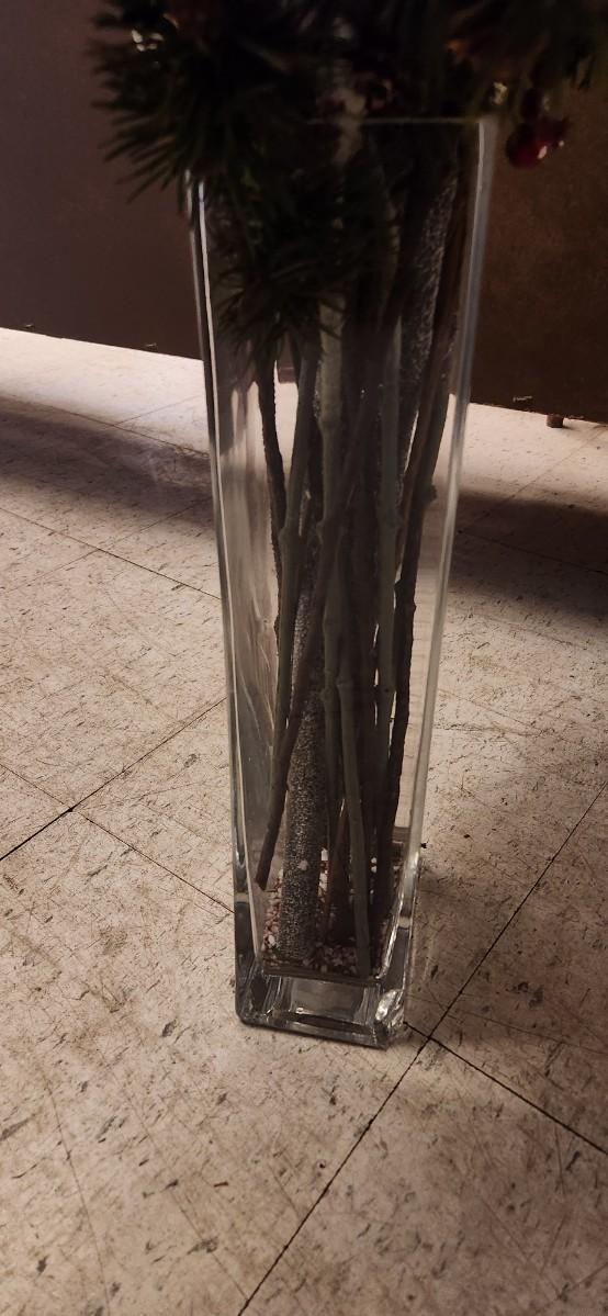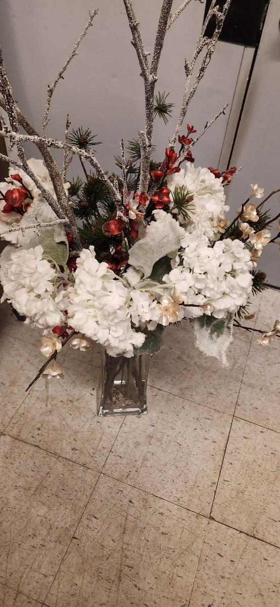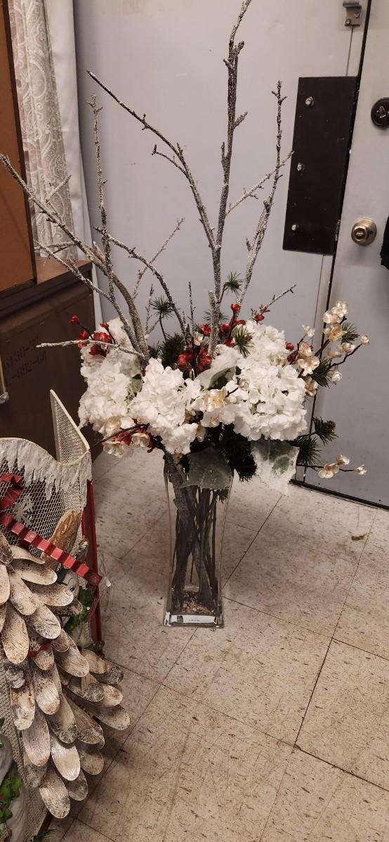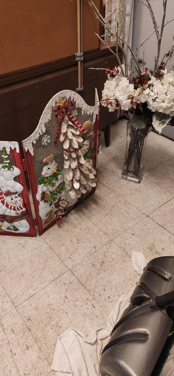 Large Crystal Vase with Christmas themed Silk Flowers and branches. Adorable metal Christmas themed fireplacescreen.