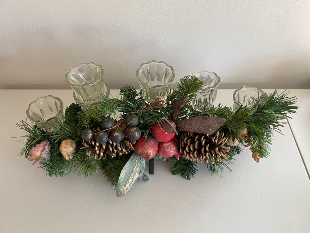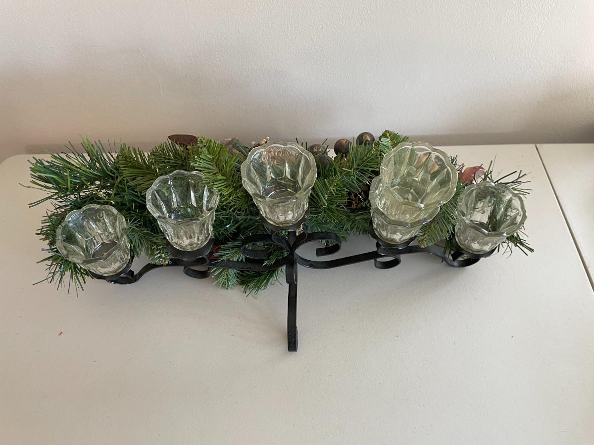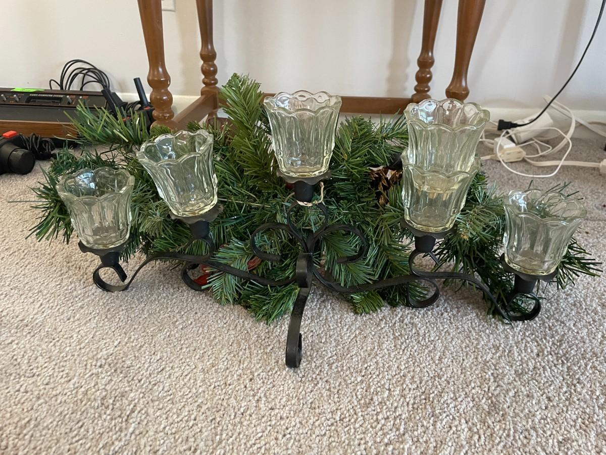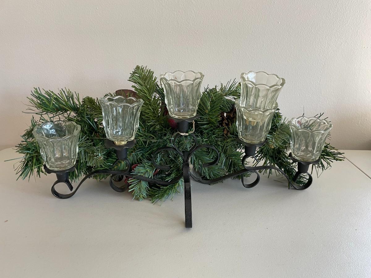 This is a decorative item for the holiday season. It has glass candle holders and the wreath is wrapped on an iron stand.