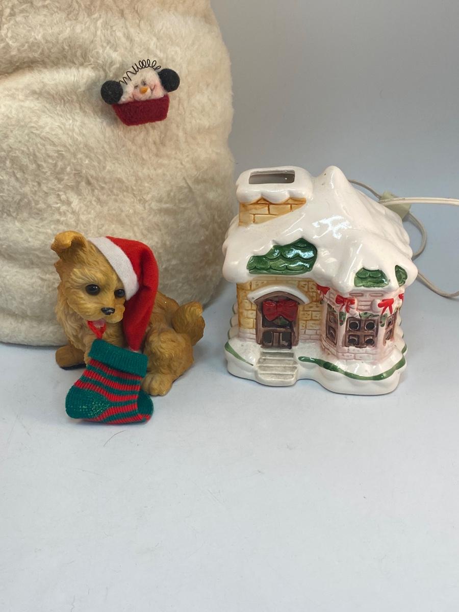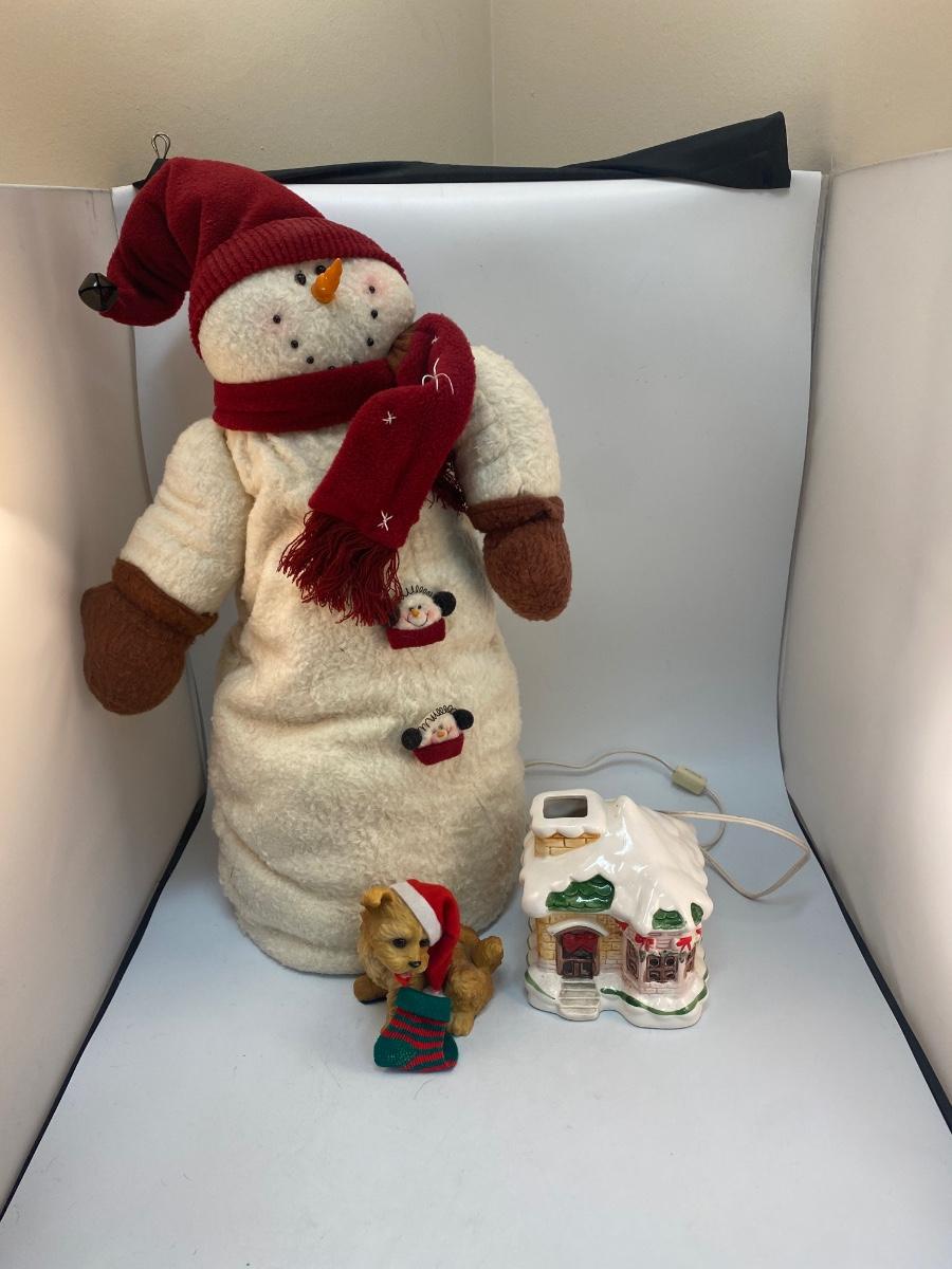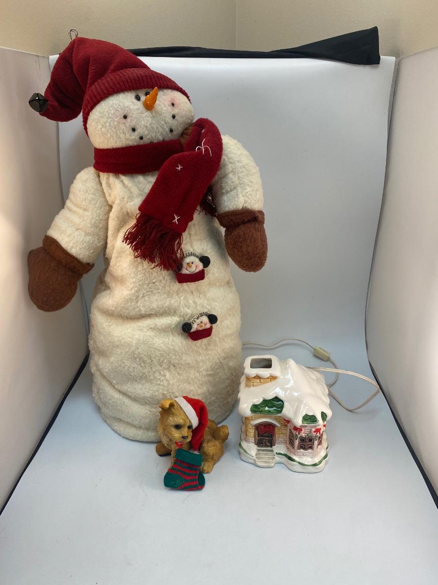 Christmas Seasonal Holiday Decor Large Snowman Figurine Light Up House. Good condition. Snowman is about 24" tall. House is untested.